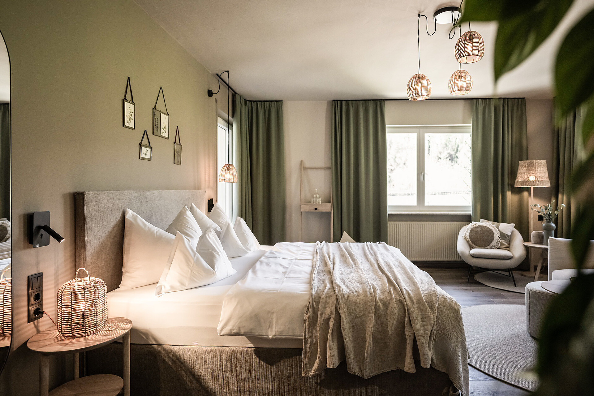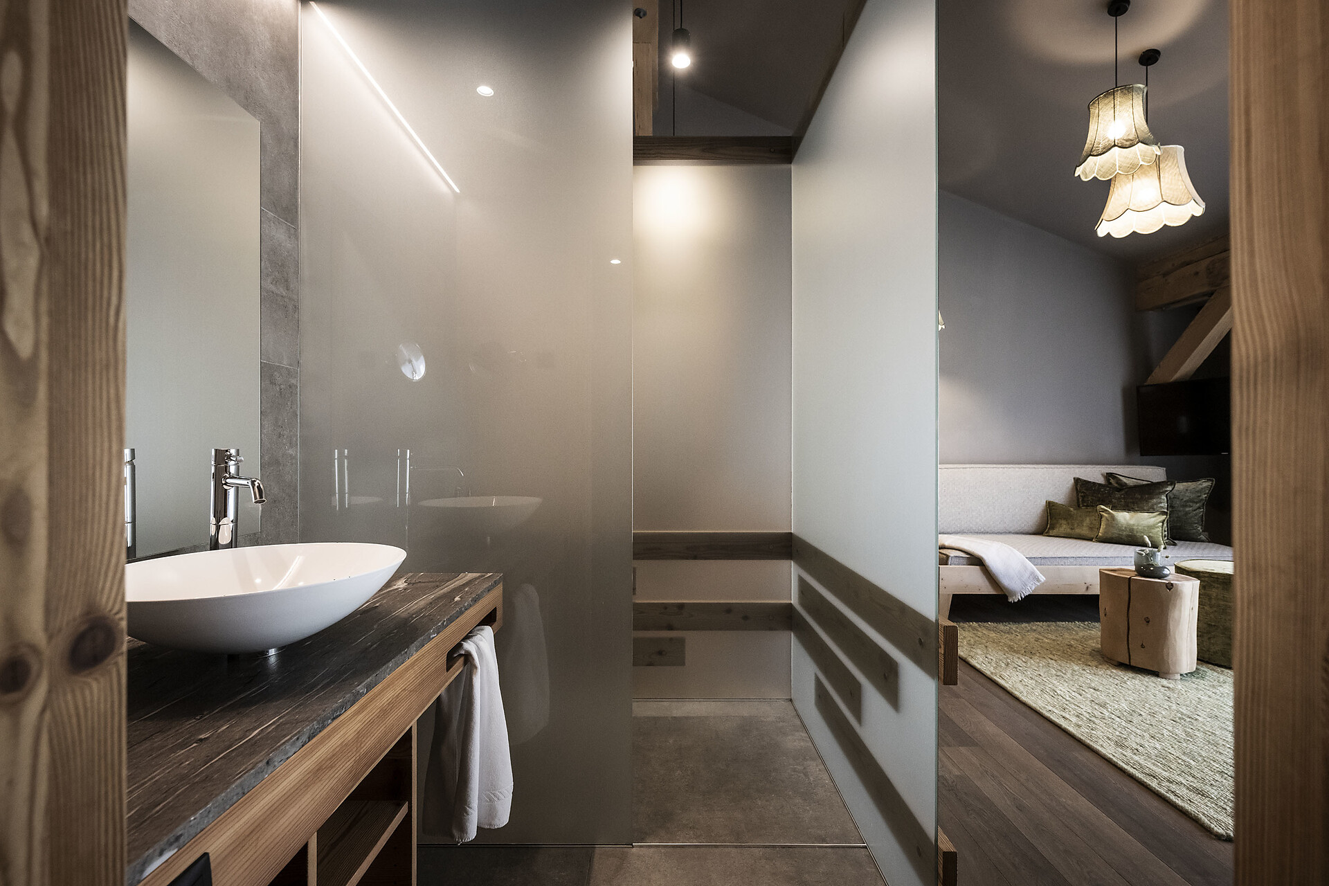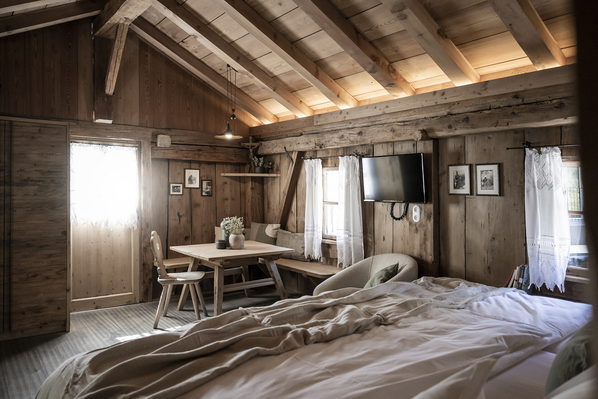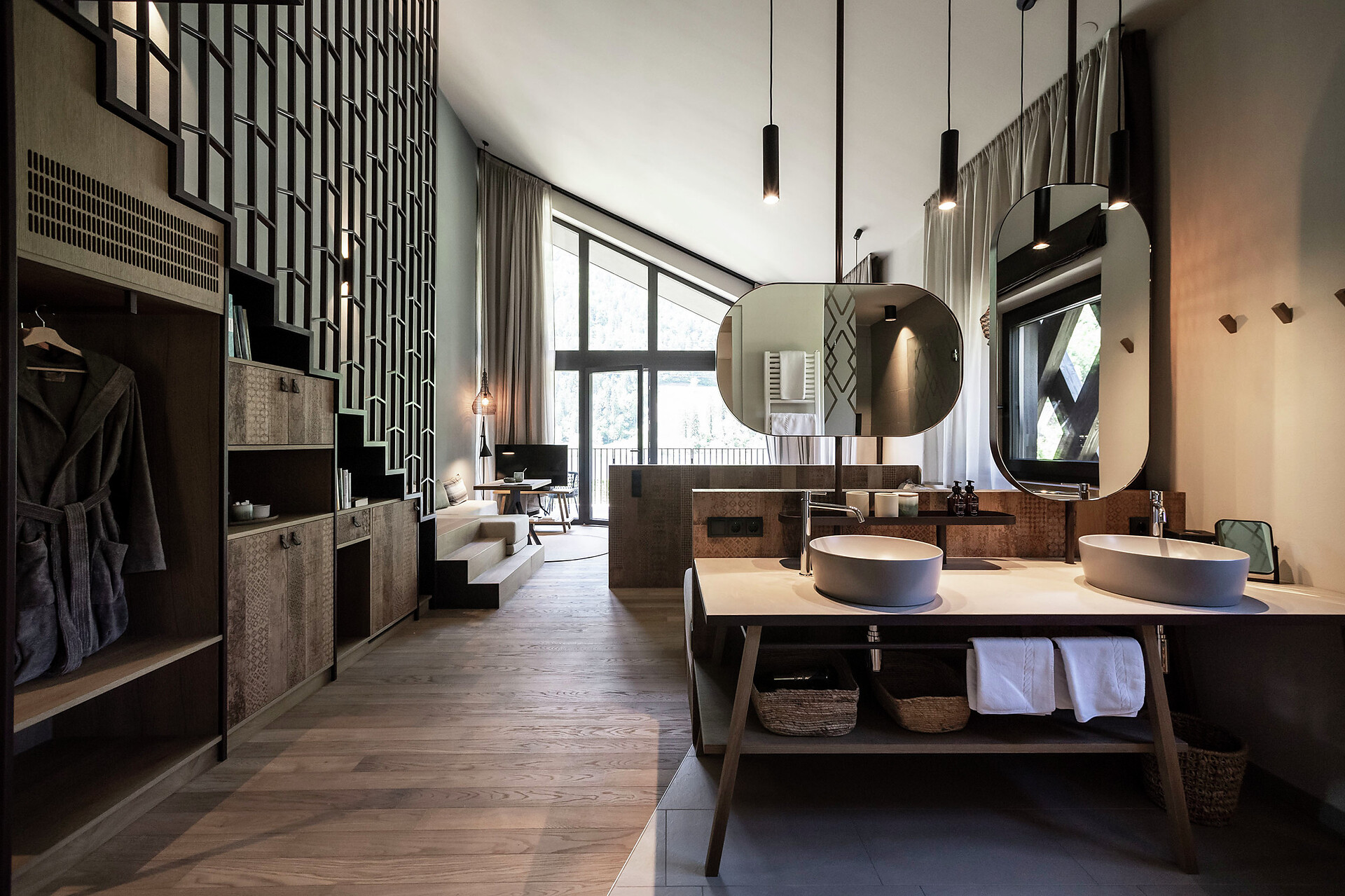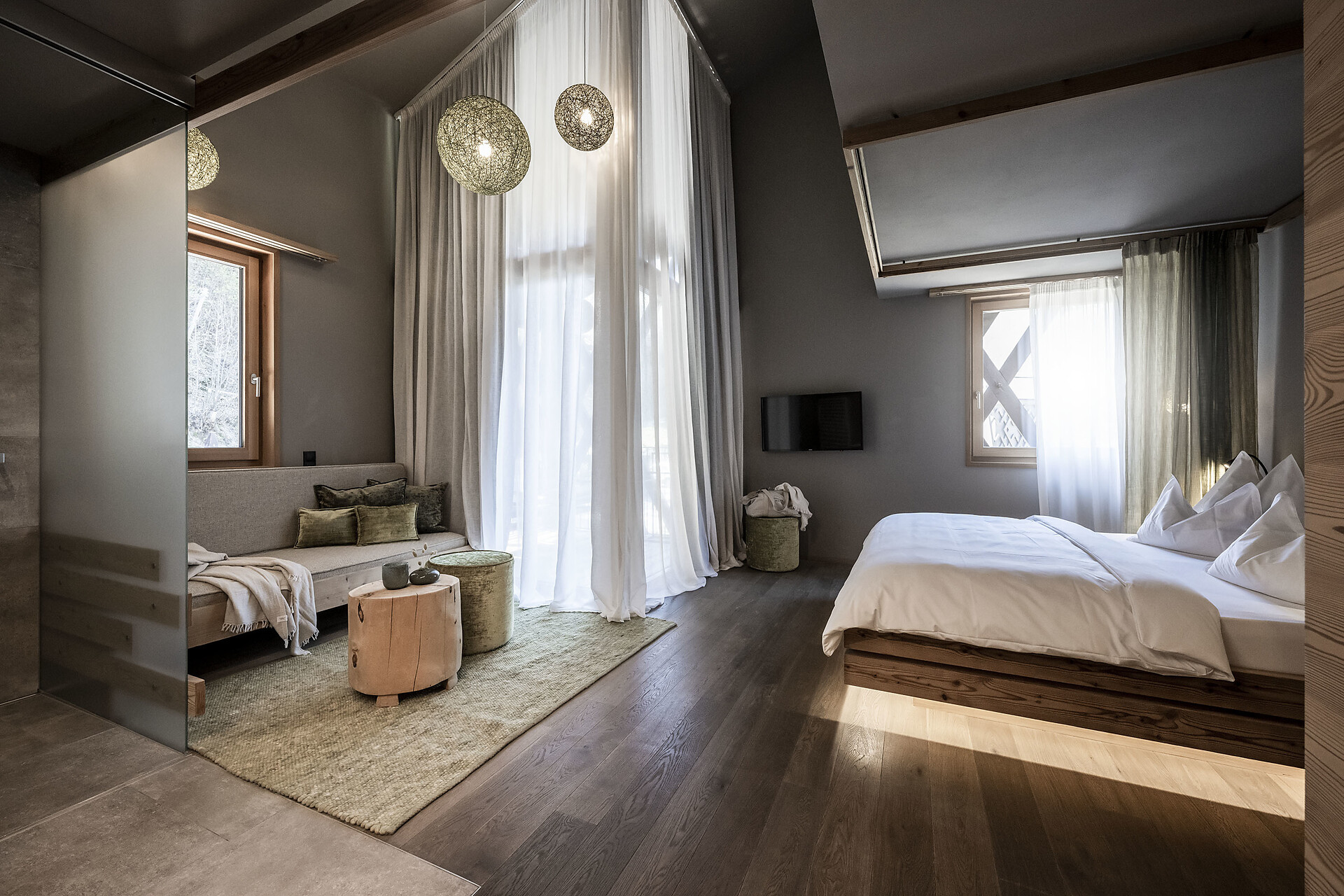The solid wood paneling exudes intimacy and romance. The balcony overlooks directly onto our garden. With a panoramic shower, corner bathtub and panoramic windows, you can enjoy every moment together.