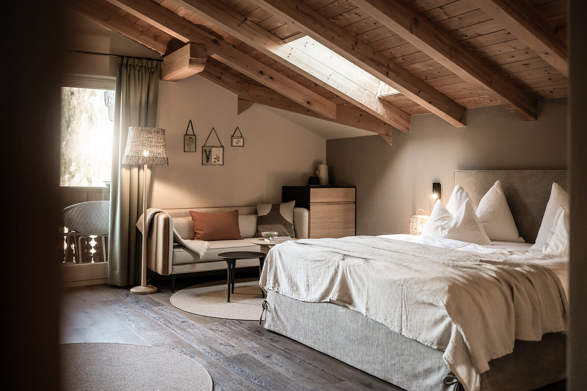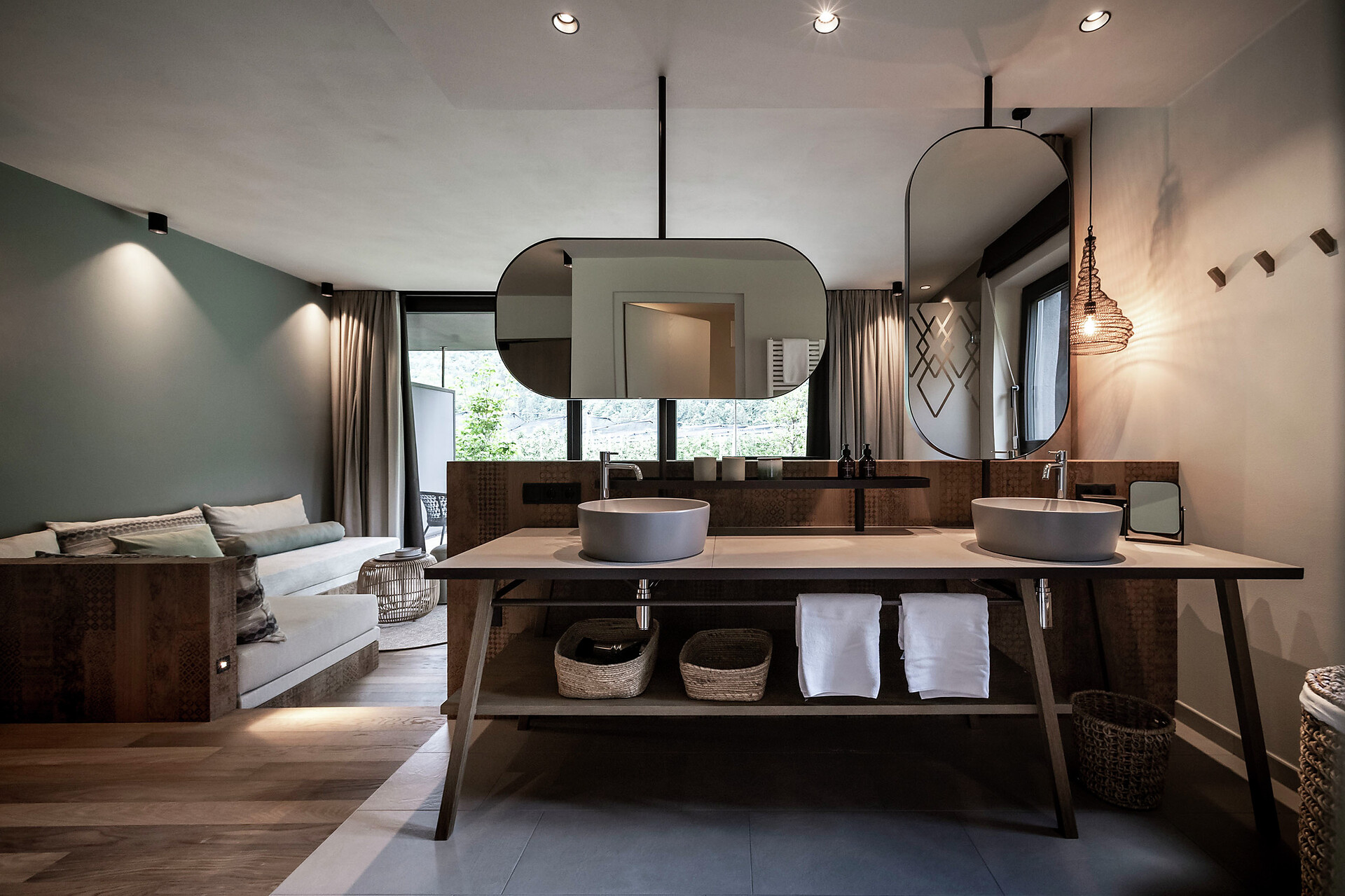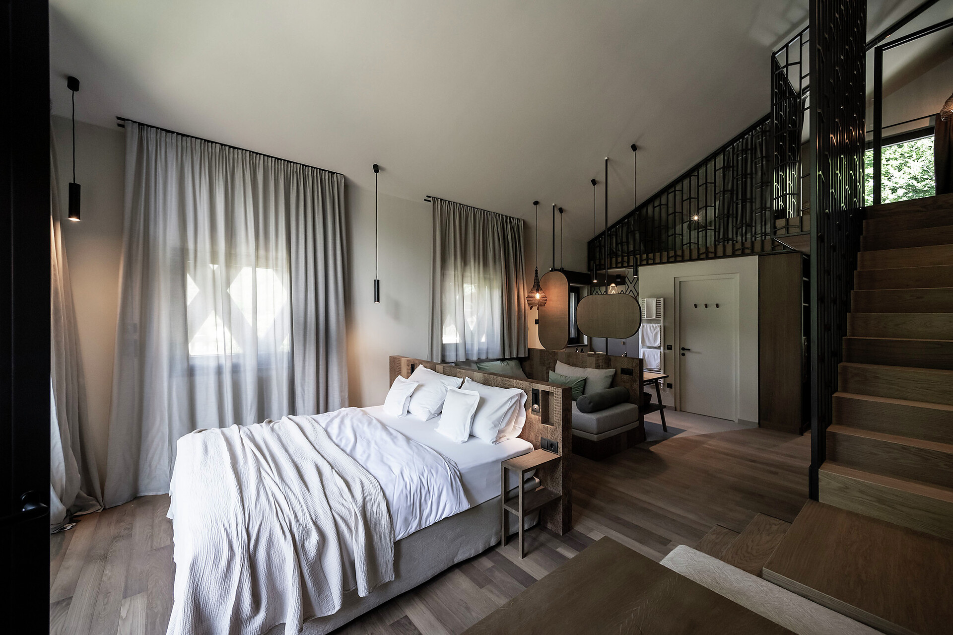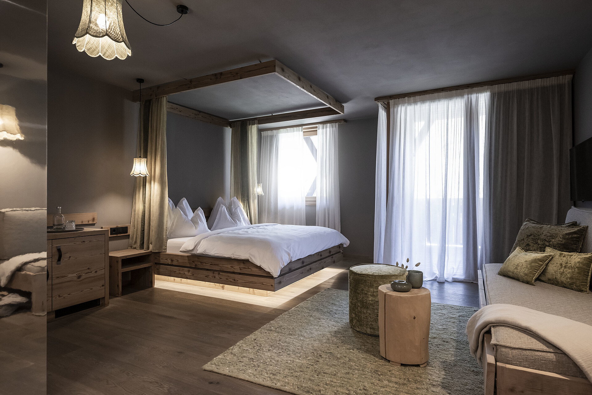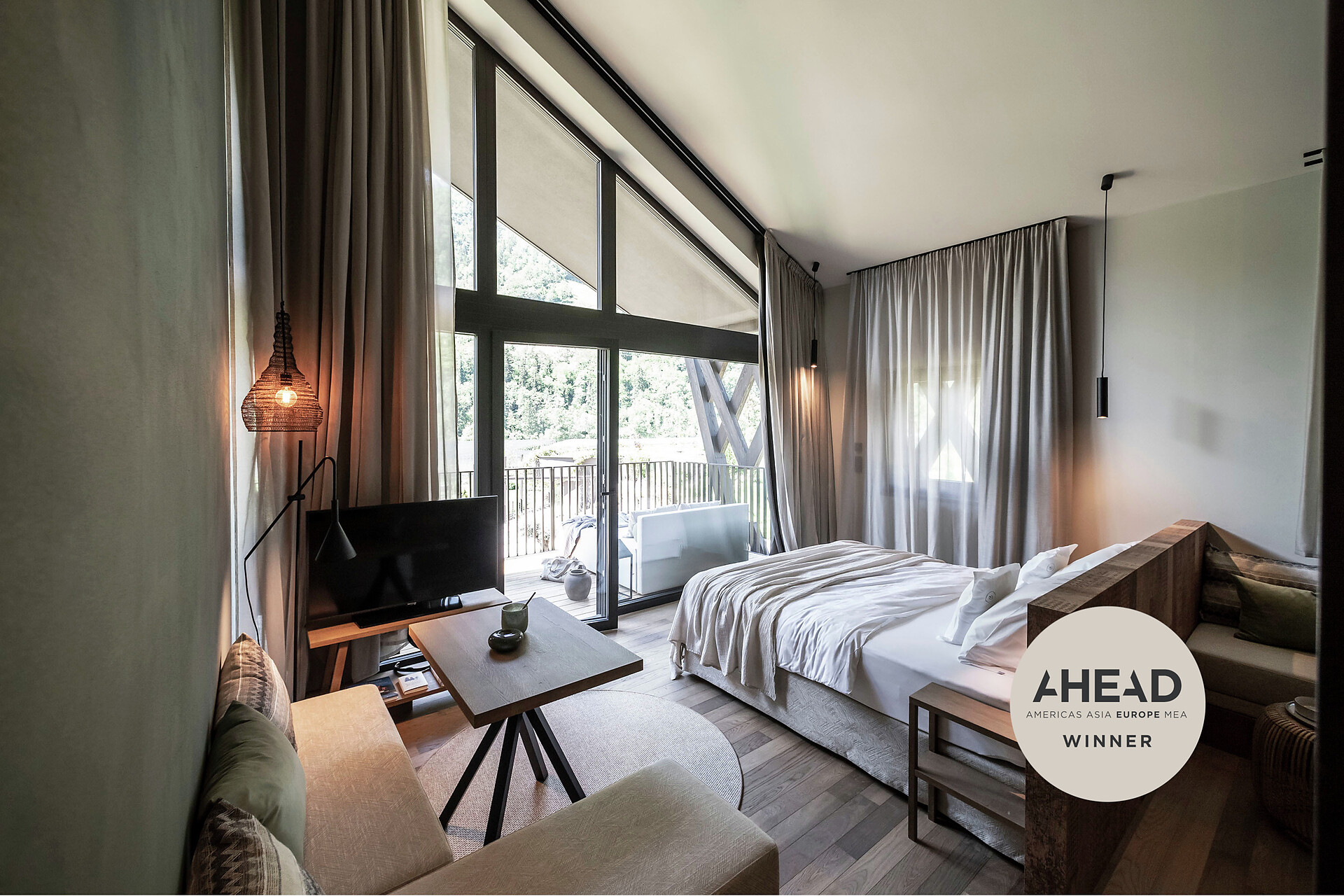 The solid wood paneling exudes intimacy and romance. The balcony overlooks directly onto our garden. With a panoramic shower, corner bathtub and panoramic windows, you can enjoy every moment together.