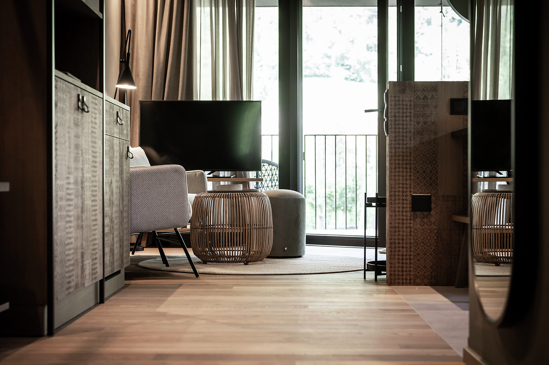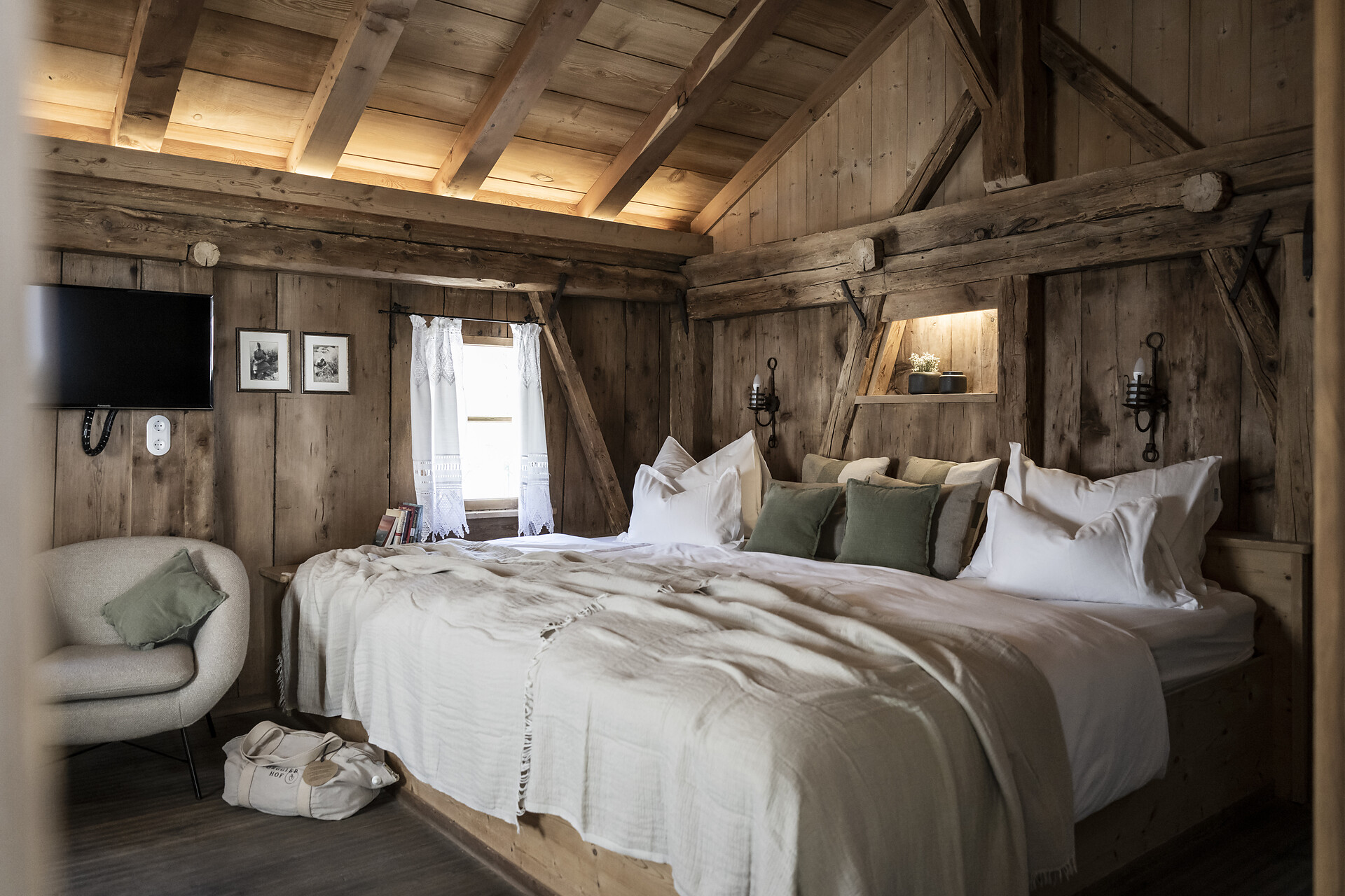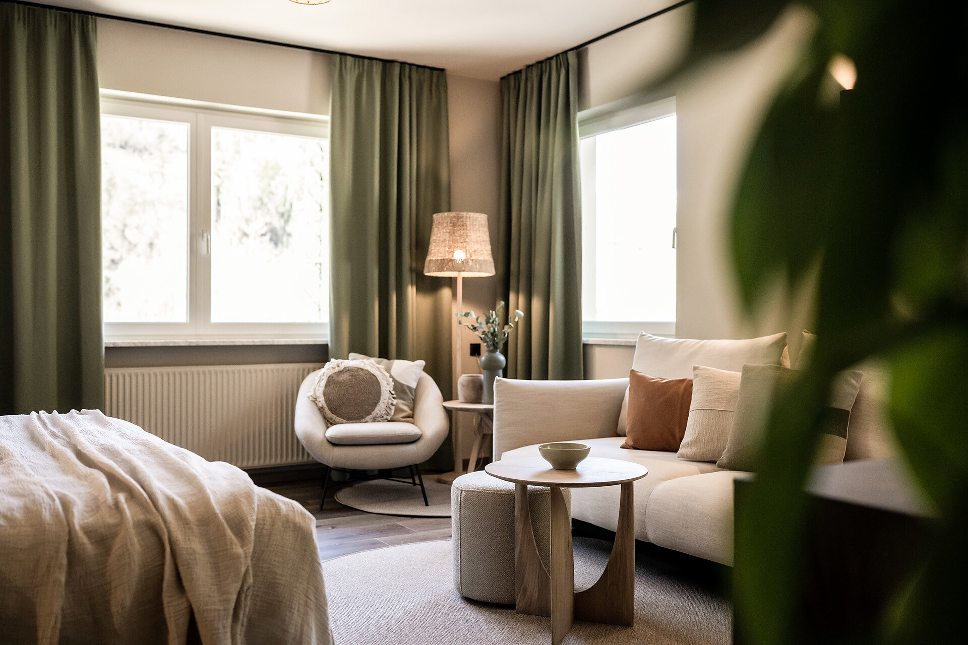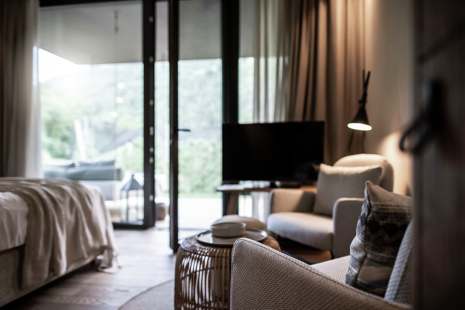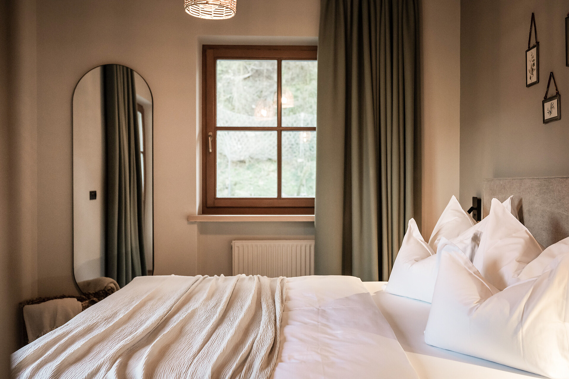The solid wood paneling exudes intimacy and romance. The balcony overlooks directly onto our garden. With a panoramic shower, corner bathtub and panoramic windows, you can enjoy every moment together.