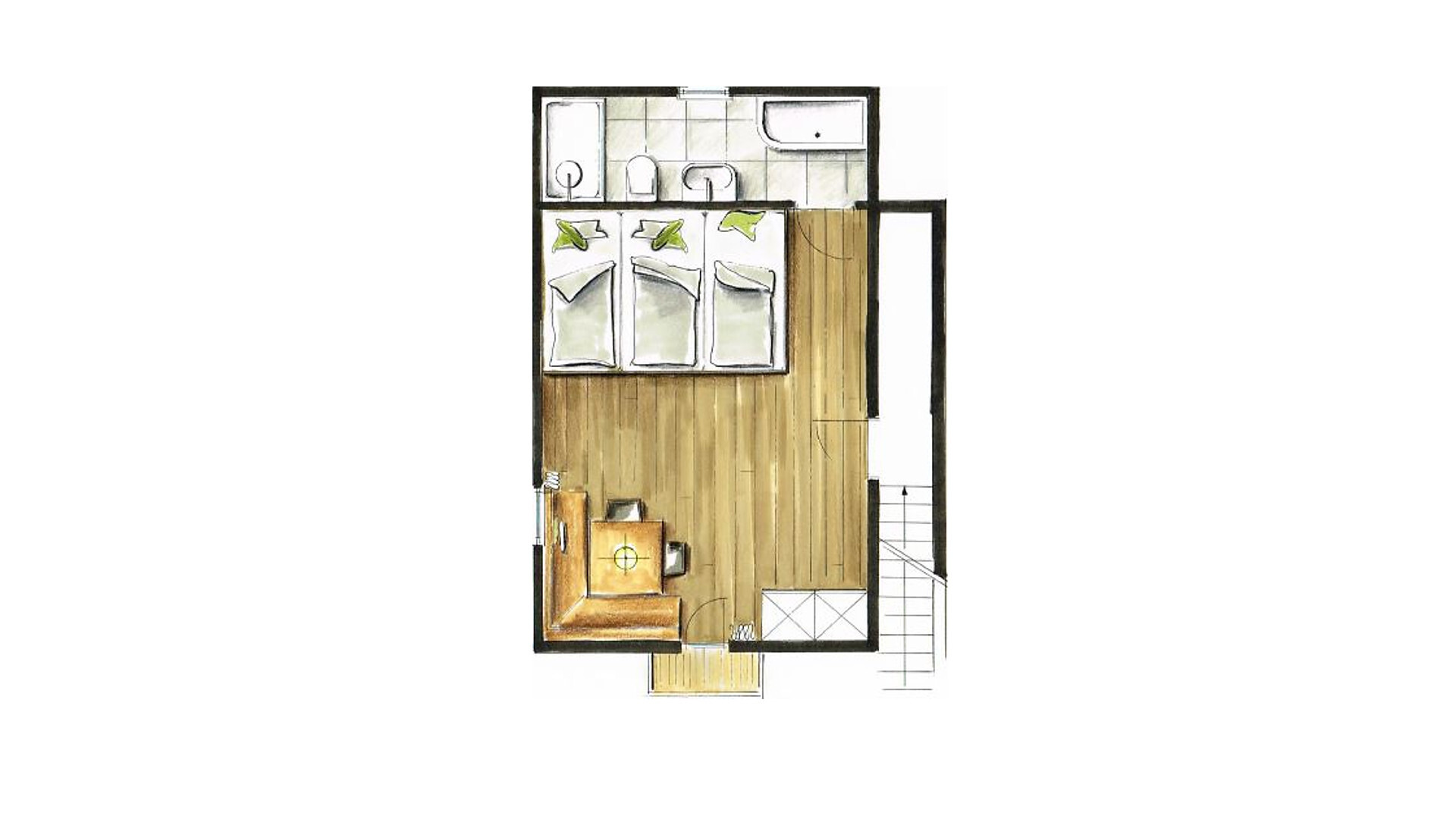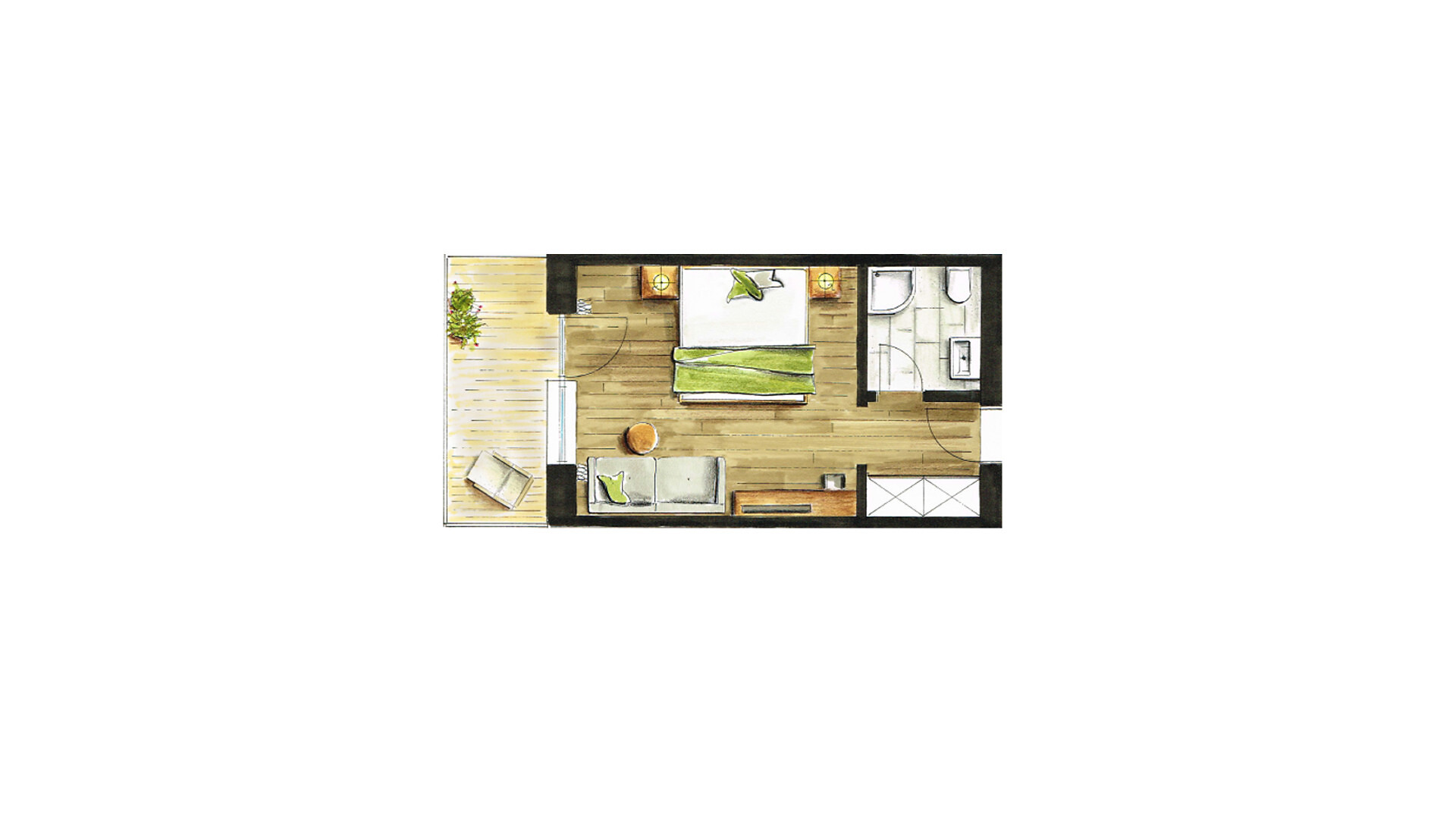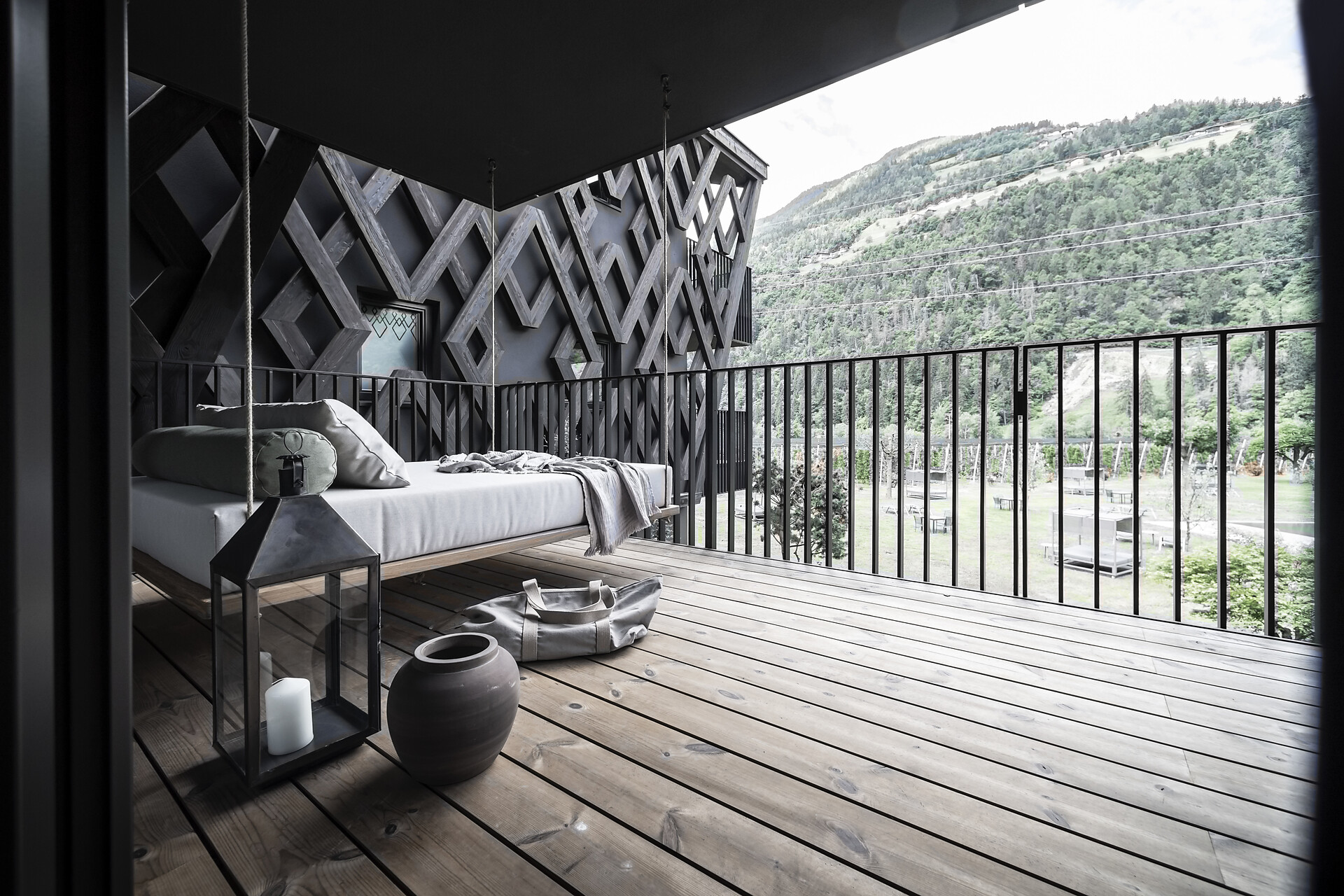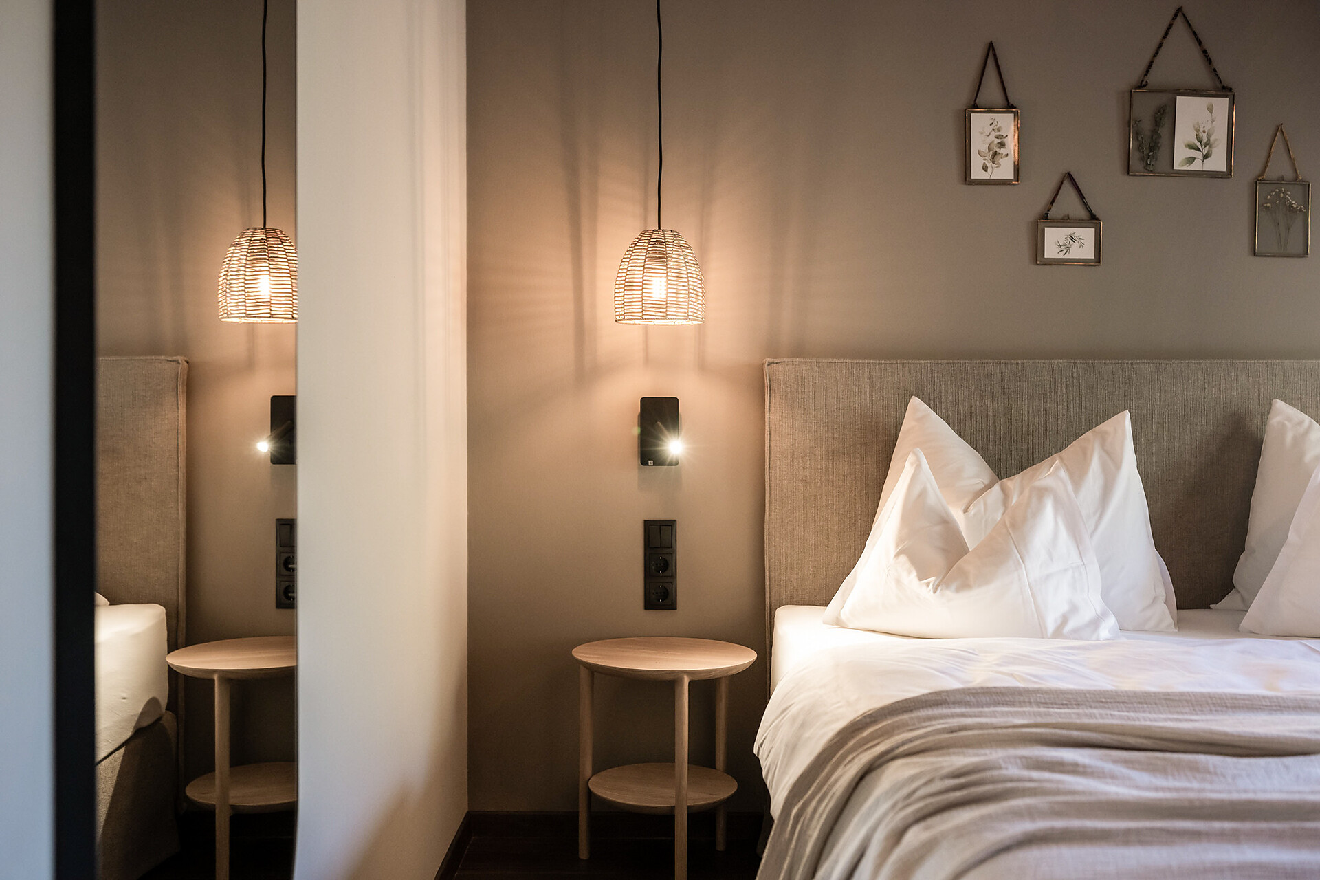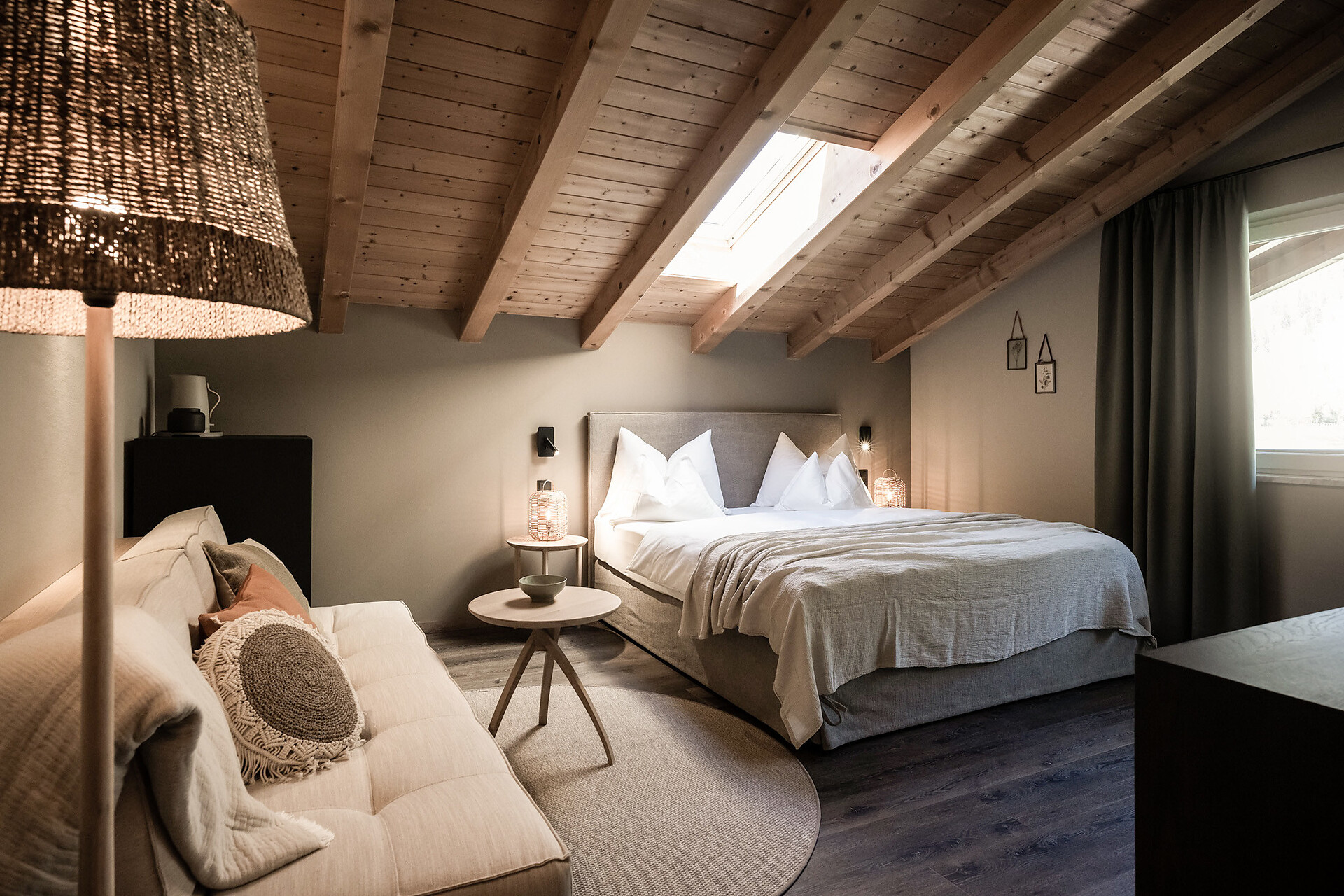 The solid wood paneling exudes intimacy and romance. The balcony overlooks directly onto our garden. With a panoramic shower, corner bathtub and panoramic windows, you can enjoy every moment together.