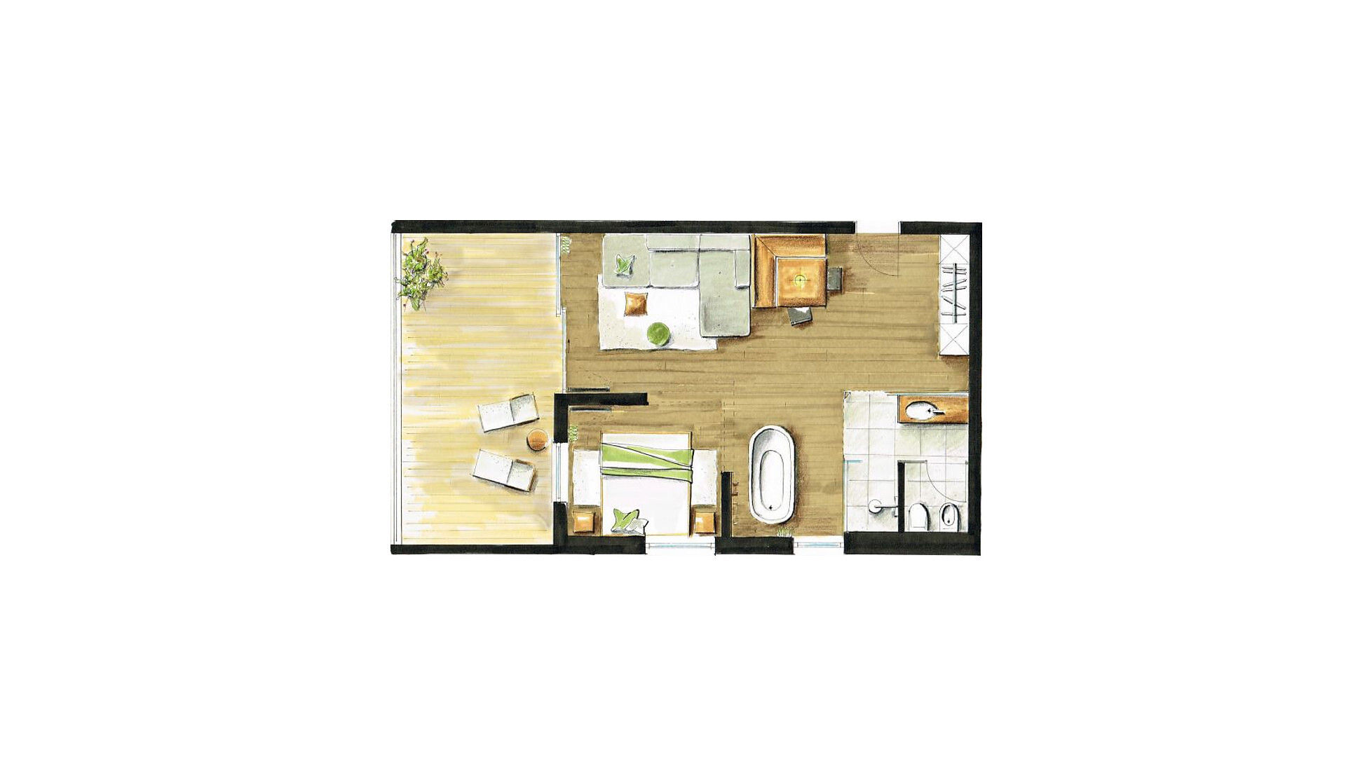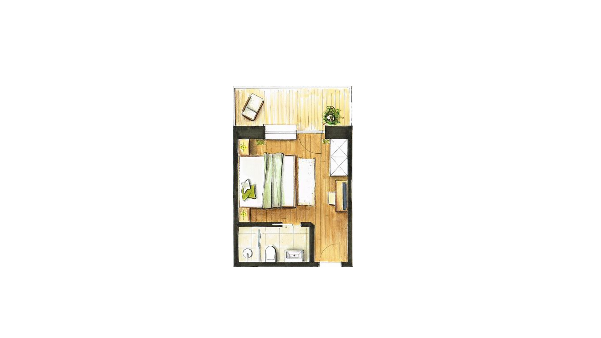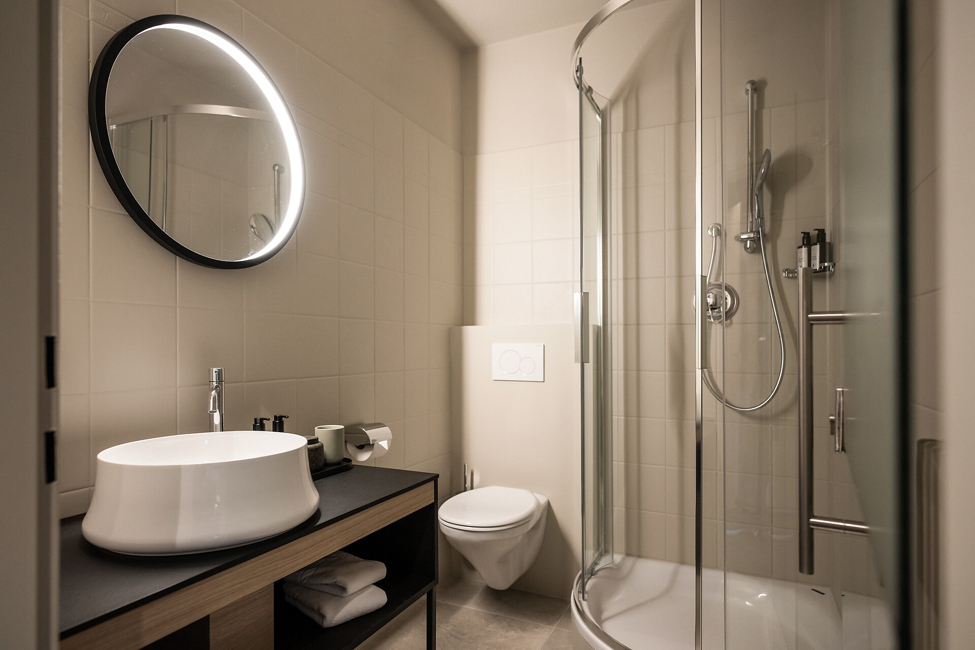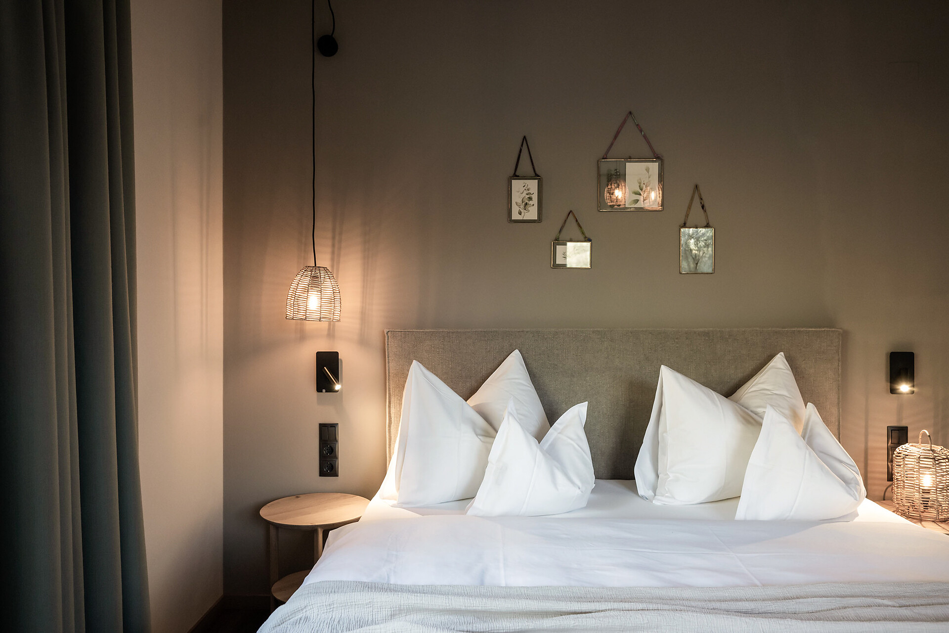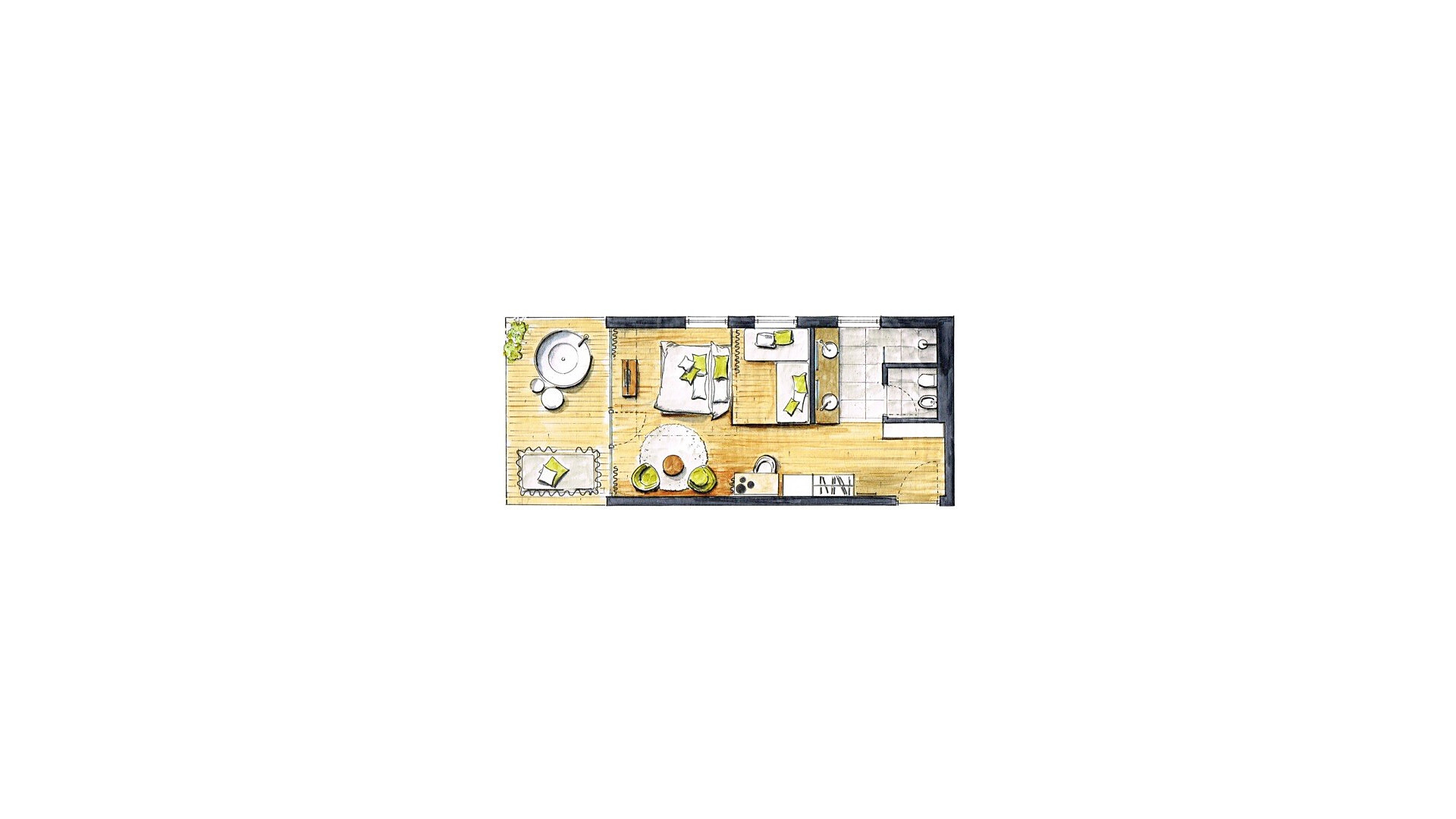 The solid wood paneling exudes intimacy and romance. The balcony overlooks directly onto our garden. With a panoramic shower, corner bathtub and panoramic windows, you can enjoy every moment together.