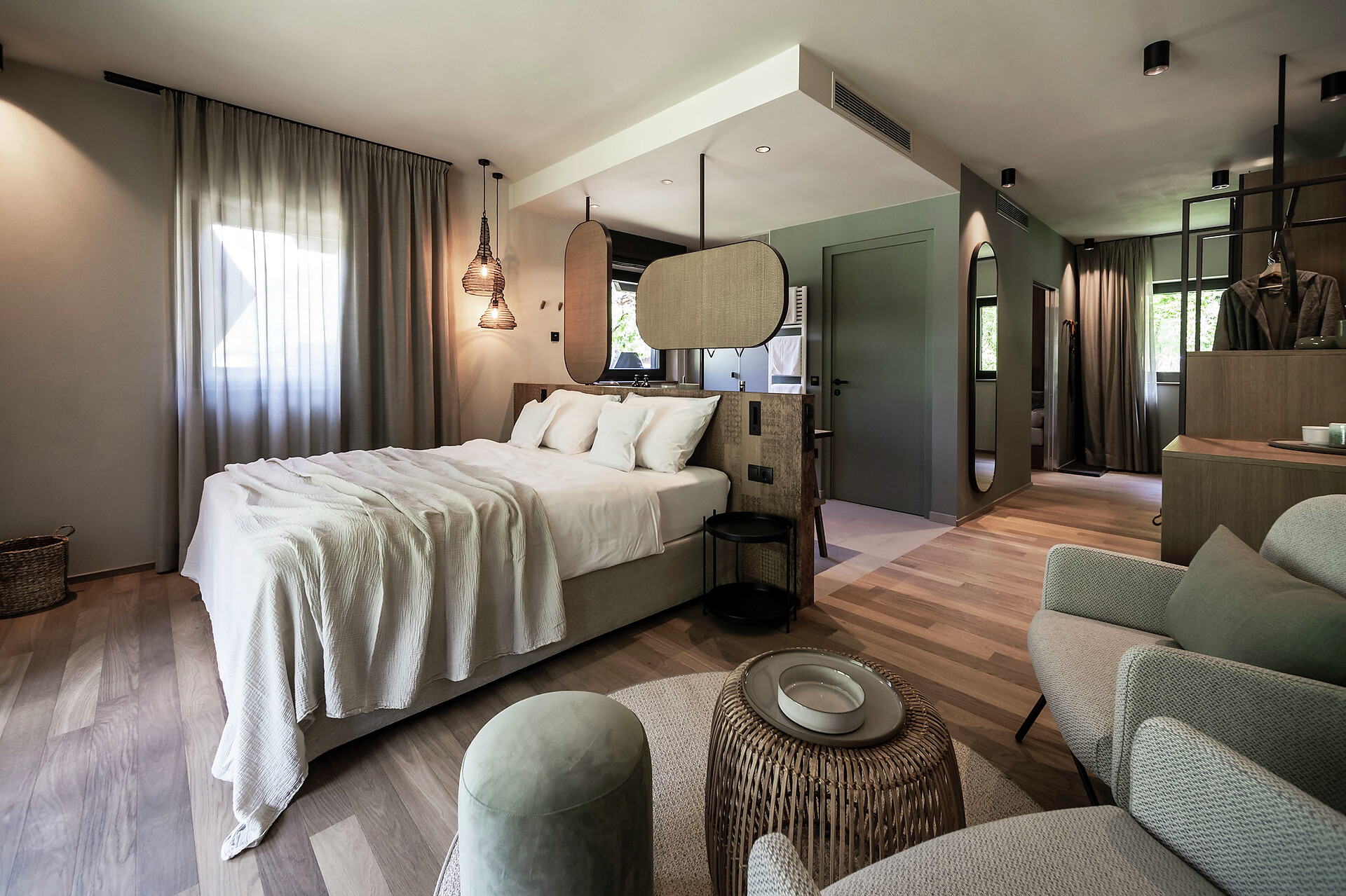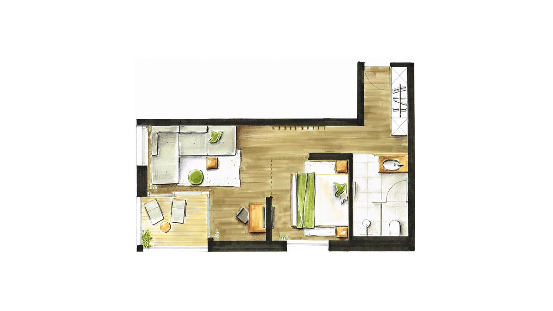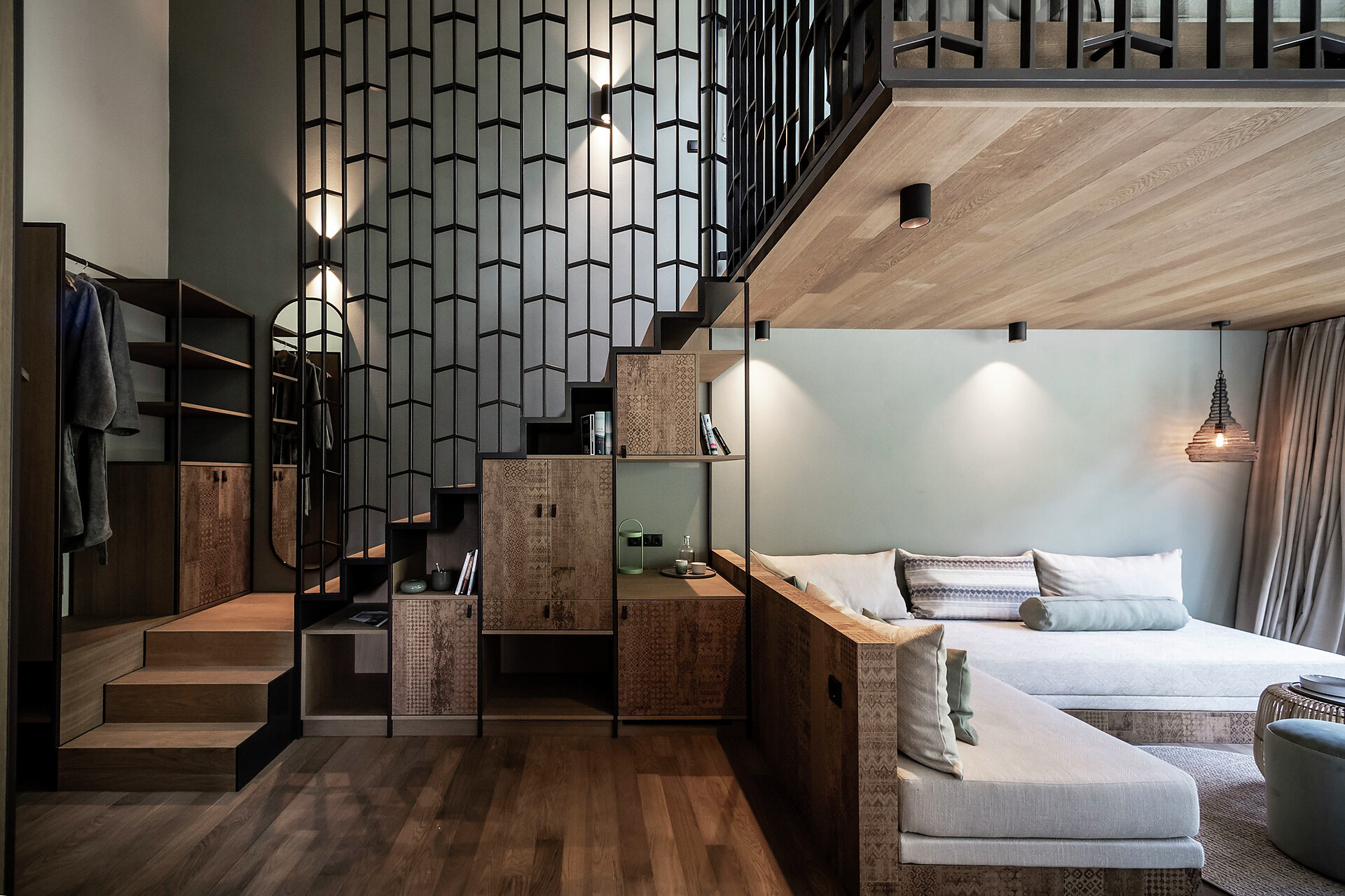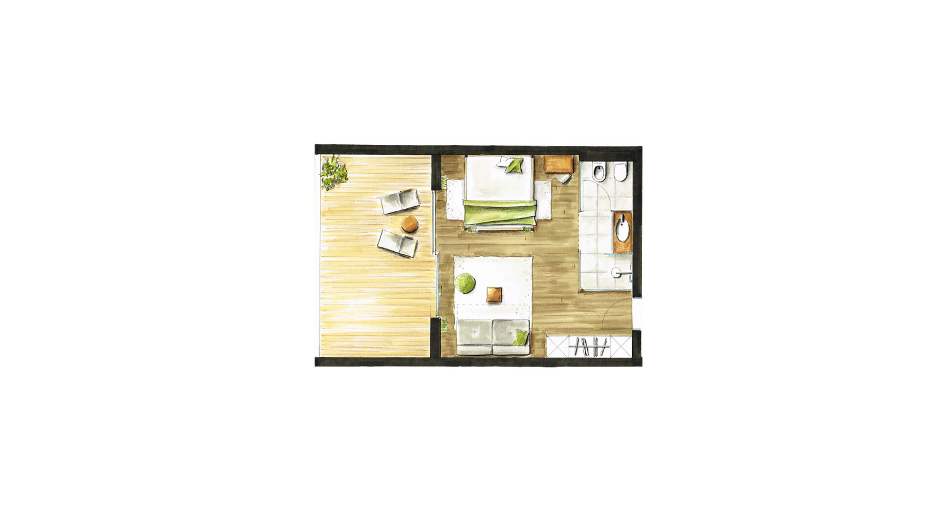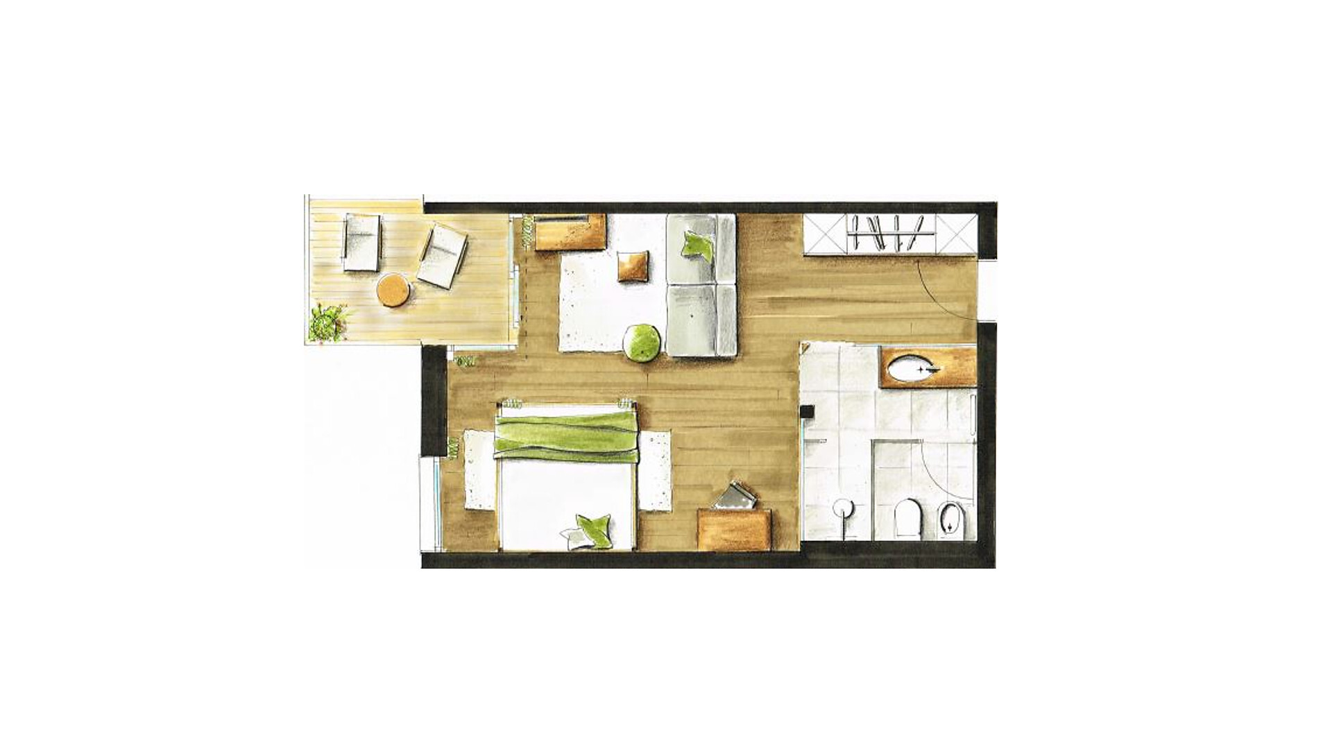 The solid wood paneling exudes intimacy and romance. The balcony overlooks directly onto our garden. With a panoramic shower, corner bathtub and panoramic windows, you can enjoy every moment together.
