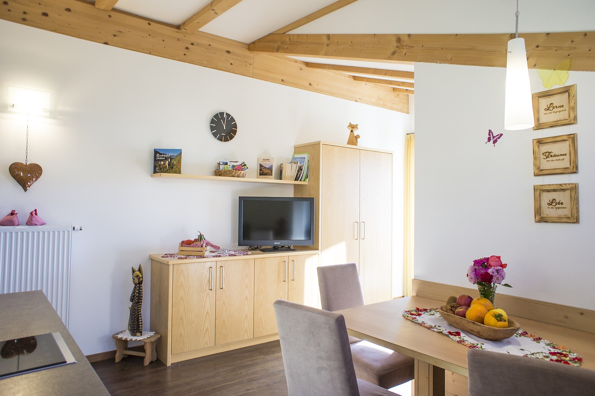 Another very spacious attic apartment with two balconies; 3 separate rooms with connecting doors (bedroom, bathroom, eat-in kitchen). The apartments are furnished with natural wood furniture and have a unique panoramic view. Bed linen and towels as well as all kitchen and household equipment are provided. An additional double room with its own bathroom/WC/panoramic balcony/safe/SAT-TV/WLAN can be rented in addition to all apartments.