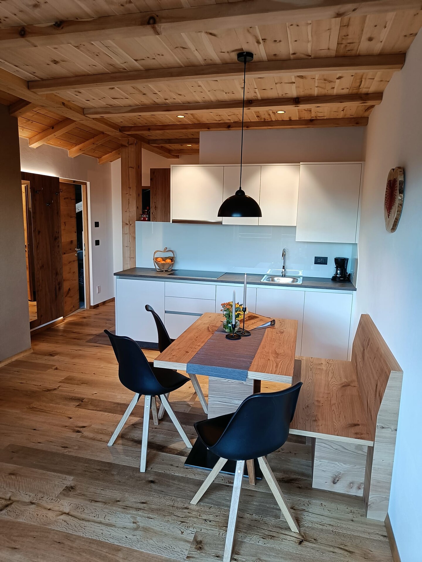 Spacious apartment with kitchen-living room and 2 bedrooms. Furnished in solid wood elm and Swiss pine, Swiss pine beds. Natural materials such as clay plaster with straw and lime. Large balcony with wonderful view of the Brenta group.