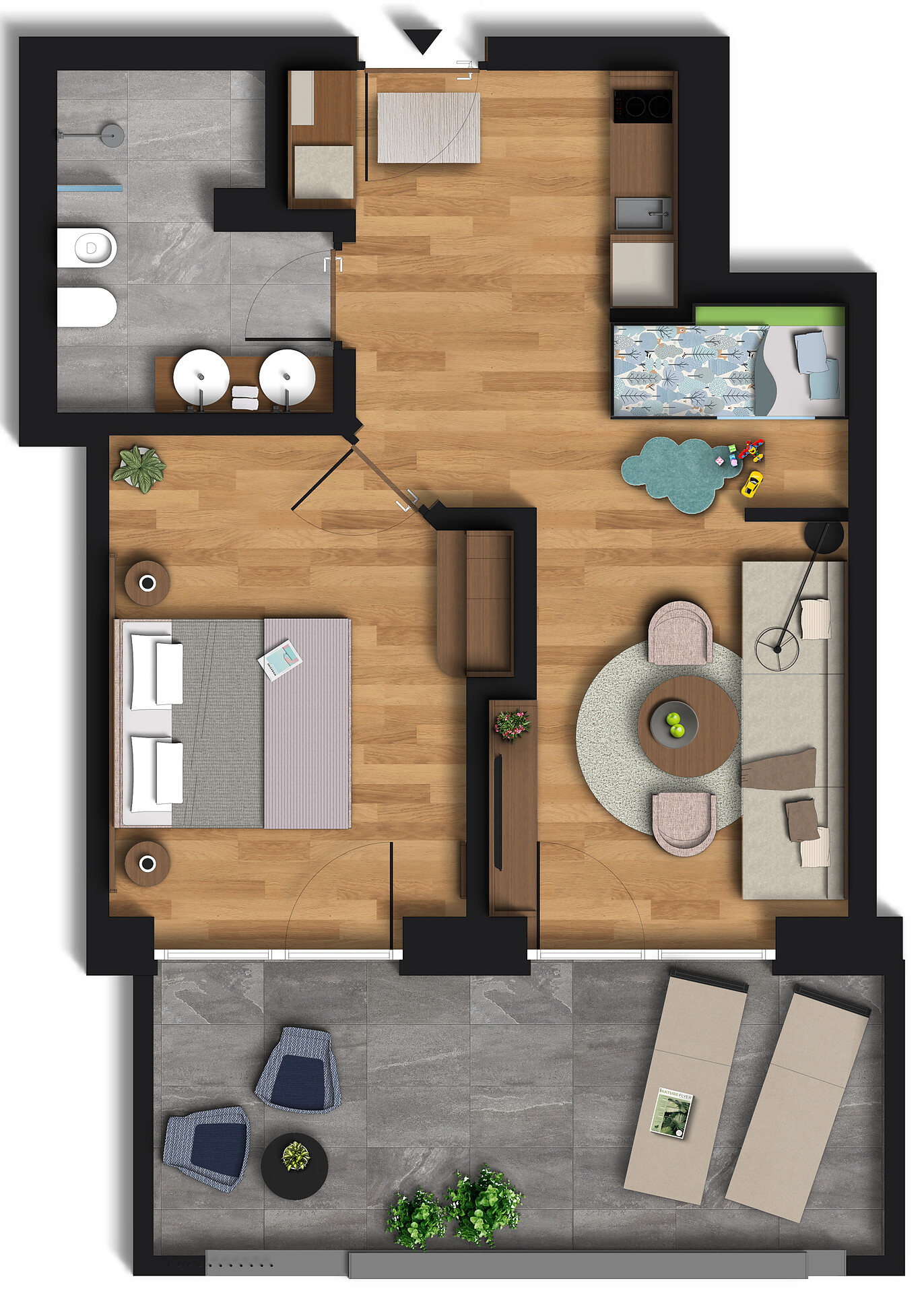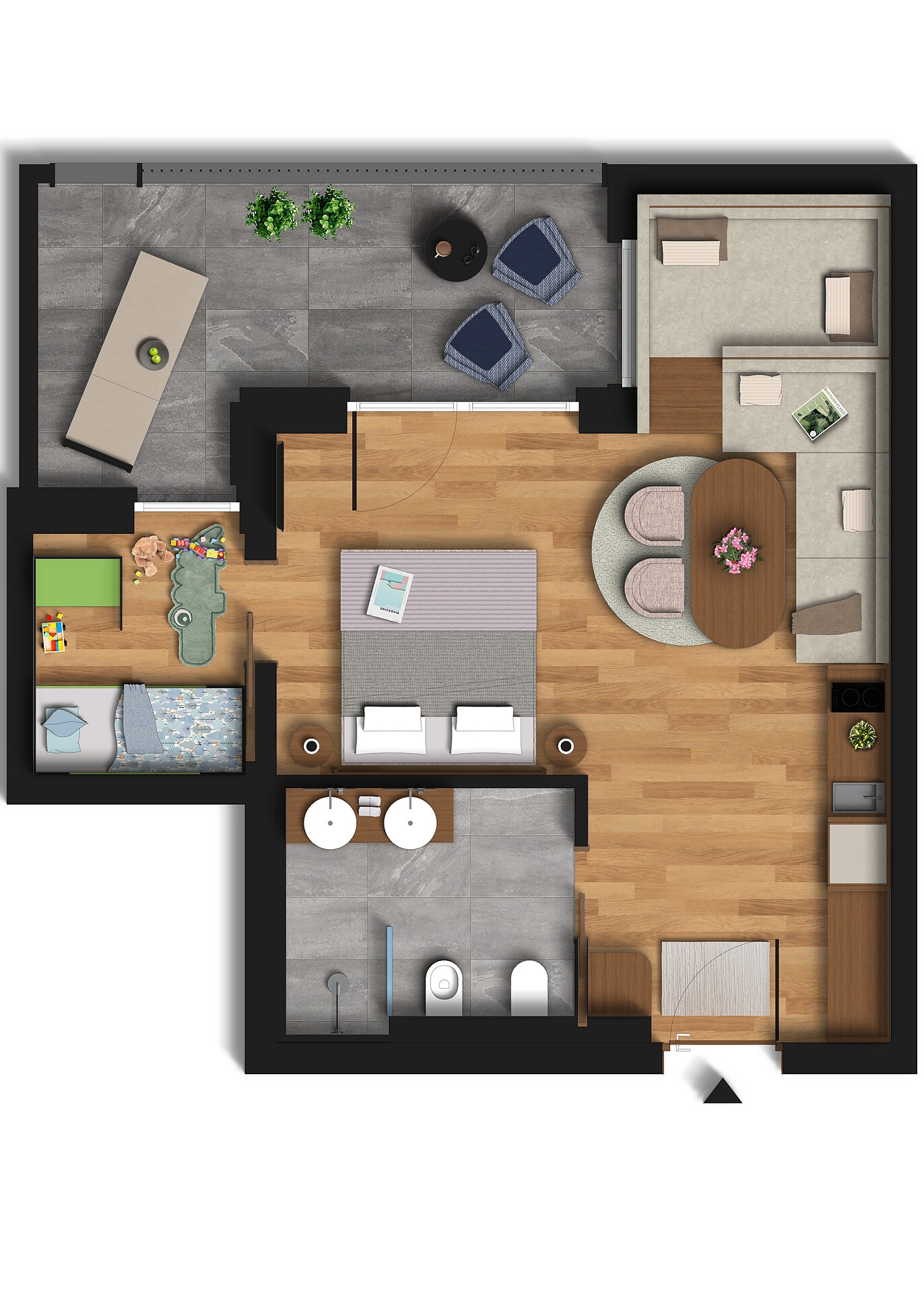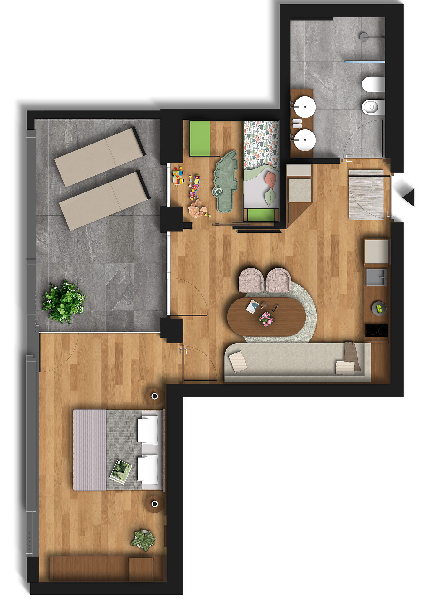 Kitchen with dining area and table, microwave with oven function, Nespresso machine, kettle, dishwasher, sofa, safe, 1 satellite TV, free Wi-Fi, bathrobes, towels, wellness bag with bath towels, 2 bathrooms with shower, toilet, bidet, children’s sink, hairdryer, bedroom with double bed, bedroom with 2 beds, spacious balcony with hot tub and sun loungers.