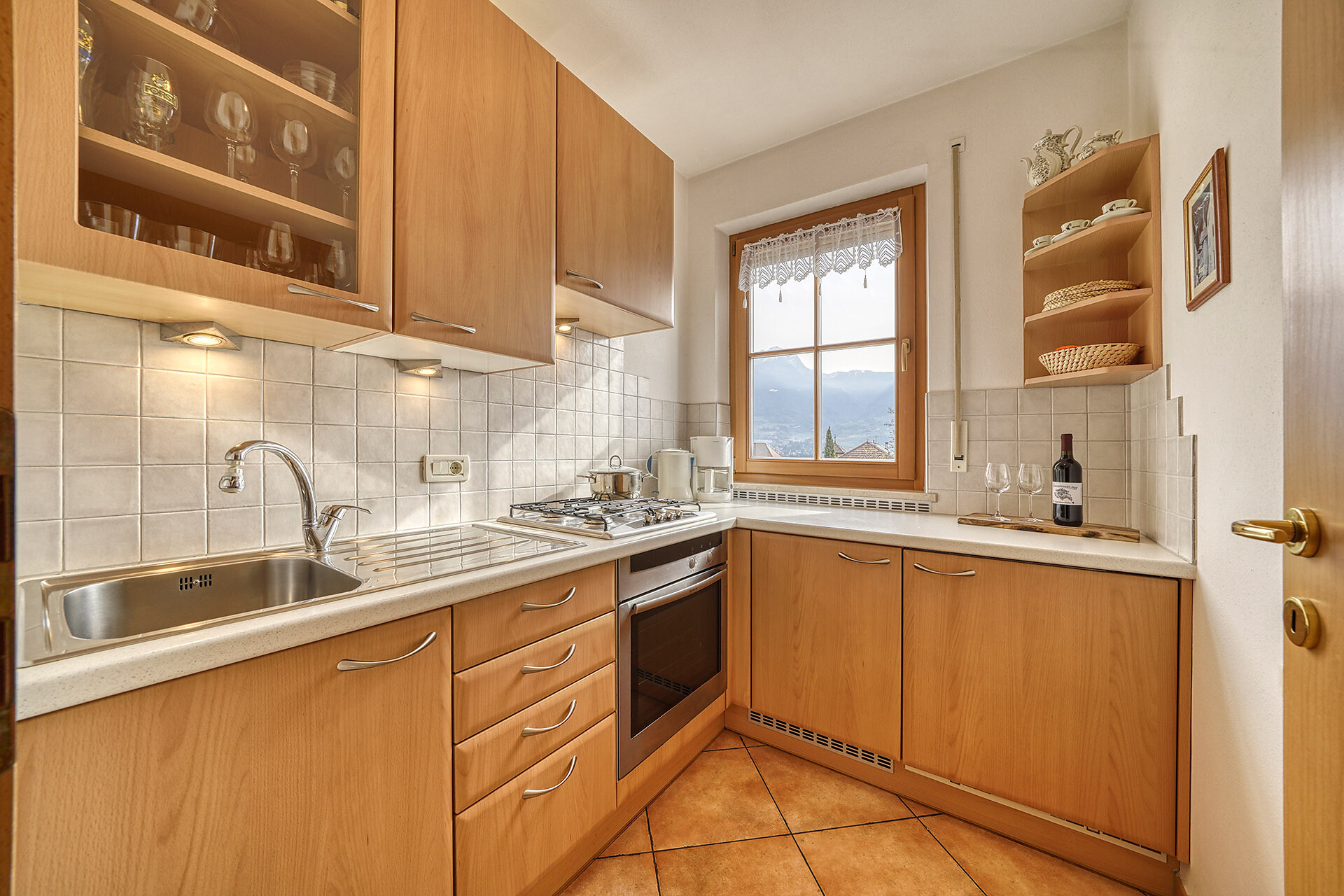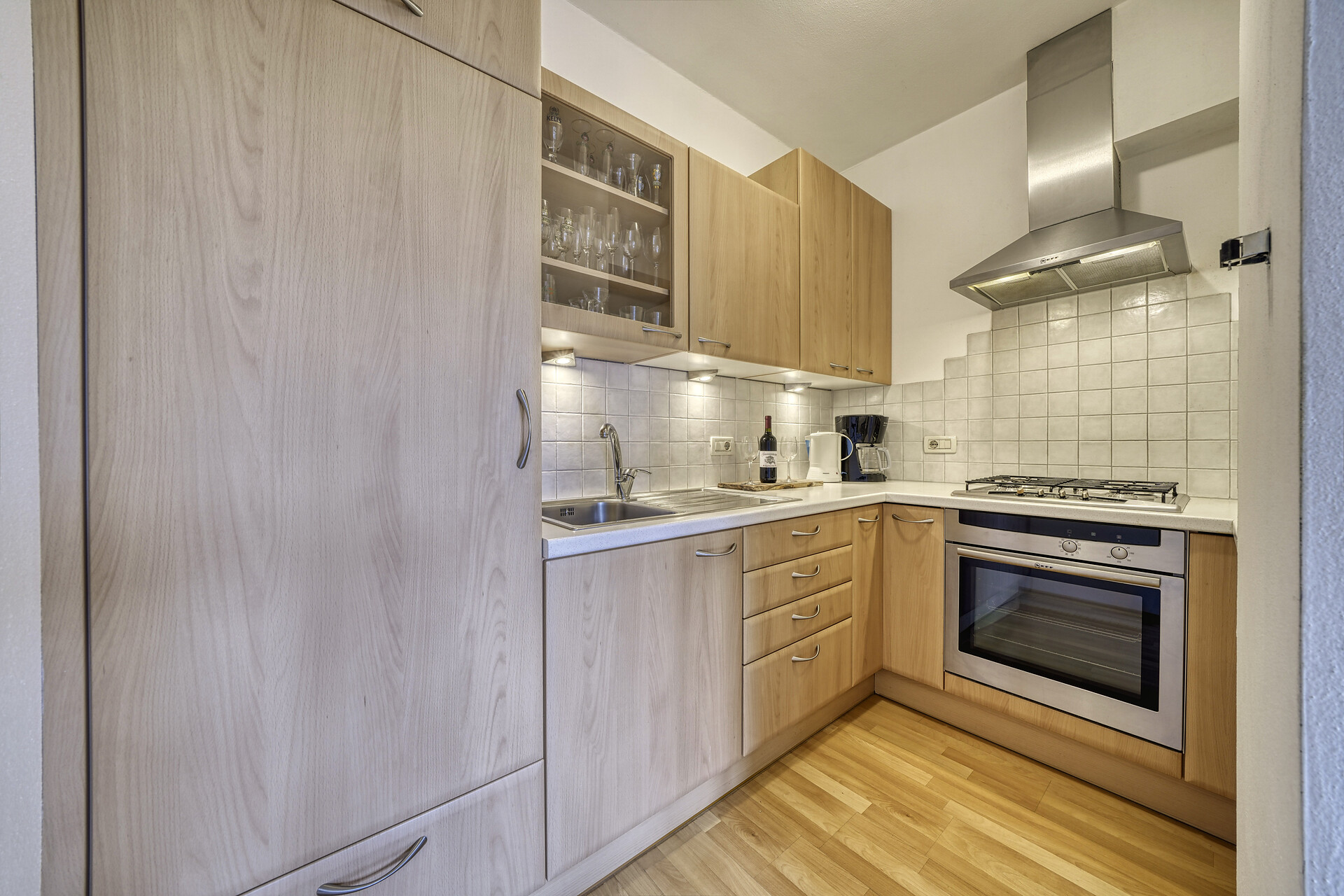 fully equipped kitchen with fridge, cooker, coffee machine and oven,