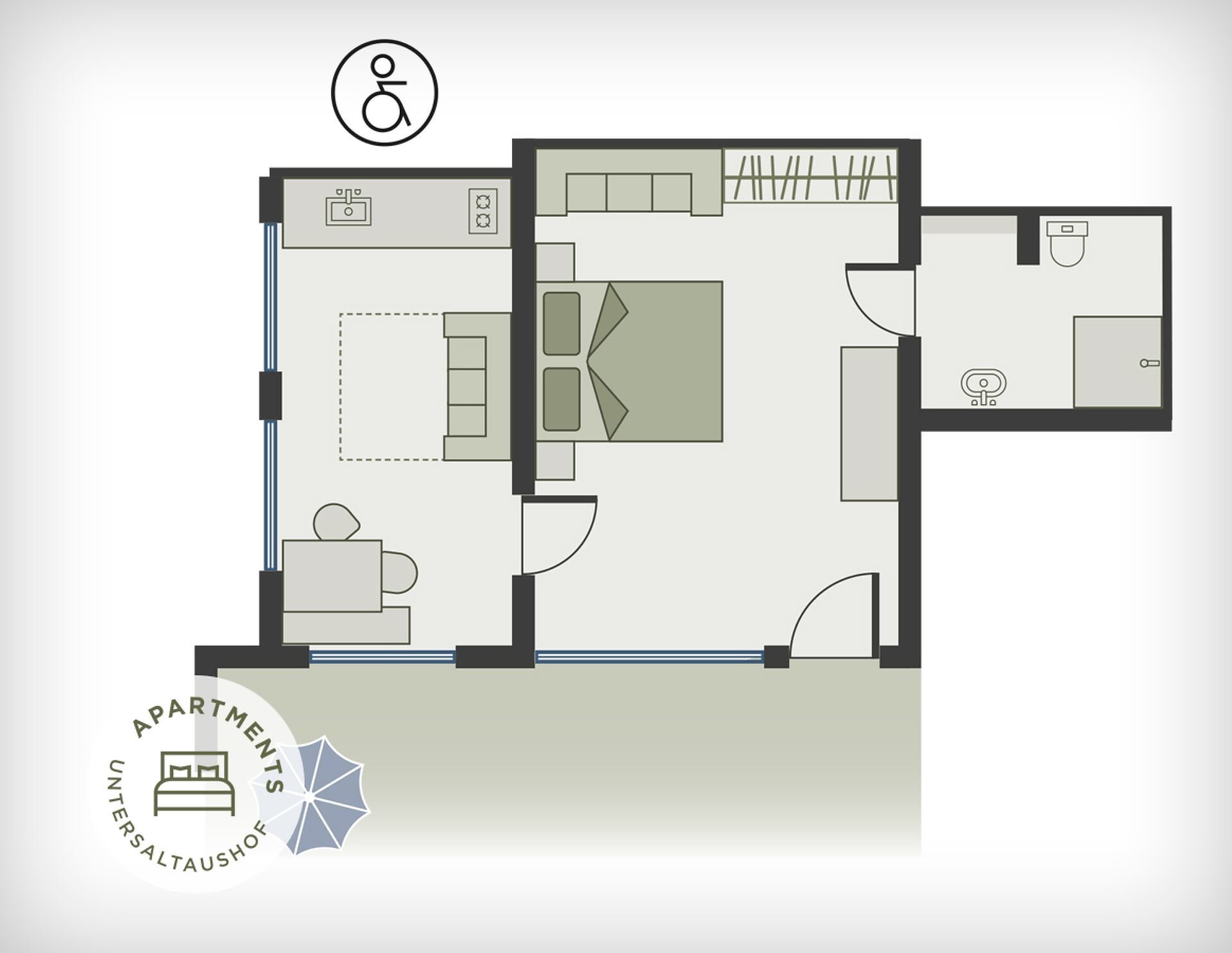 Apartment of 40m², terrace, 1 bedroom, eat-in-kitchen with sofa-bed, sitting area, shower/WC, SAT-TV, at ground level, crockery and kitchenware, dishwasher, safe, hairdryer.1 bedroom, eat-in-kitchen with sofa-bed, sitting area, shower/WC, SAT-TV, at ground level, crockery and kitchenware, dishwasher, safe, hairdryer.