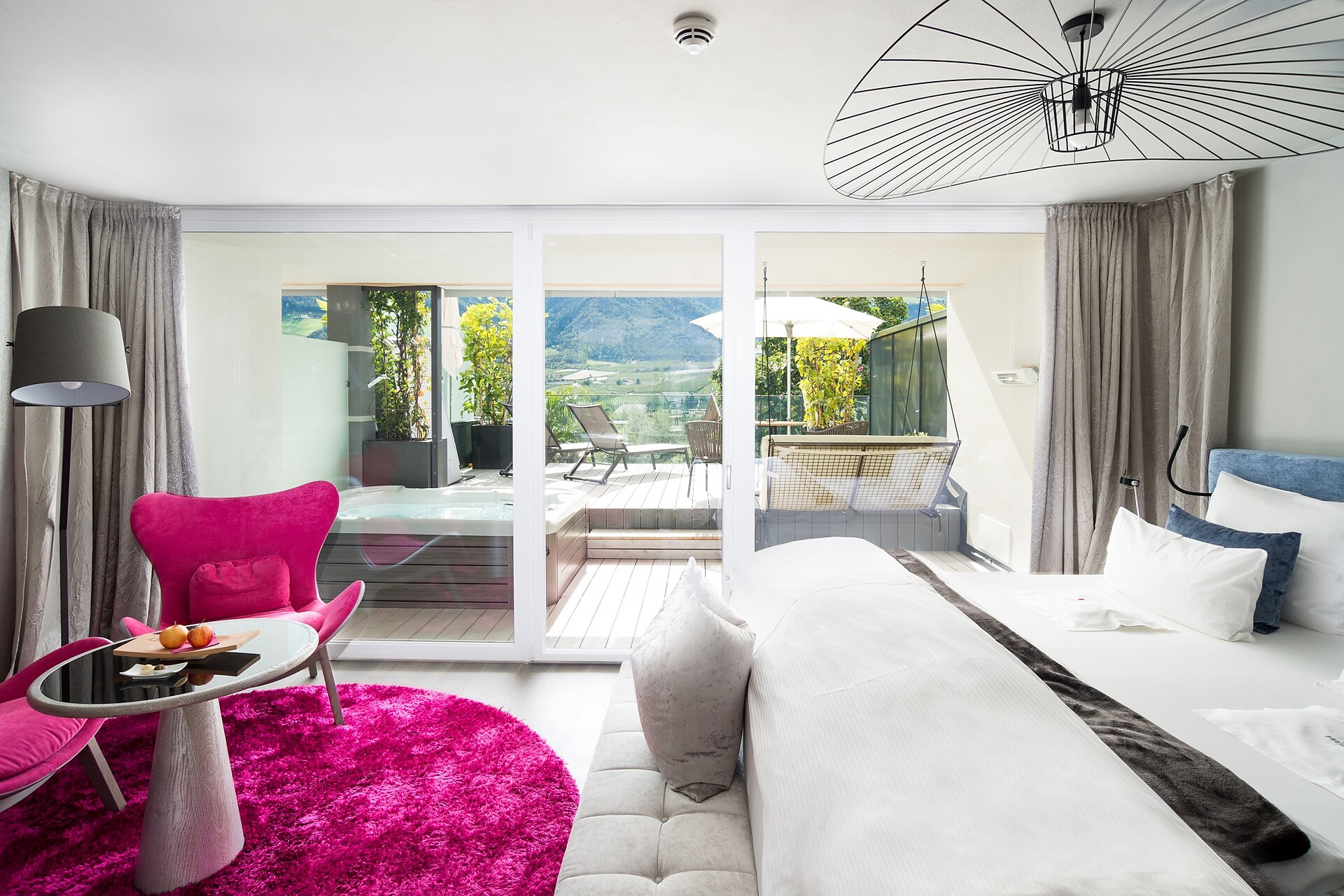 81m² including 31m² outdoor penthouse terrace with panoramic view, whirlpool, private butler service, open-plan living/sleeping lounge with romantic fire, luxury box-spring beds (king size 200x210cm) with Sleep-Fit-Health-System, 2 relaxing designer chairs, 55" Smart-TV with Google Chromecast, suitcase-style bar with wine, Nespresso & tea desk, bathing lounge with designer mirror made of semi-precious stone with lady's beauty desk, multi-sensory shower for two , walk-in, open comfort-professional cabinet area, outdoor penthouse terrace and garden in a private setting, whirlpool de luxe with hygienic-luxury-system, Finnish exterior sauna with multi-sensory shower for two & swing couch for two, outdoor cinema, comfortable seating and dining furinishings, aromatic herbs, radiant warmers and lantern, no animals. In our DolceVita Lodge.