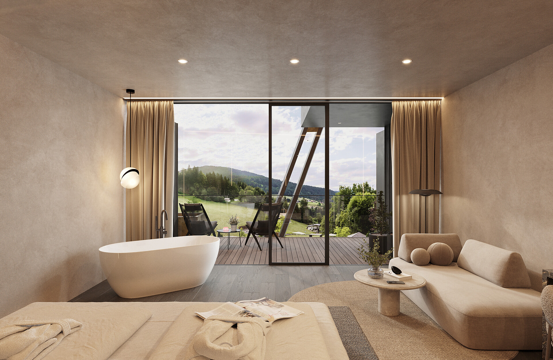 The hotel in Hafling am Tschögglberg offers a relaxed feel-good vacation in the midst of a unique natural landscape. From the external parking lot in front of the main entrance (1 reserved parking space) you can directly reach the elevator (140x110 cm, door width 90 cm). The elevated room is bright and has a balcony with a view and a comfortable bathroom. The dining room, lounge, terrace, spa area and toilets are barrier-free. The indoor pool, fitness and sauna area as well as the park with natural bathing pond, outdoor sauna and whirlpool are accessible via an internal staircase or an external access path via the parking lot area.