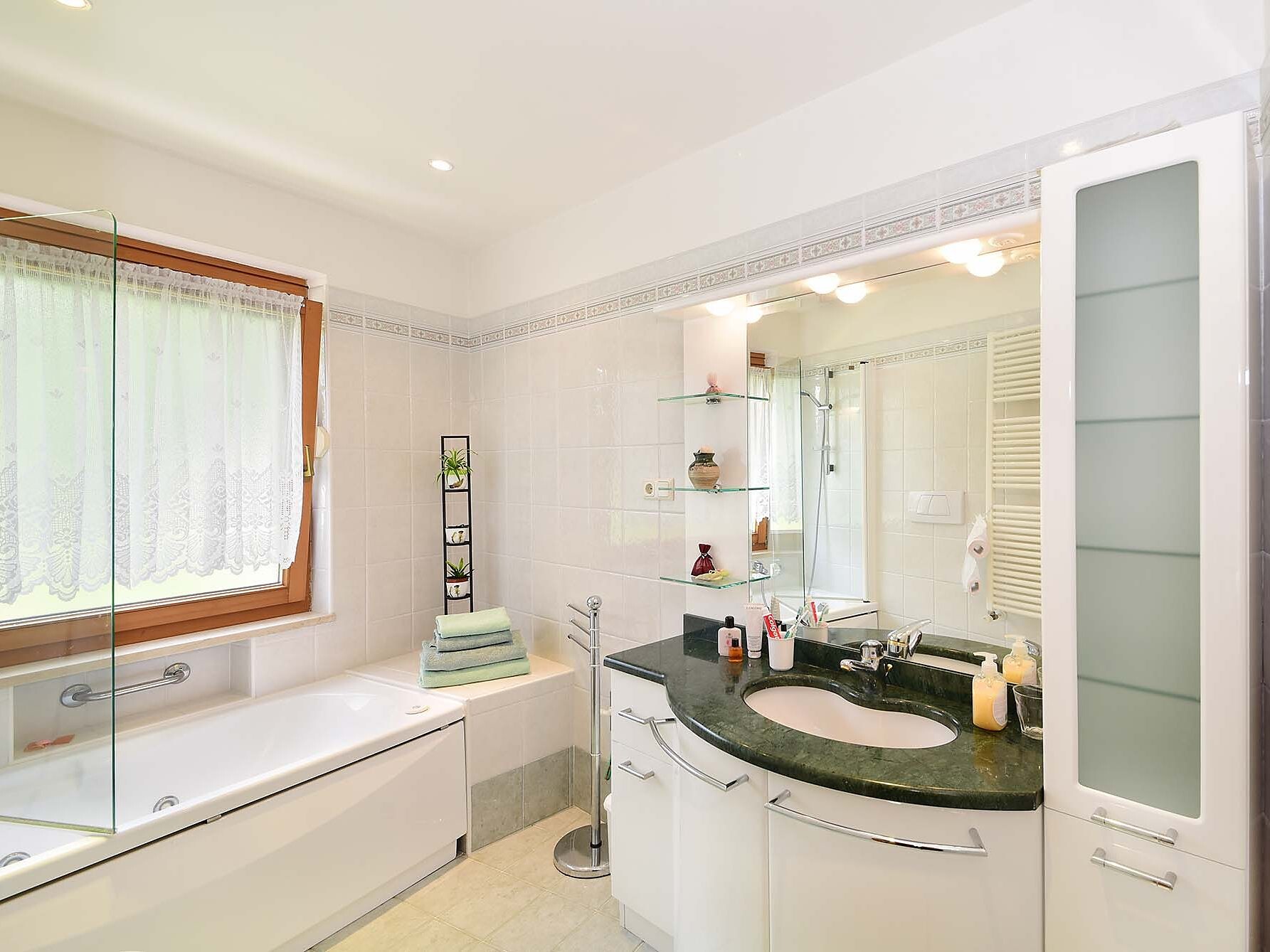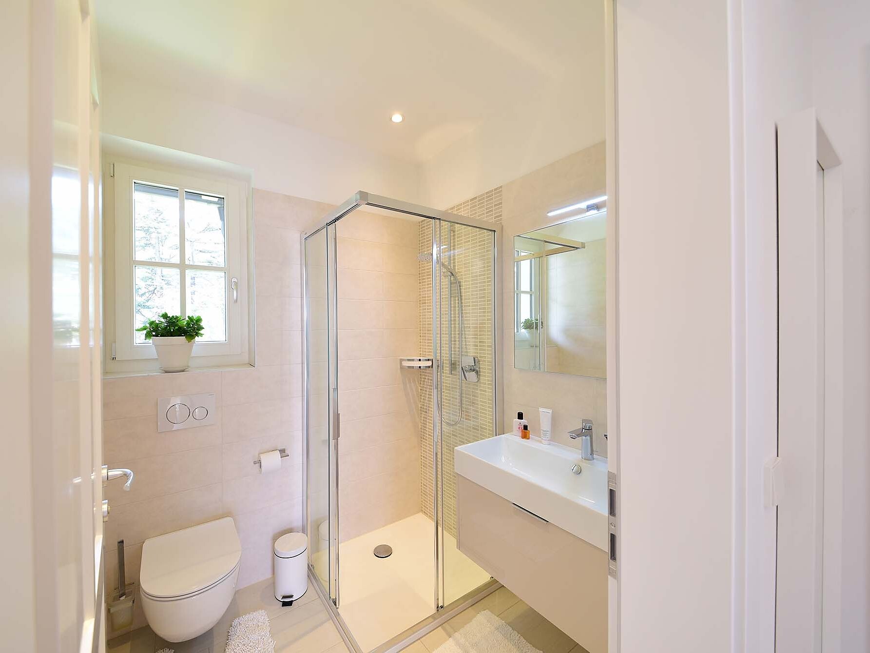 The living room contains a sofa-bed, a dining area and a flatscreen television. The built-in modern kitchen is fully equipped with all utensils and crockery and comes with dishwasher, electric stove and built-in oven, microwave oven and filter coffee coffee machine. Bedlinen and towels are supplied.