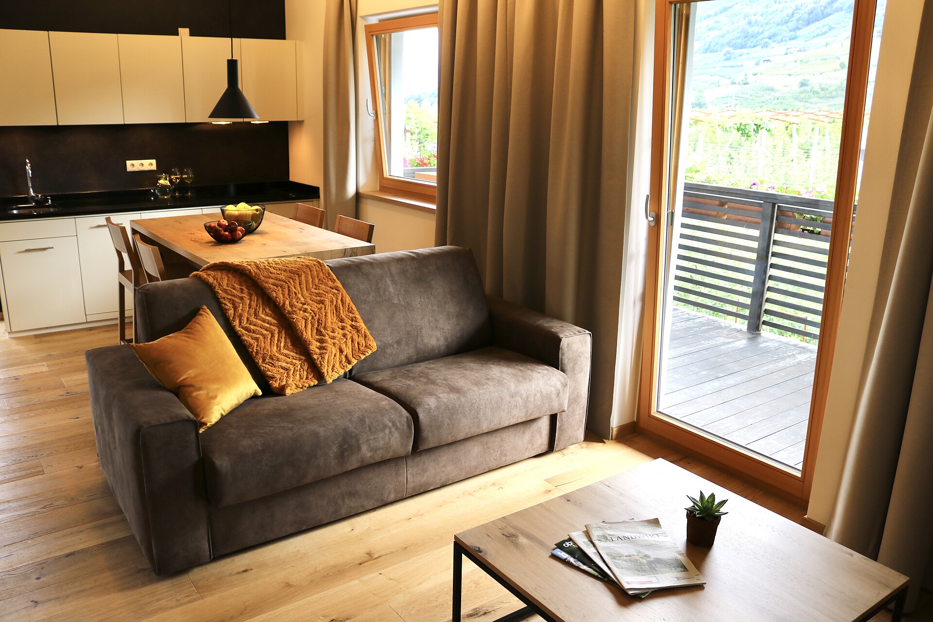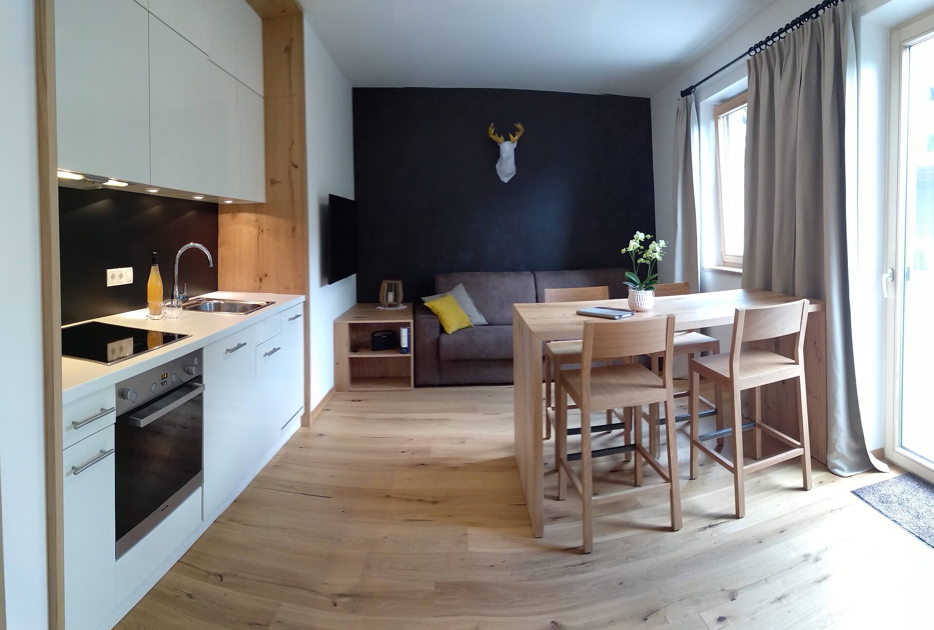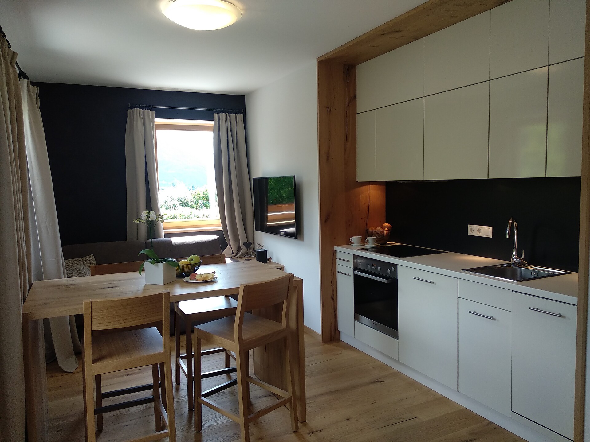 Double bed , Double sofa bed, Terrace, Bed linen provided, Non-smoking apartment, 2 or more bedrooms, Eat-in kitchen, Coffee machine, Dishwasher, Electric cooker, Cutlery provided, Hob, Water boiler, Oven, Shower/Bath tub, 2 or more bathrooms, Separate WC, Bidet, Hair dryer, Towels, TV, Satellite/Cable, WLAN, Internet access, Final cleaning included, Main building, Panoramic view, South view