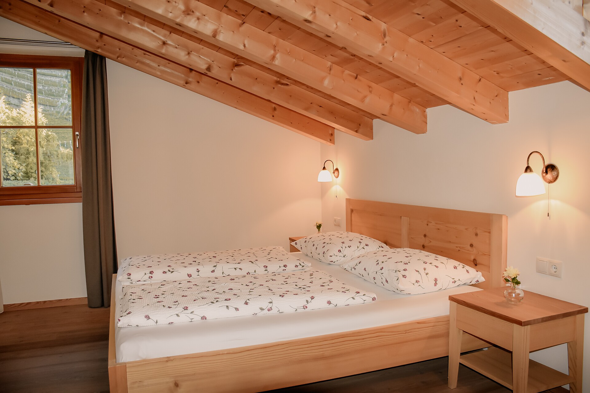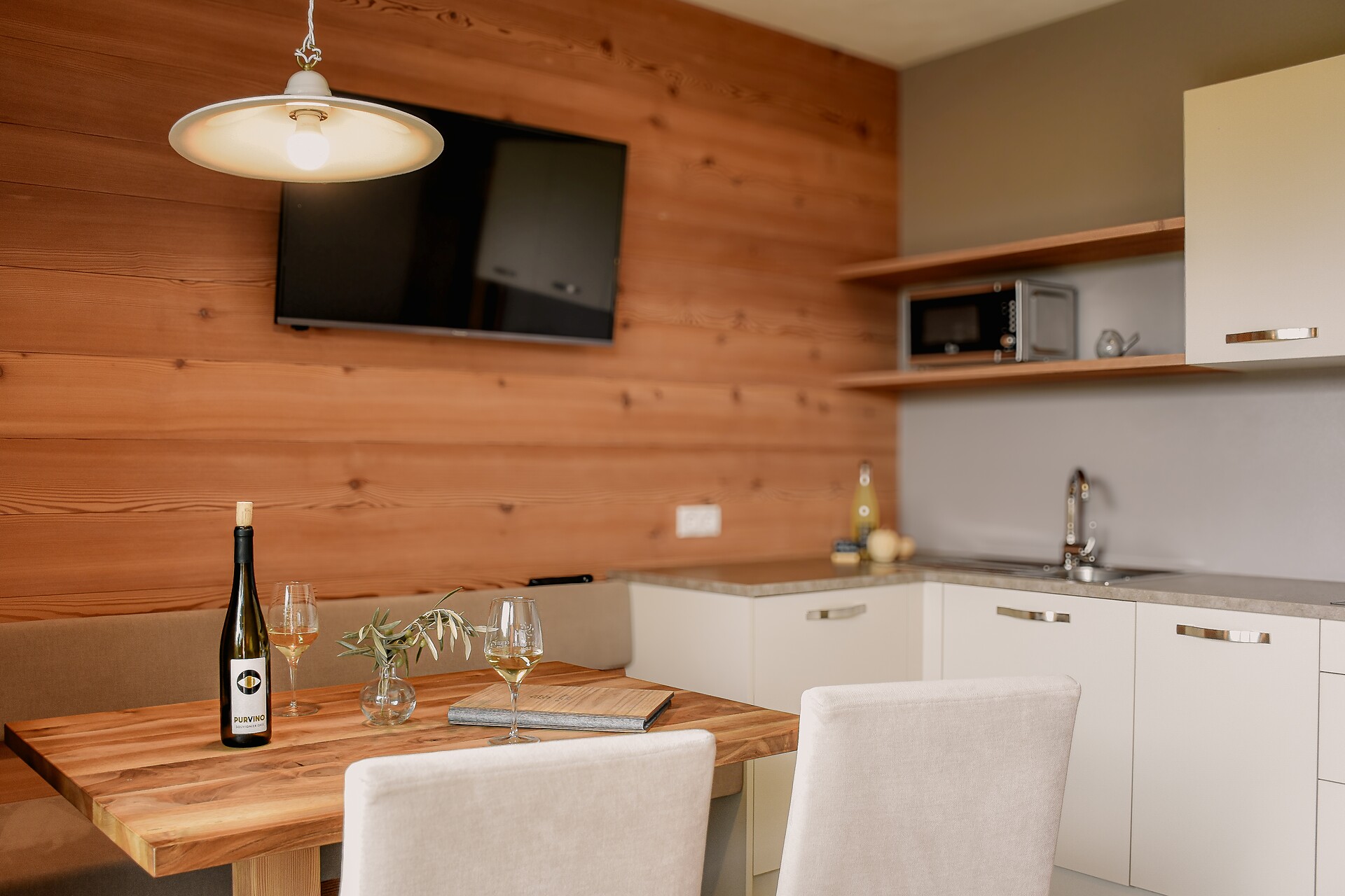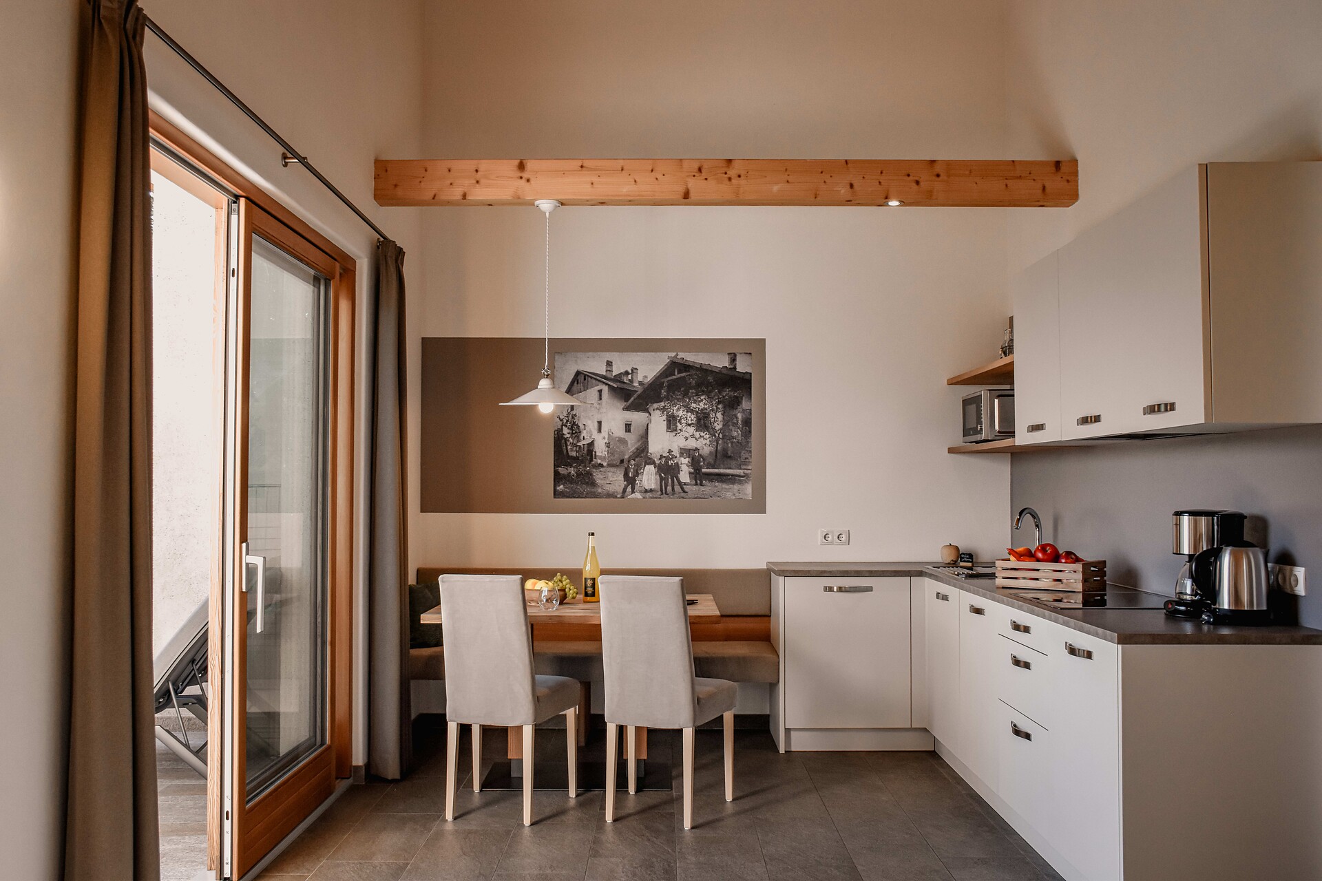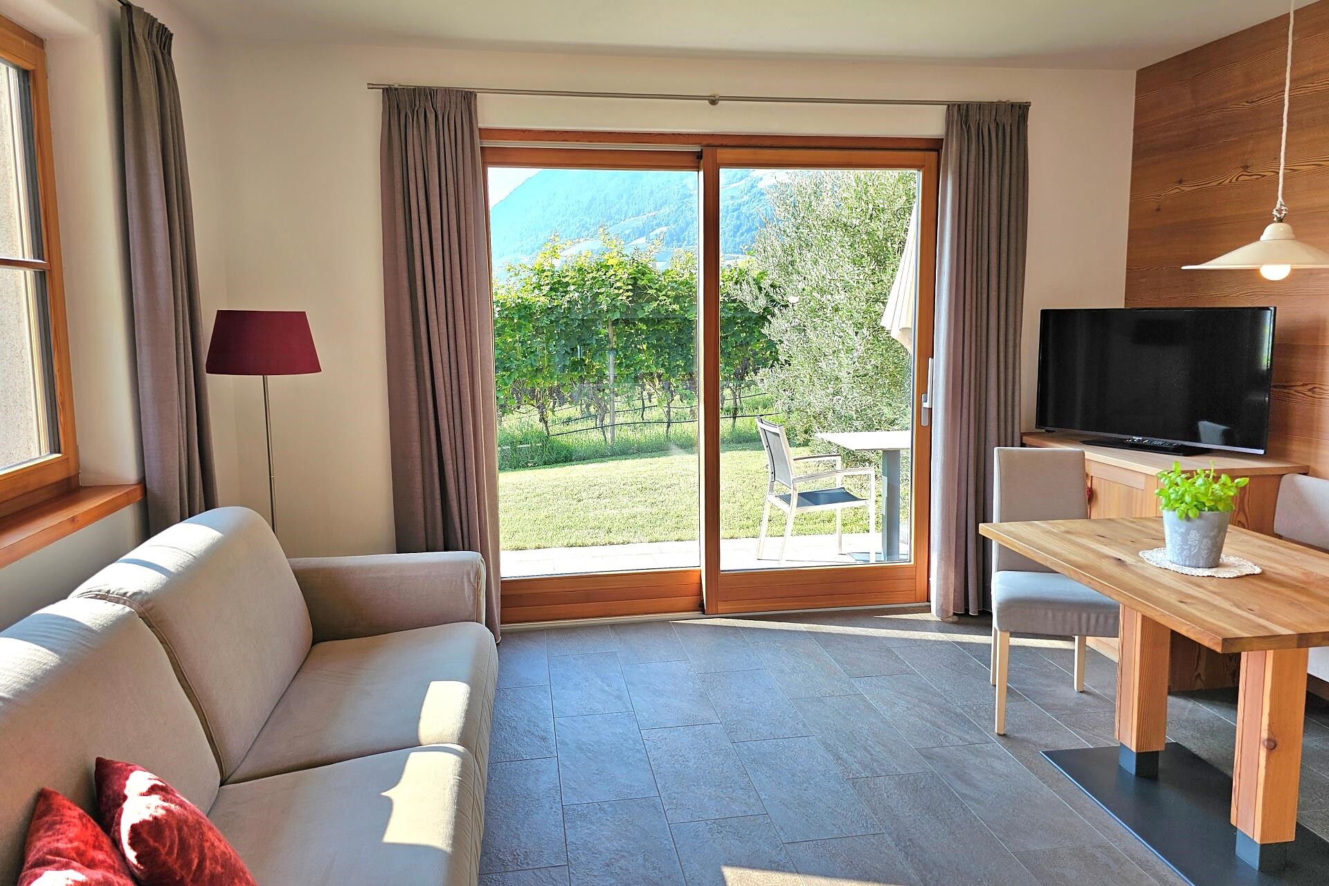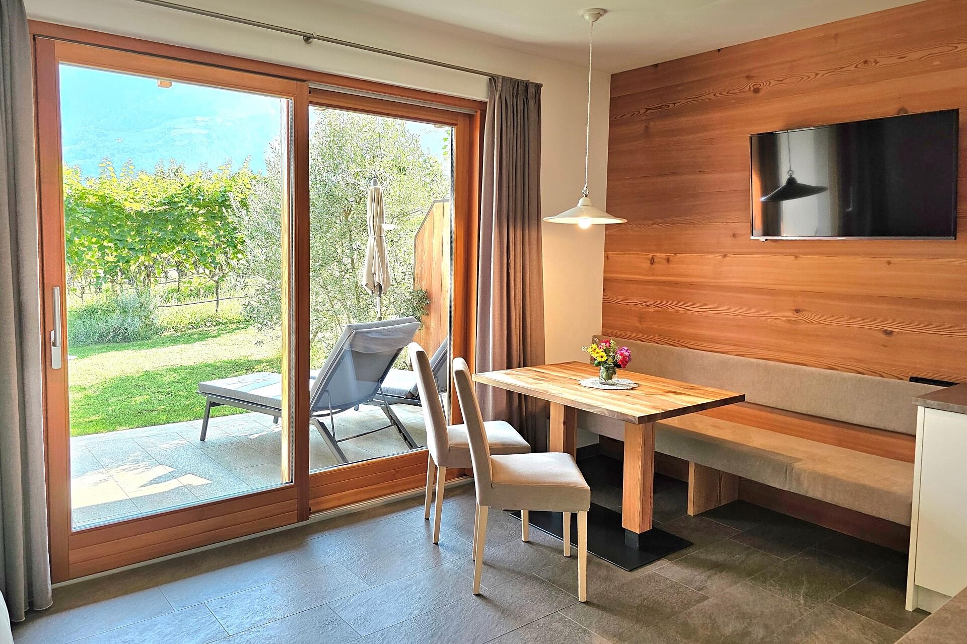 South side (living room/kitchen) with a panoramic view of the village of Tirol and Meran, two separate bedrooms with solid spruce furniture custom-made by a carpenter, two bathrooms with a comfortable shower, walnut furniture and a stone washbasin, sun terrace with loungers, table and chairs.