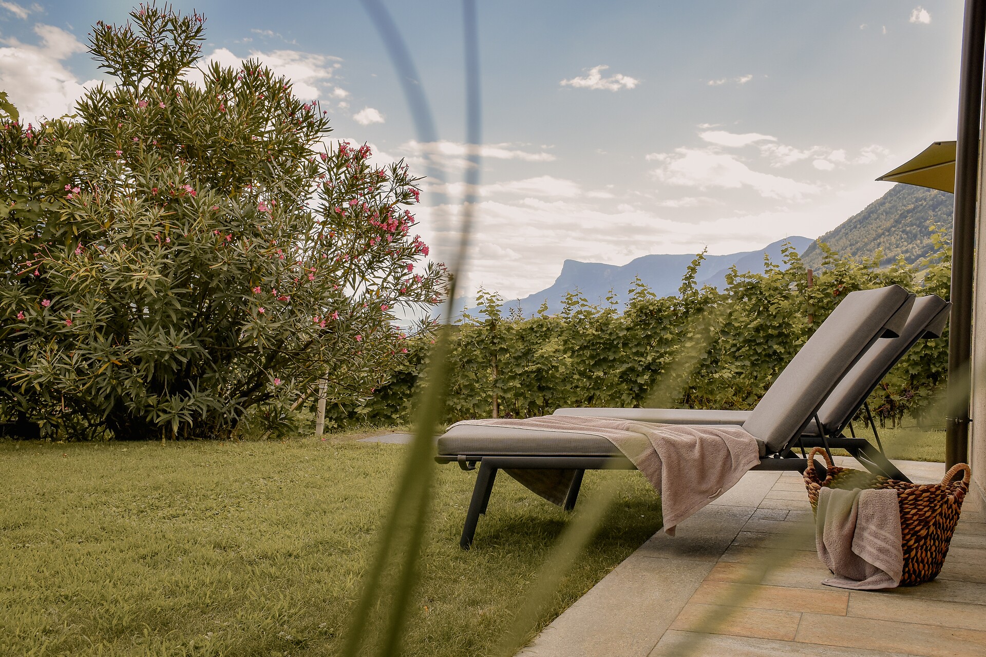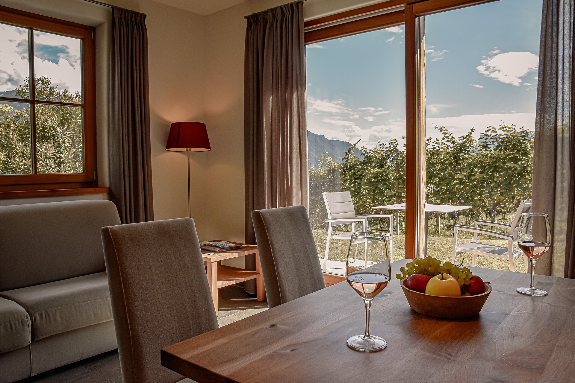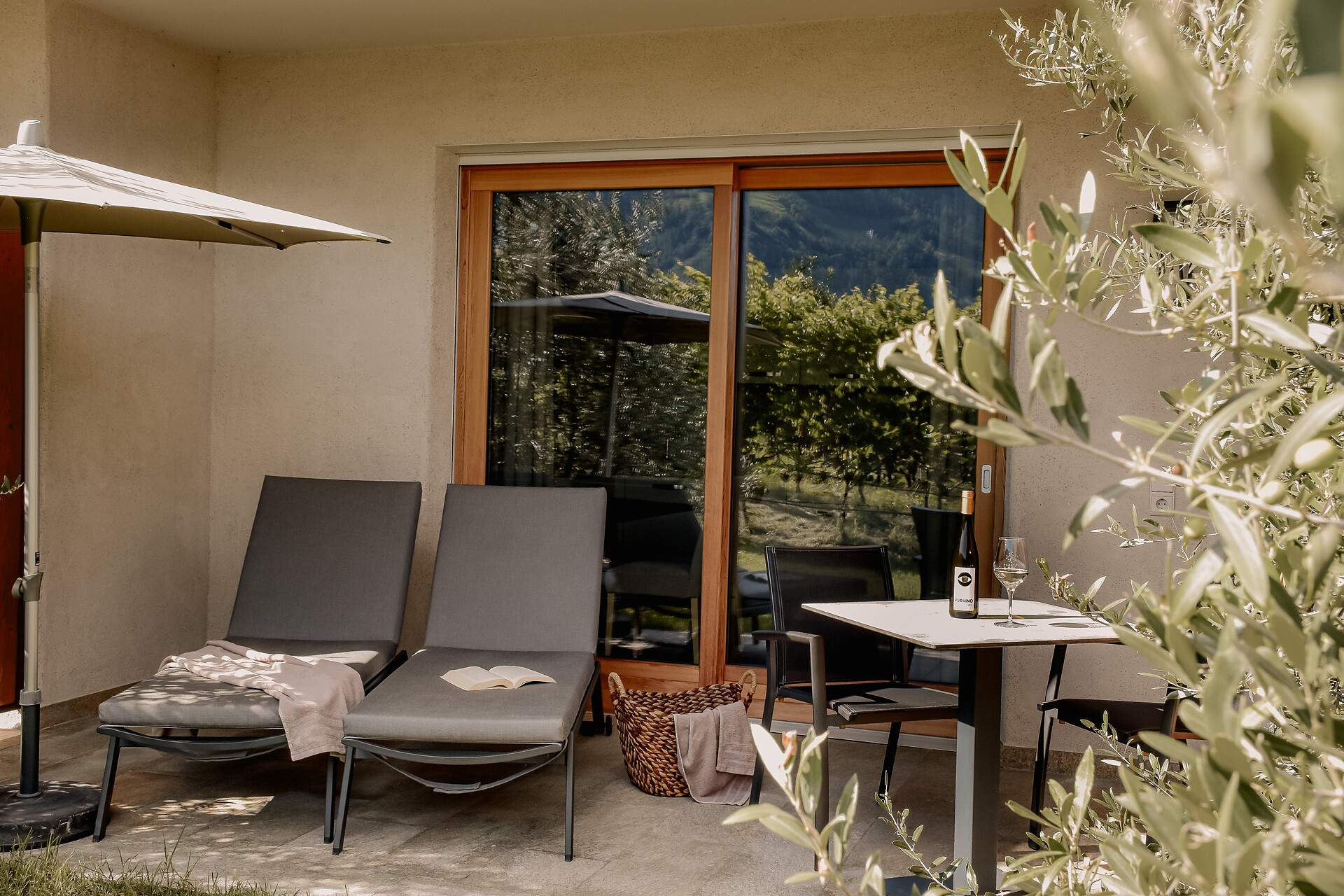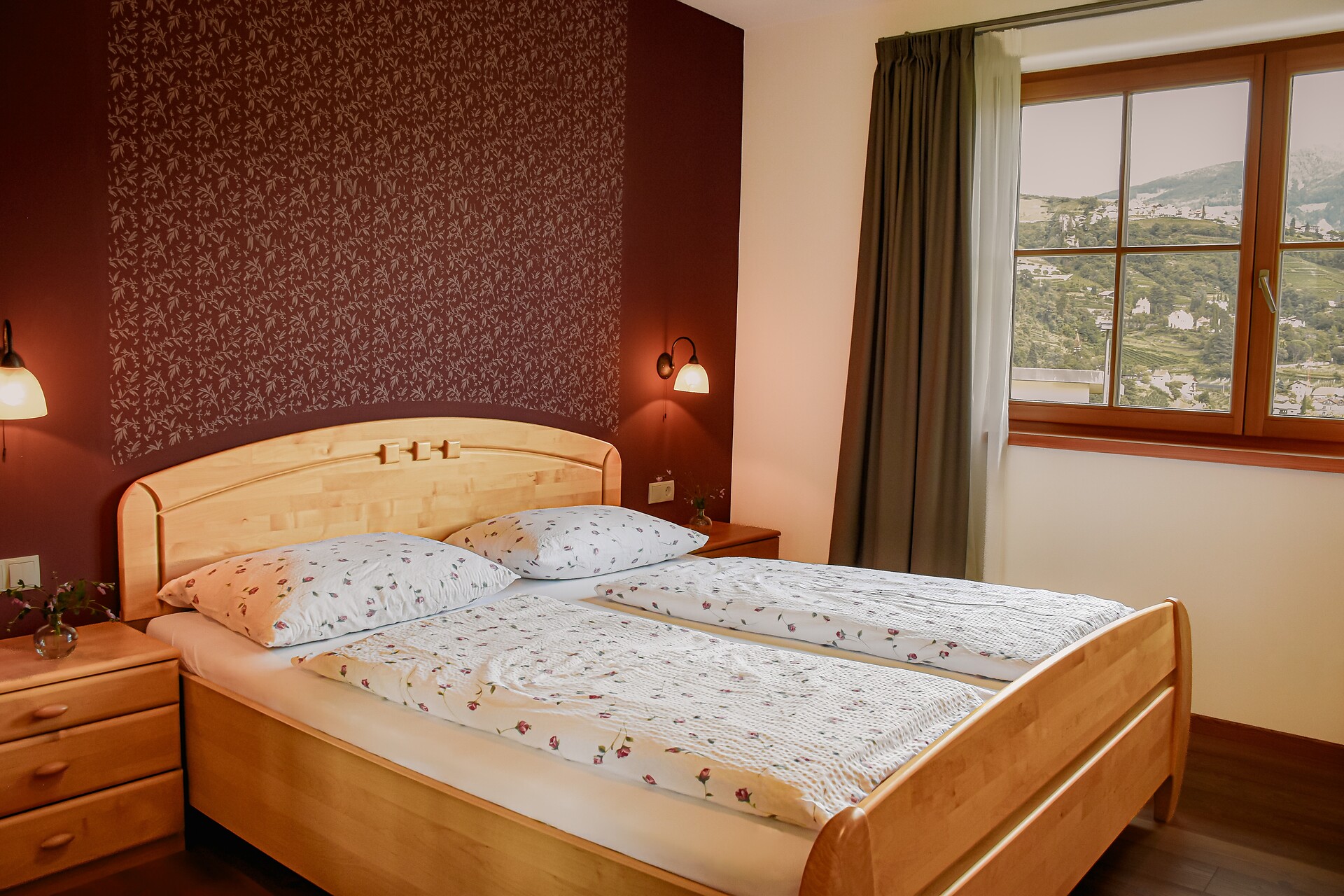 South side (living room/kitchen) with a panoramic view of the village of Tirol and Meran, two separate bedrooms with solid spruce furniture custom-made by a carpenter, two bathrooms with a comfortable shower, walnut furniture and a stone washbasin, sun terrace with loungers, table and chairs.