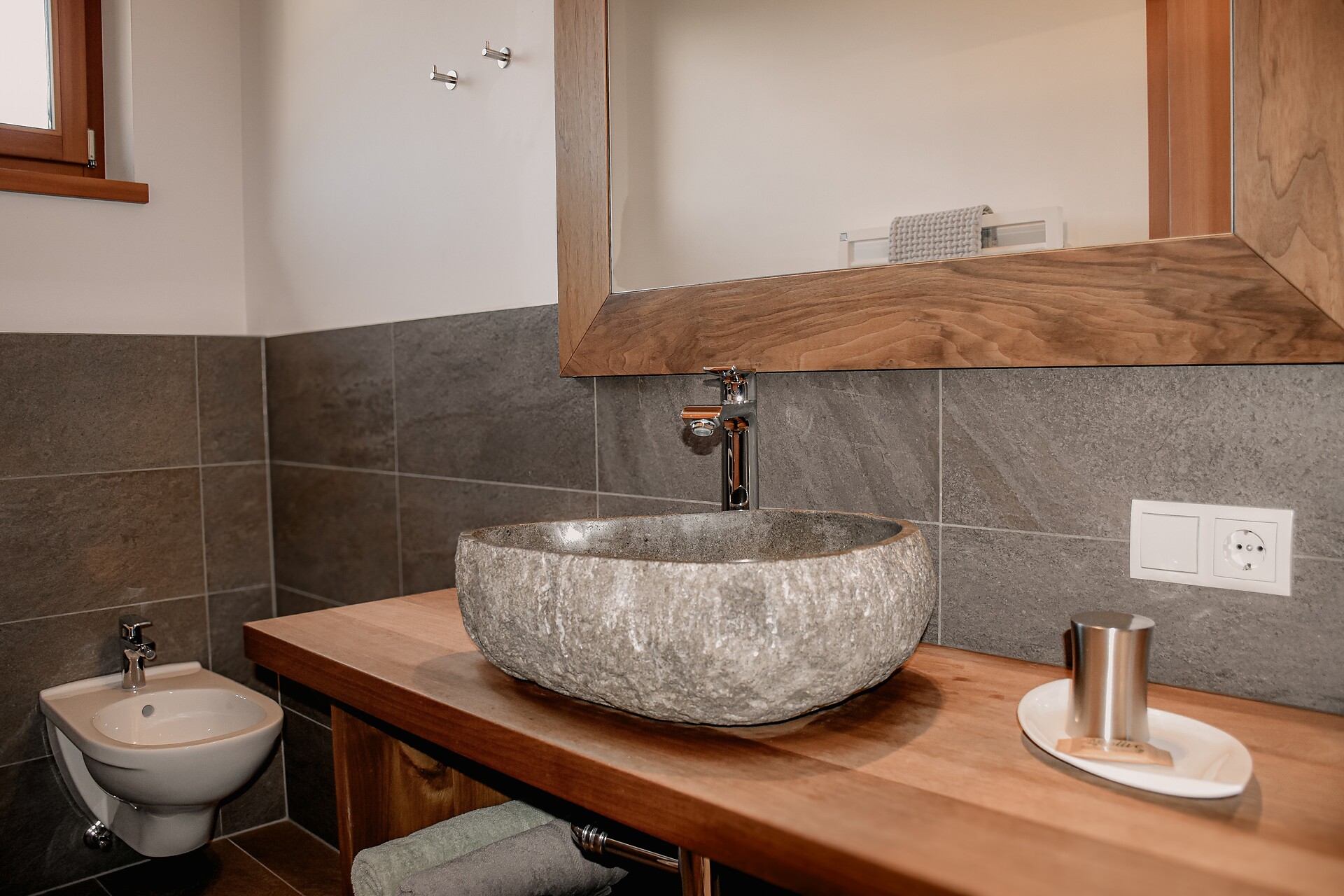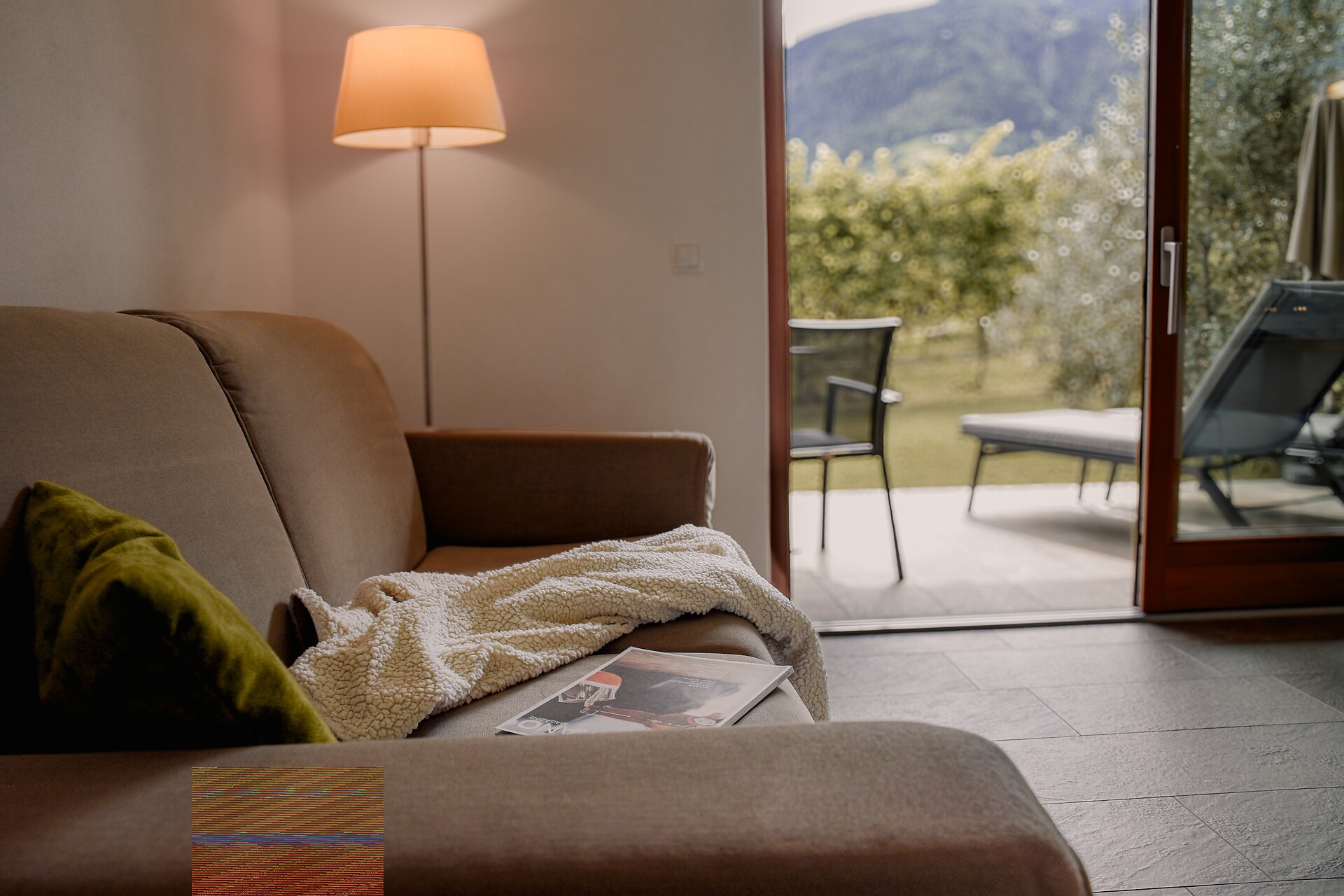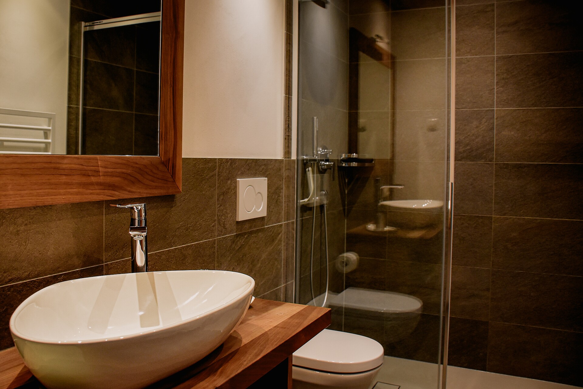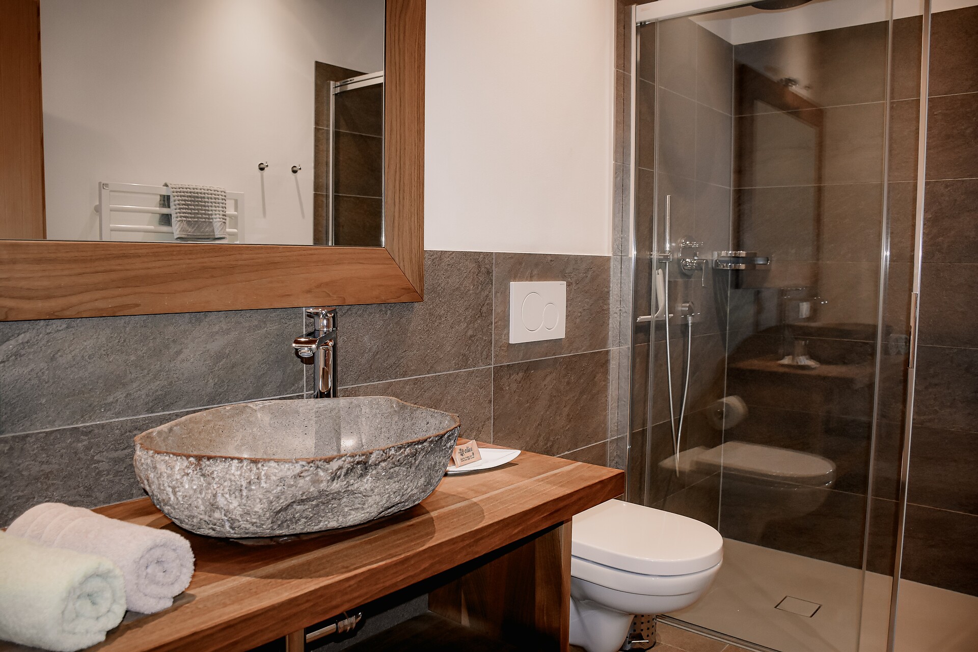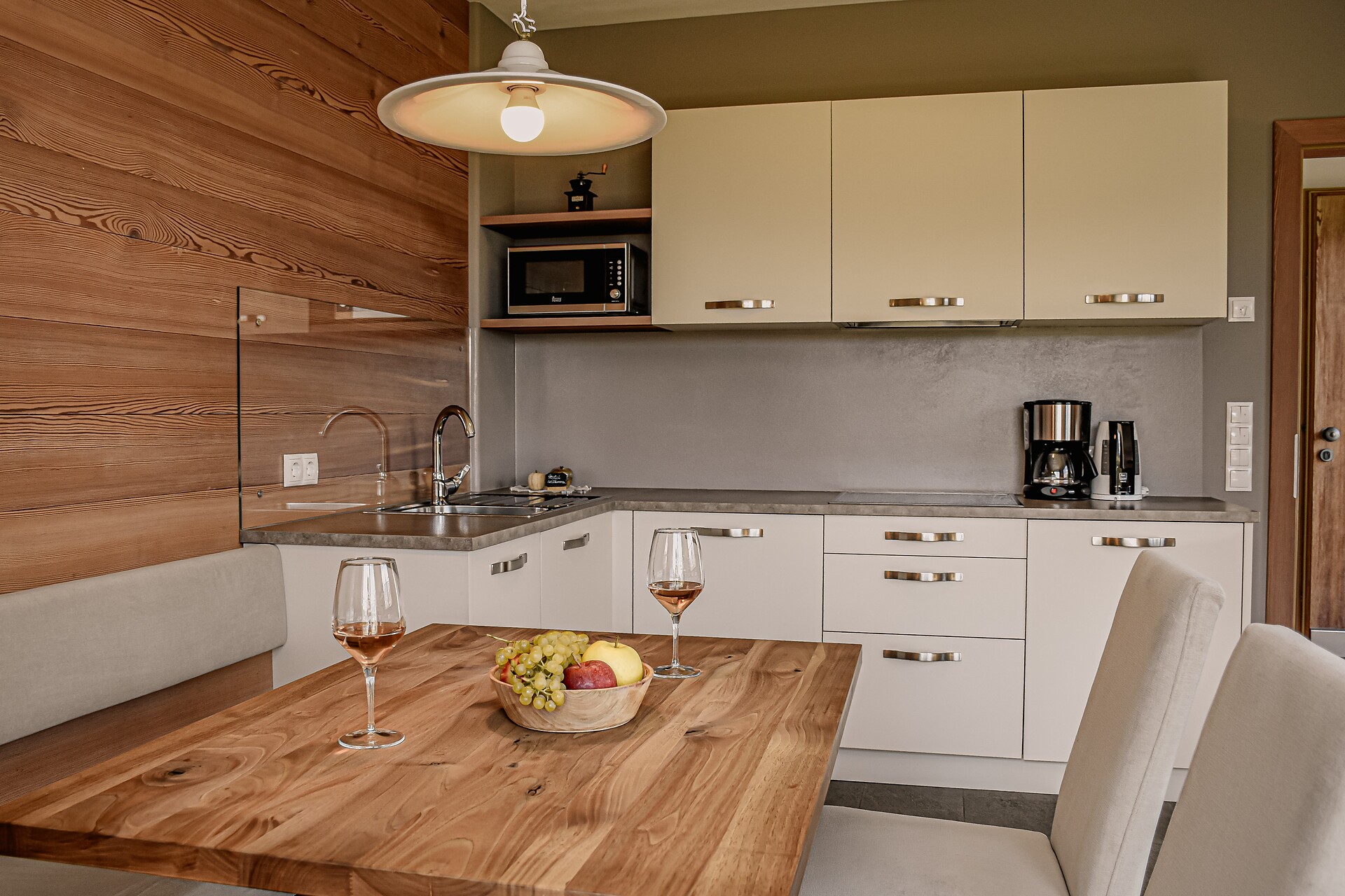South side (living room/kitchen) with a panoramic view of the village of Tirol and Meran, two separate bedrooms with solid spruce furniture custom-made by a carpenter, two bathrooms with a comfortable shower, walnut furniture and a stone washbasin, sun terrace with loungers, table and chairs.