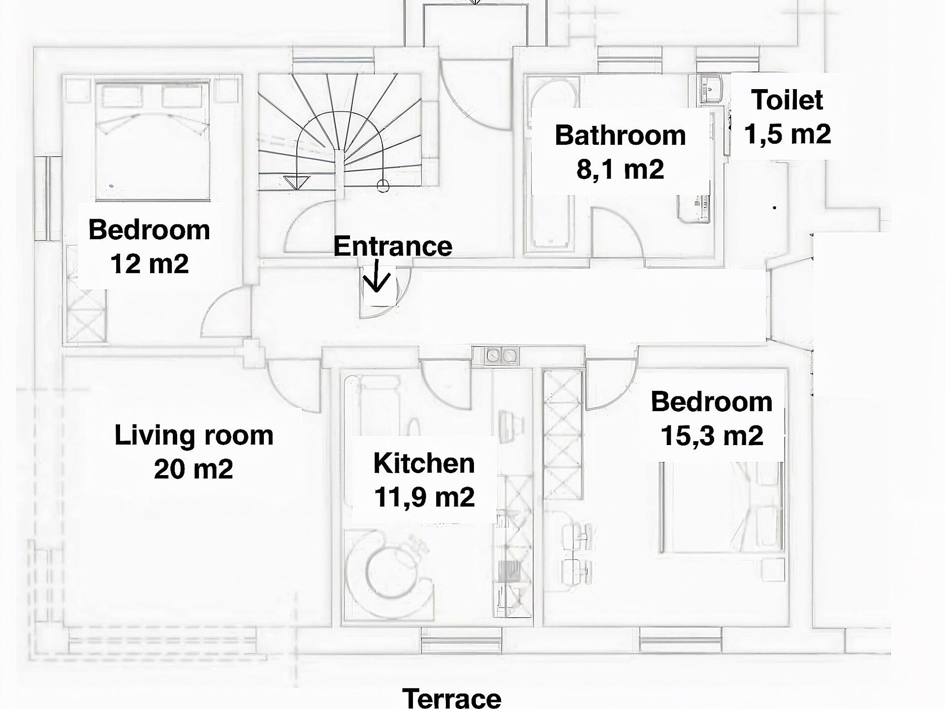 This ground-floor apartment offers generous, comfortable spaces for a truly relaxing stay. The expansive living room, the well-equipped kitchen, two separate bedrooms, the bathroom, and an additional guest WC provide comfort and plenty of room for both shared and private moments.