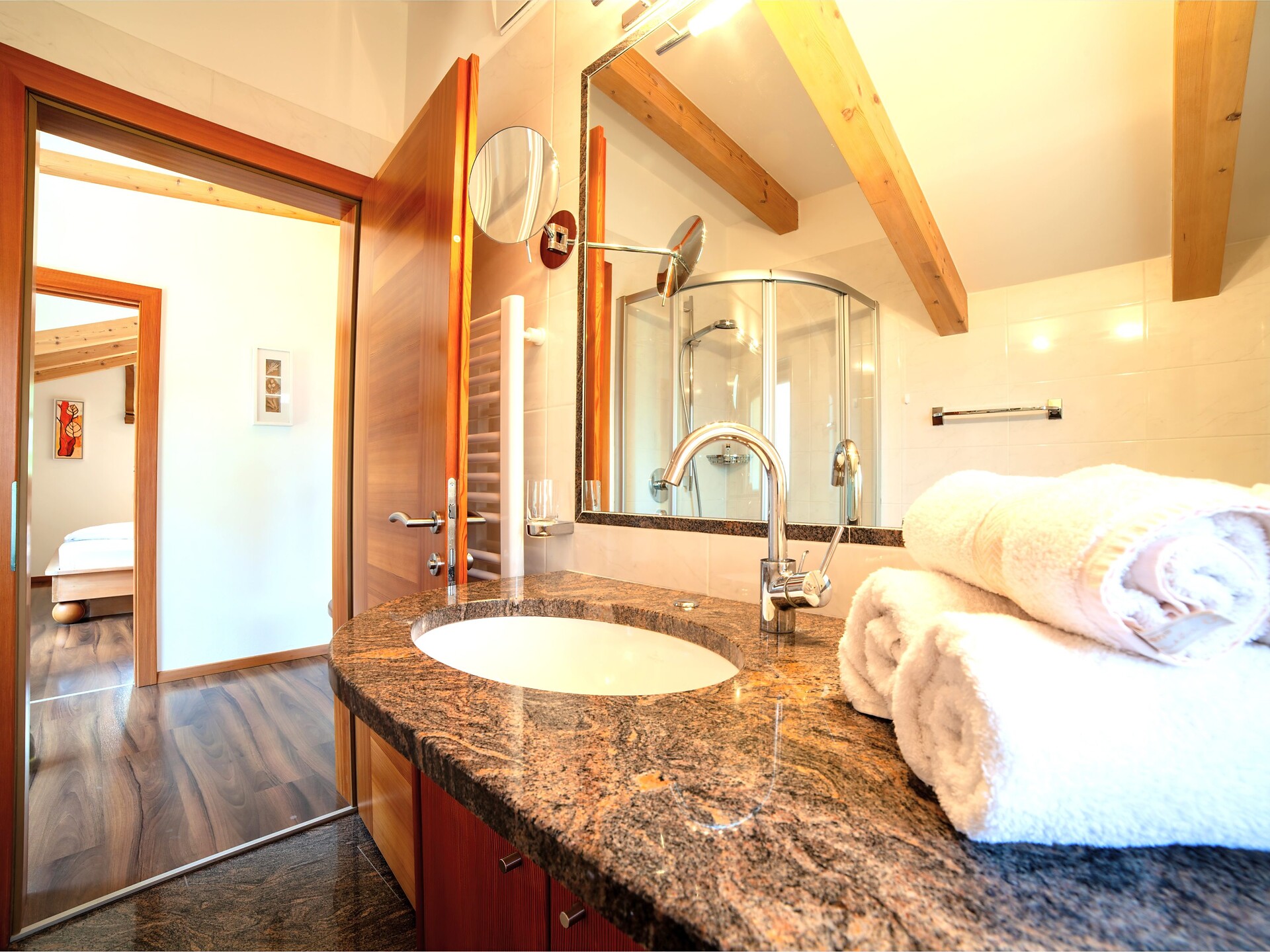 Located on the second floor, Apartment 3° combines comfortable living with natural charm. Thoughtfully crafted natural wood furnishings and two balconies facing south and southeast offer stunning mountain views and plenty of light – perfect for relaxed, sunny moments at any time of day.