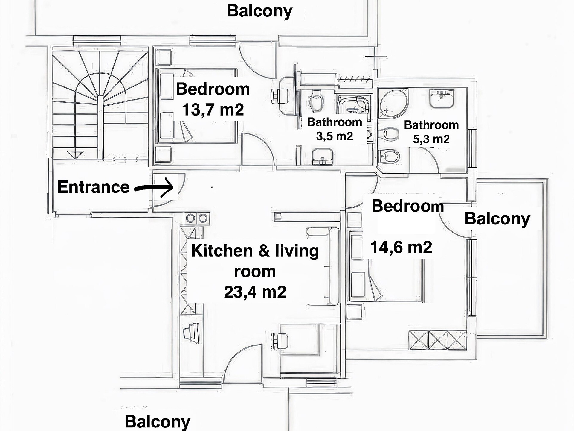 Located on the second floor, Apartment 4° welcomes you with a generous sense of space and elegant natural wood furnishings. Two separate bedrooms, each with its own bathroom and balcony, ensure maximum privacy, while the bright living area with kitchen and an additional balcony invites shared, relaxed moments.