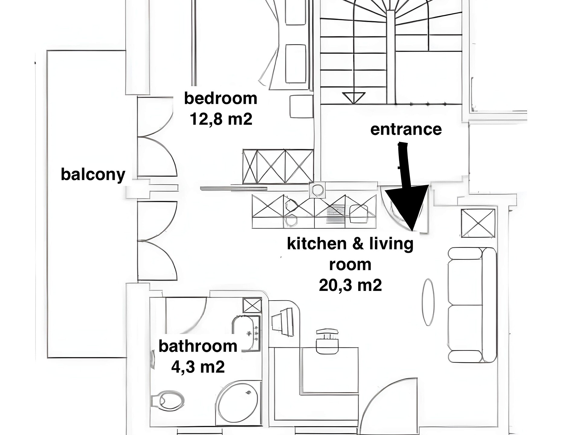 Ideal for two guests; upon request, the sofa bed in the living area can be prepared for a third person.