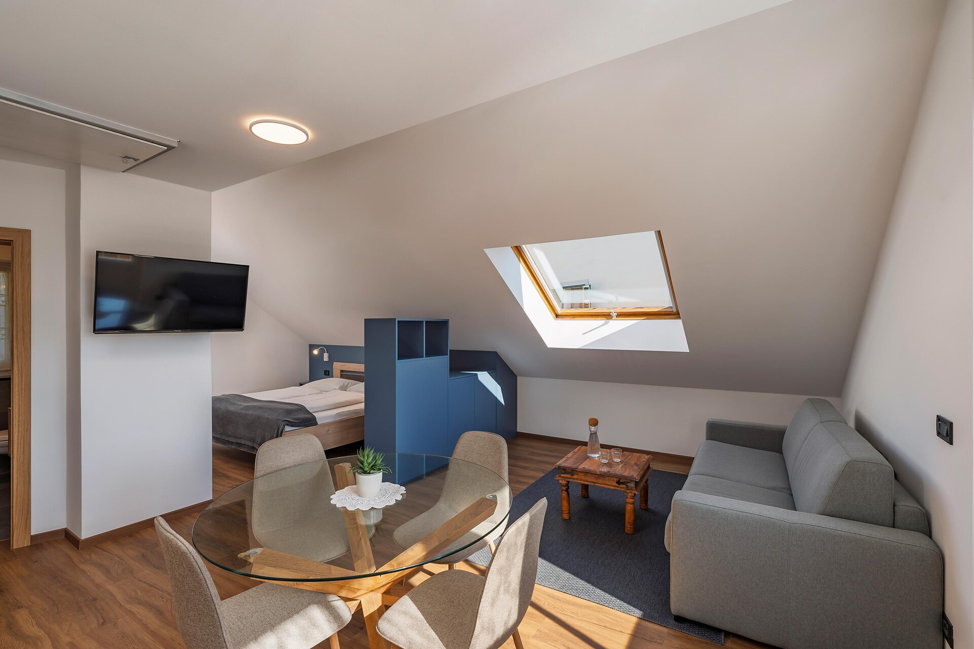 Combining tradition and modern comfort, this attic apartment on the second floor offers a separate double bedroom, a comfortable living area with sofa bed, and a sunny south-facing balcony with beautiful views. Fully equipped with free Wi-Fi.