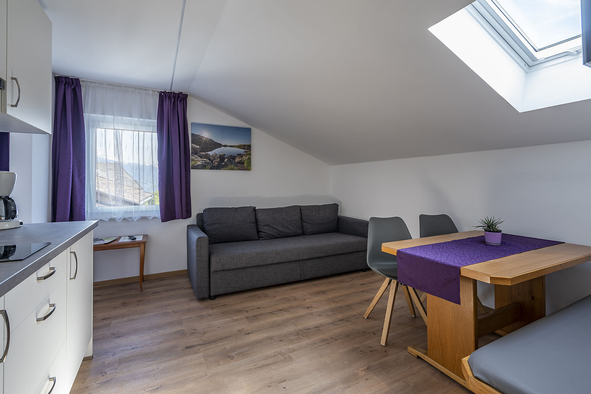 This apartment on the second floor features a living area with kitchenette, living corner with sofa bed and a partially separated double bed, plus an additional bedroom with double bed – perfect for families or small groups. A balcony with mountain views provides a relaxing spot. Modern bathroom with shower/WC, Wi-Fi and flat-screen satellite TV complete the comfort.