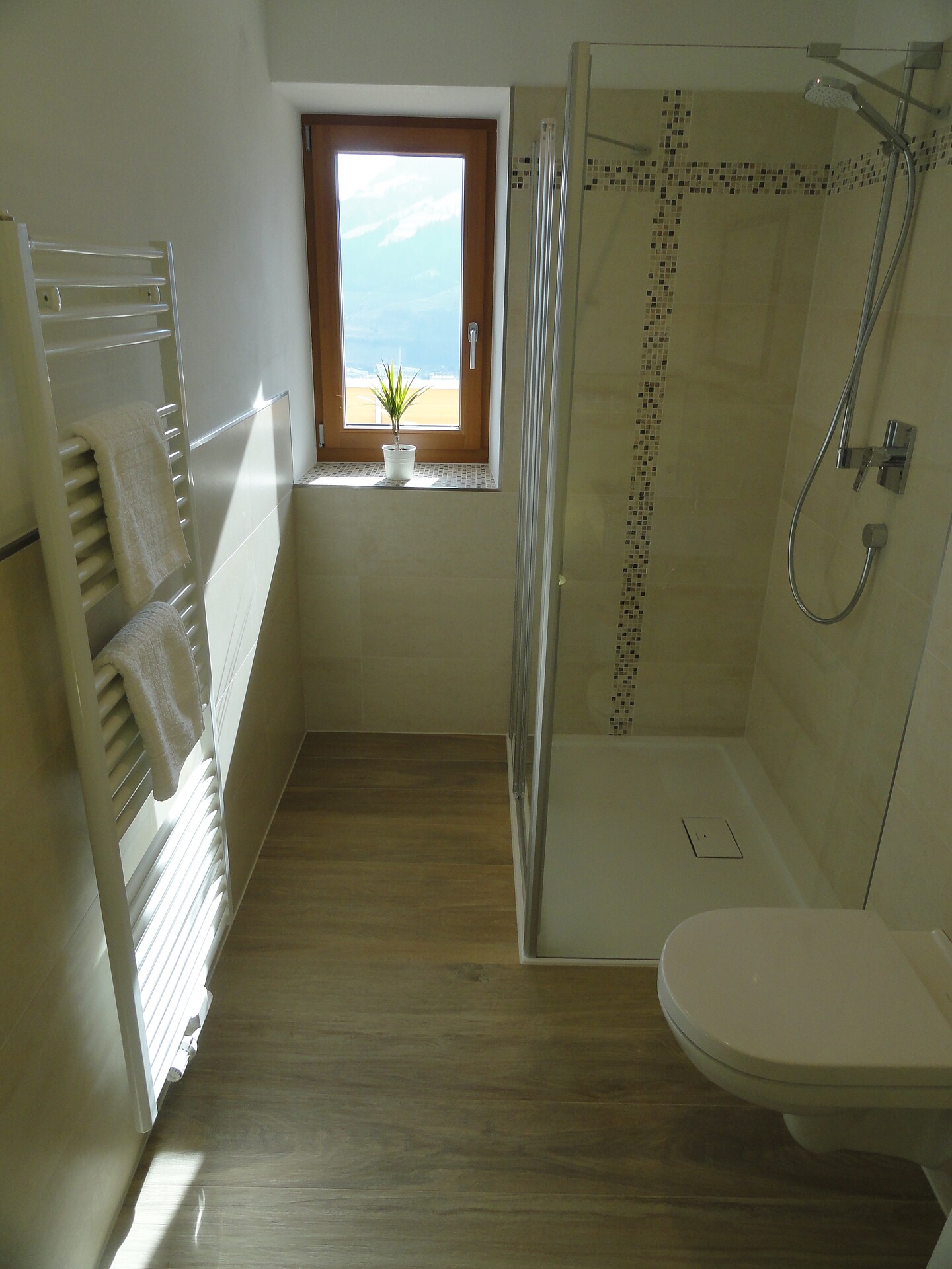 The apartment has been fully renovated in 2015 and therefore offers you all the amenities you are looking for: prepare a delightful meal in the new kitchen, relax in the calm bedroom and enjoy the sun on the balcony with views over Merano and the Alps. The bathroom with daylight is equipped with a spacious shower cubicle.