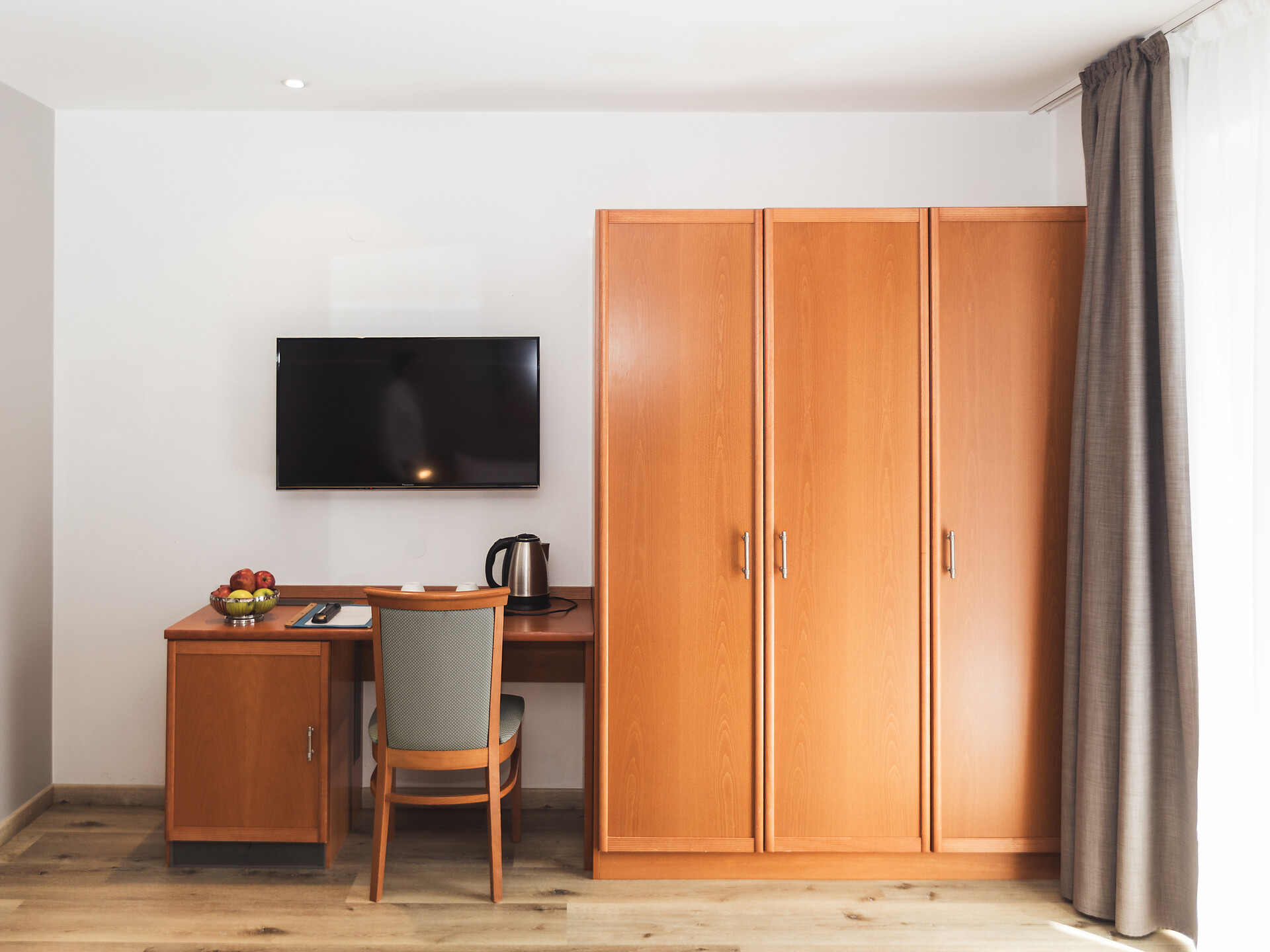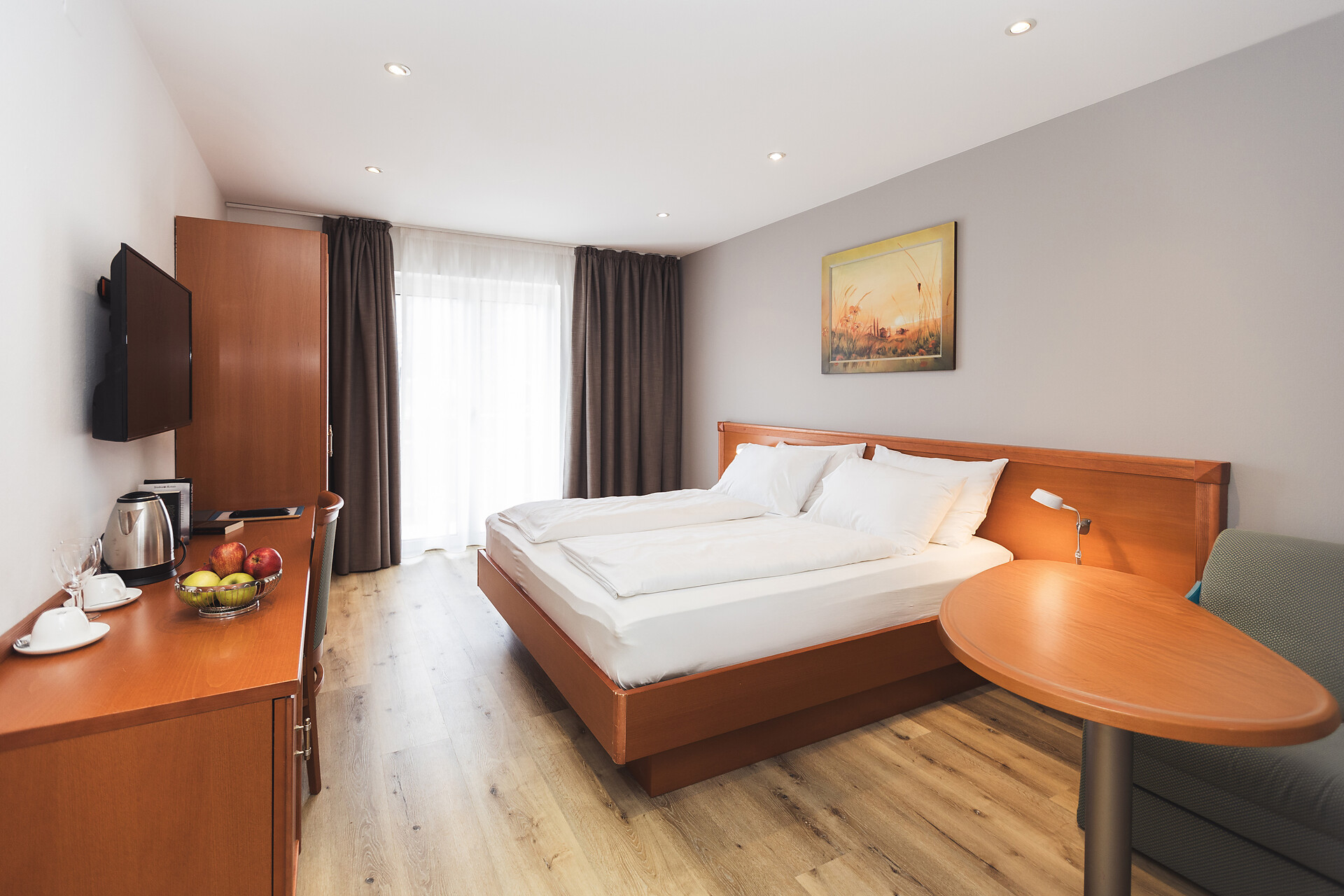 The room impresses with its brightness, on approx. 21 m² with balcony there is enough space for your relaxing holiday.Furnished with natural materials, parquet floor in earth tones, rough plaster on the ceiling for a pleasant ambience, comfortable beds with South Tyrolean cold foam mattresses, various pillows for a restful sleep, wardrobe and bed in solid wood, desk, full HD flat-screen TV, free WiFi, minibar, kettle and safe.