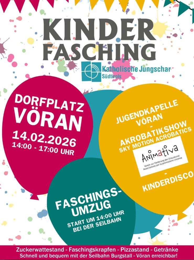 The music band of Vöran organises the carnival parade in the village square of Vöran together with the youth service of Bozen-Land. The youth band of Vöran will also be there. There will also be games, acrobatic show and a children's disco.