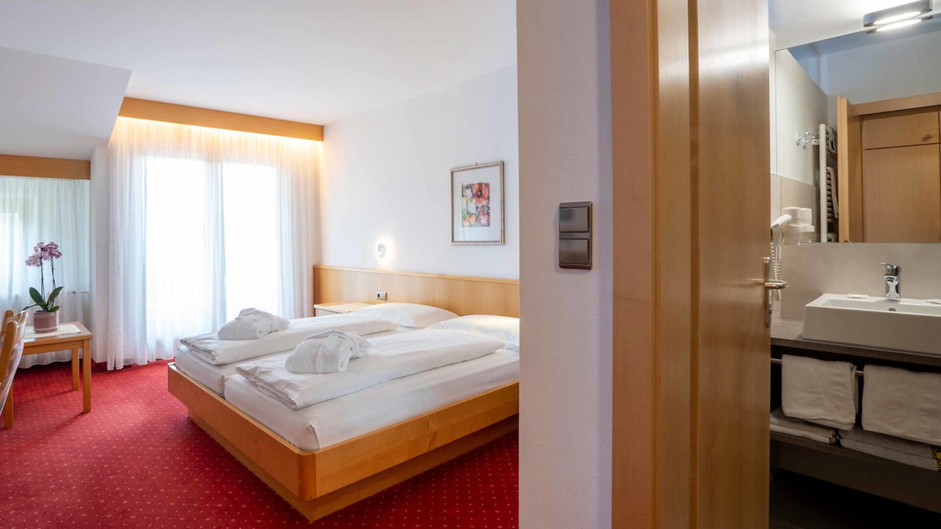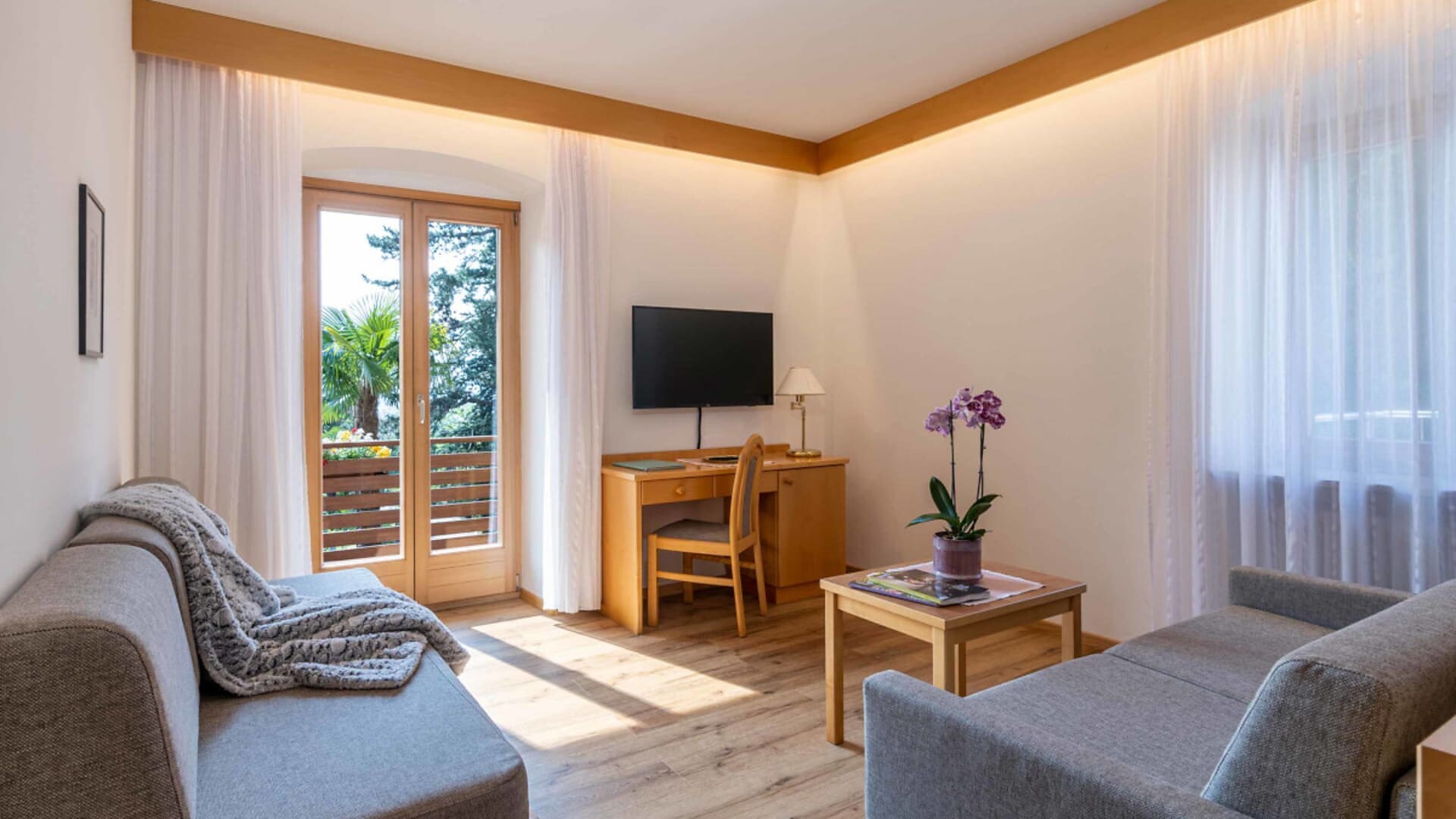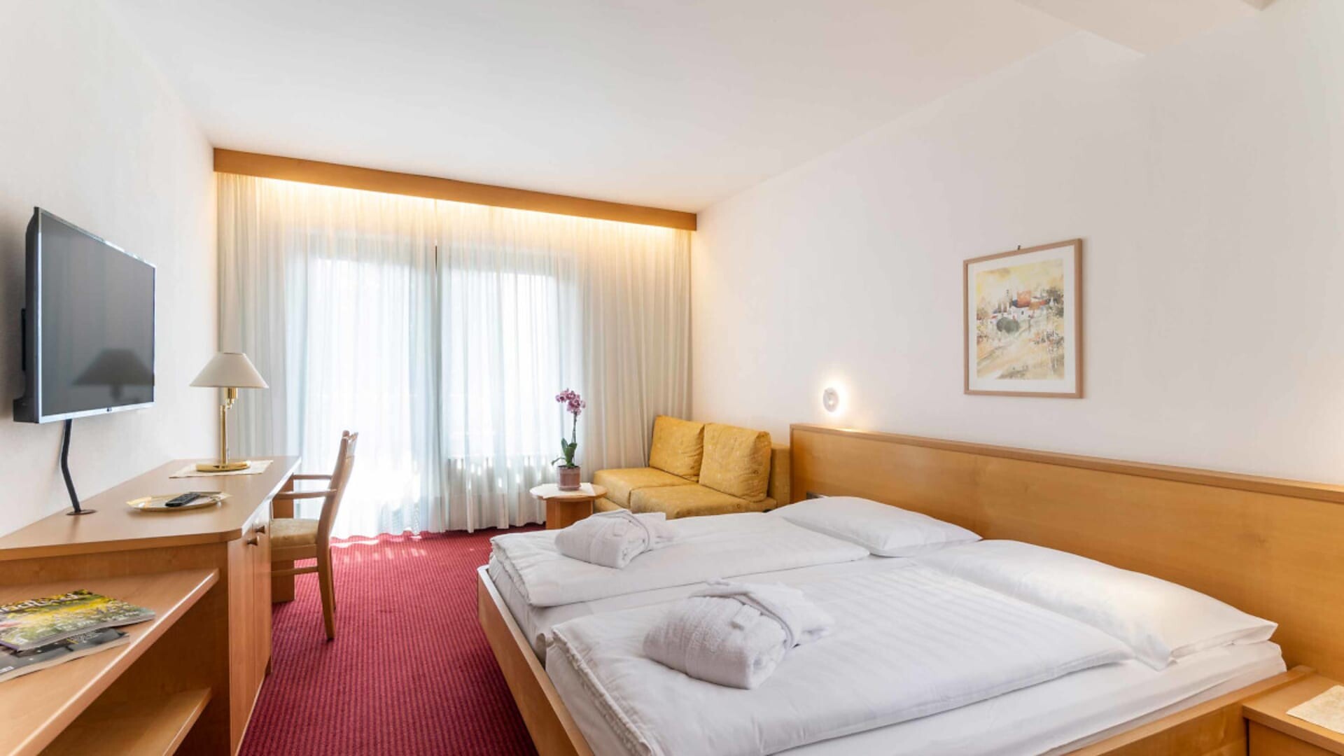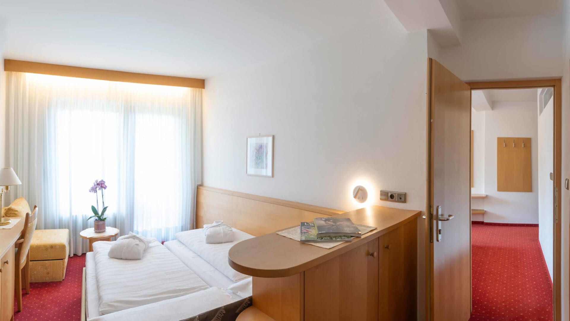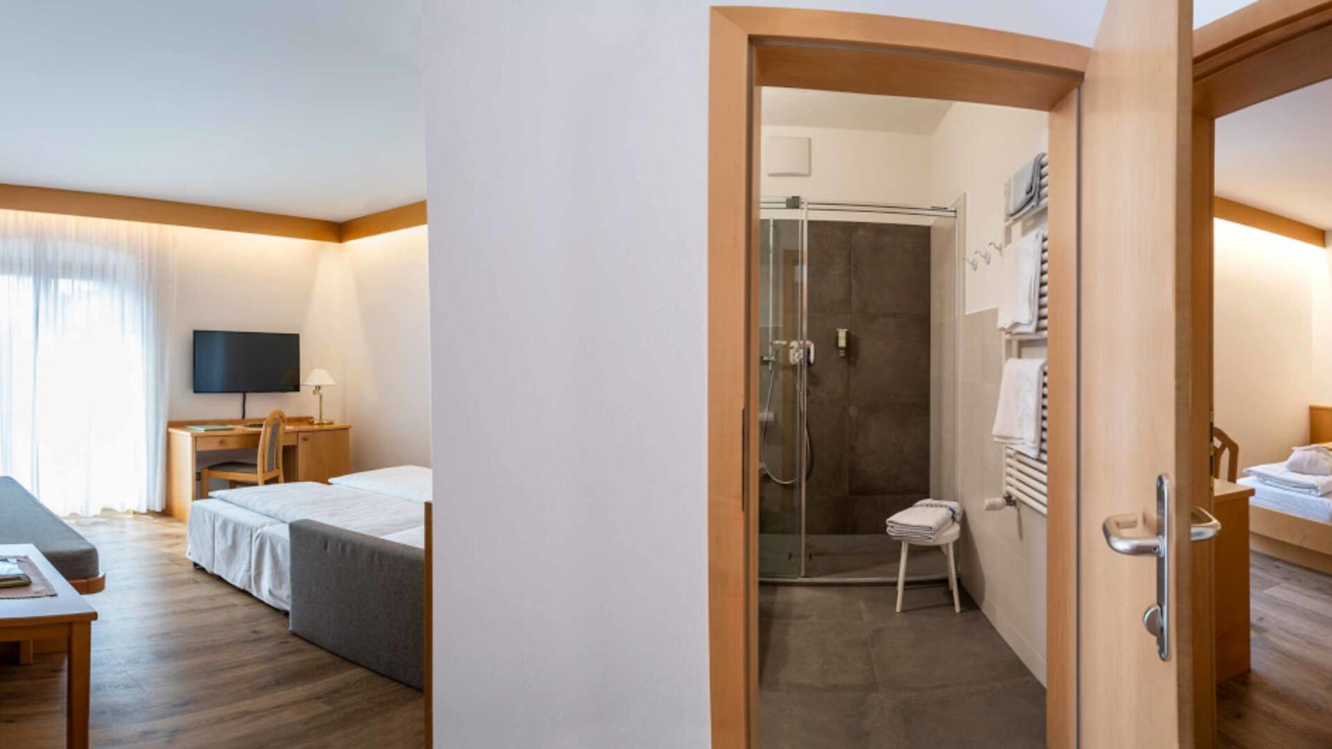 Camera famigliare = 1 Camera comfort matrimoniale con doccia, WC, asciugacapelli, telefono, TV, satellitare, cassaforte, poltrona, con porta di collegamento con la camera comfort singola con doccia, WC, asciugacapelli, telefono, TV satellitare, cassaforte, poltrona, balocne lato Sud (32m²-40m²)