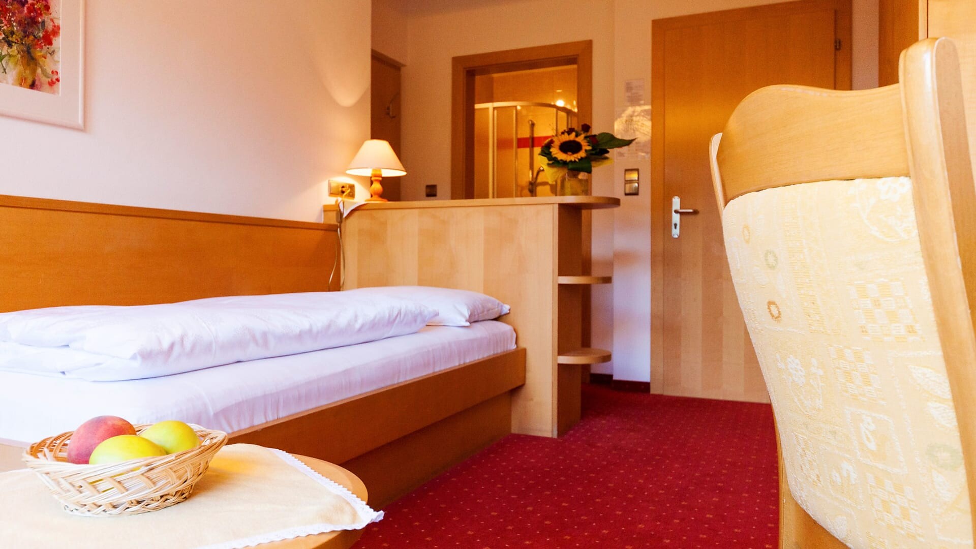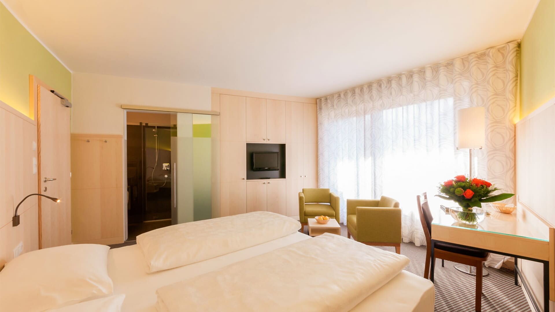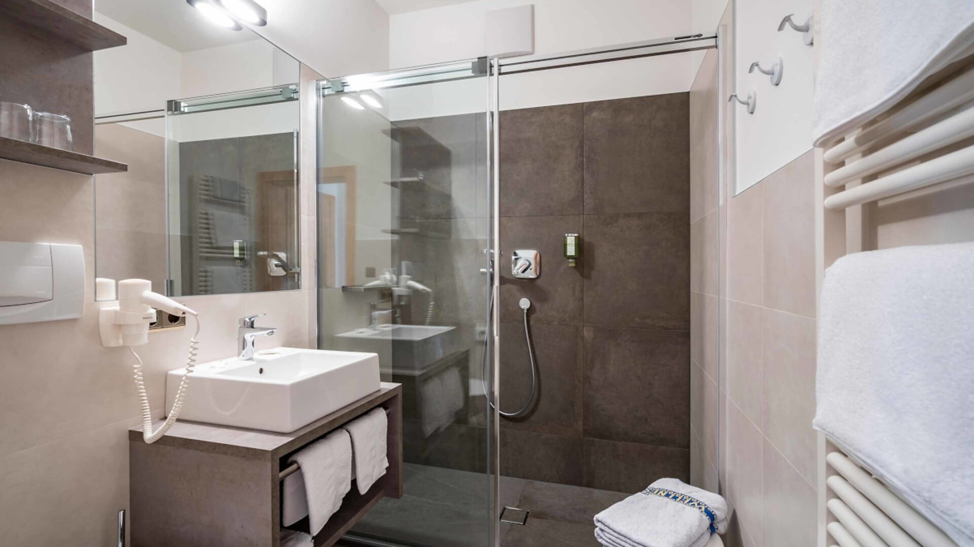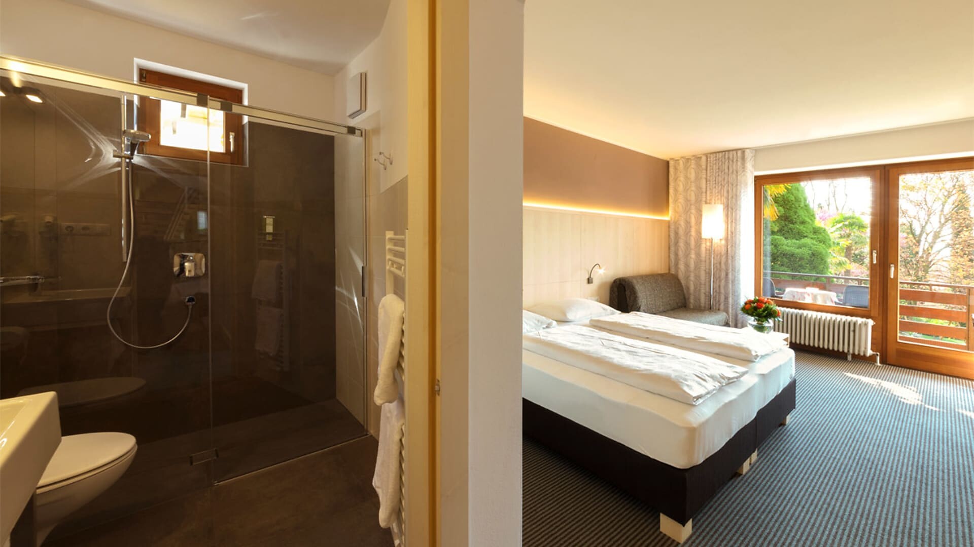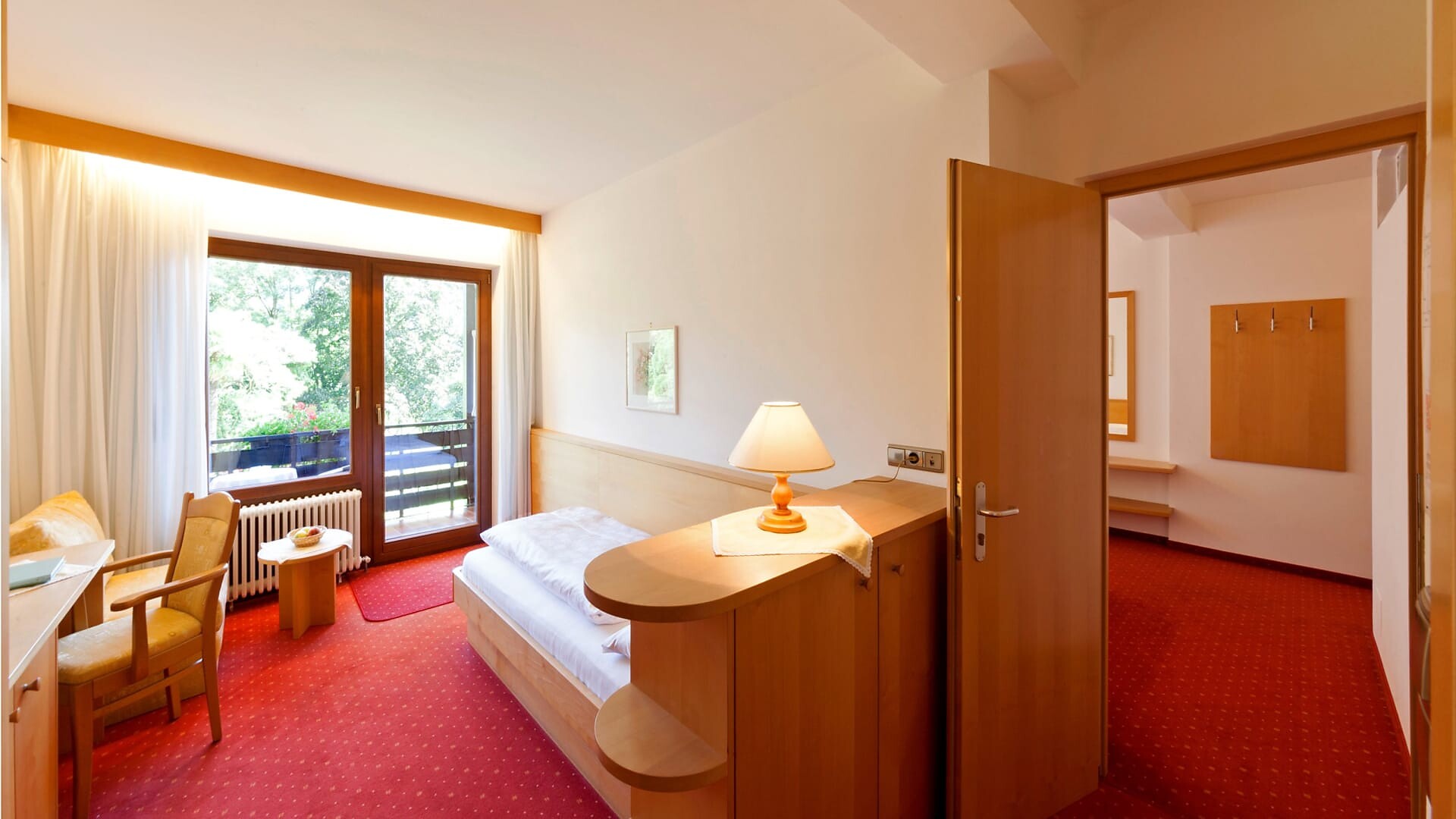 Camera famigliare = 1 Camera comfort matrimoniale con doccia, WC, asciugacapelli, telefono, TV, satellitare, cassaforte, poltrona, con porta di collegamento con la camera comfort singola con doccia, WC, asciugacapelli, telefono, TV satellitare, cassaforte, poltrona, balocne lato Sud (32m²-40m²)