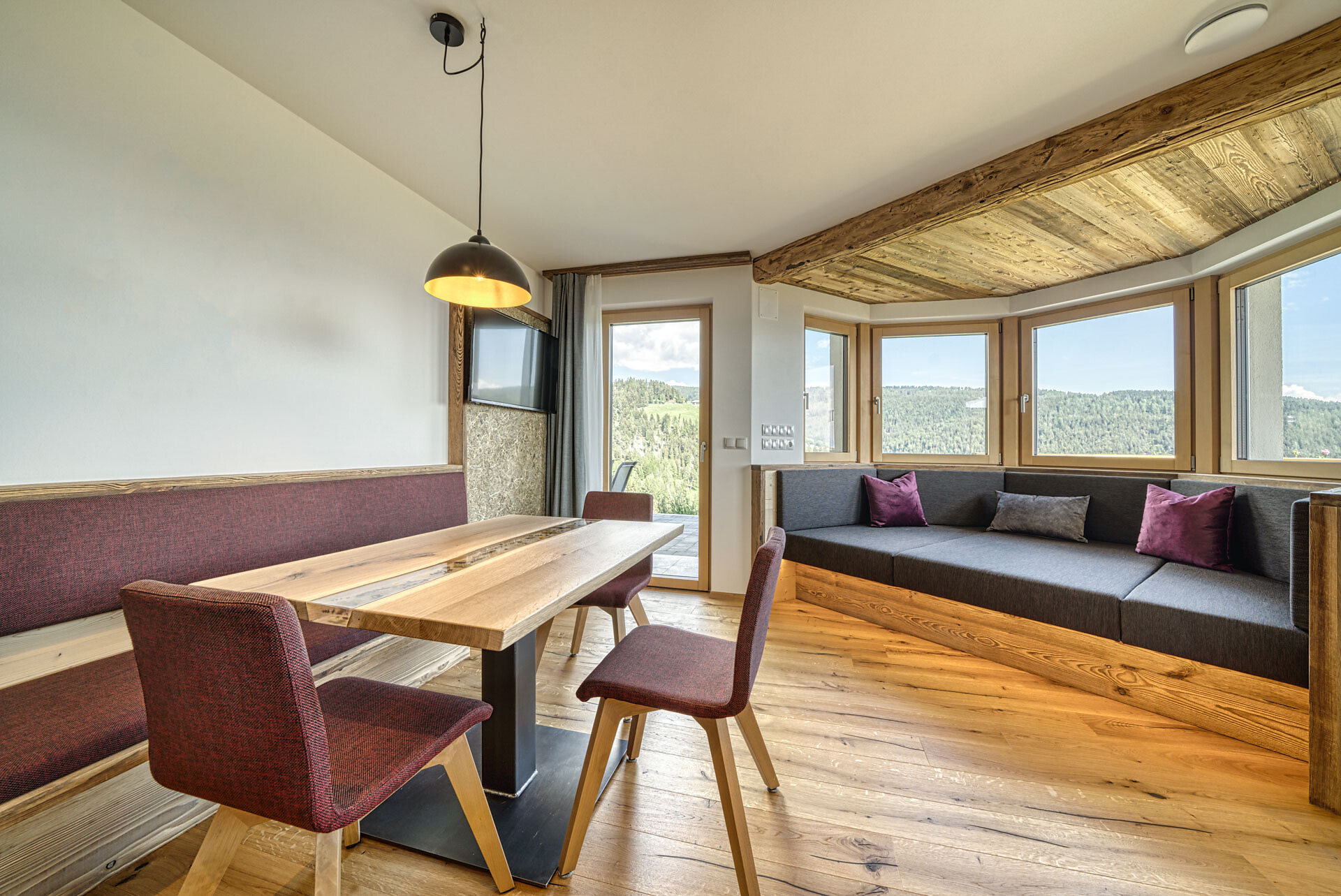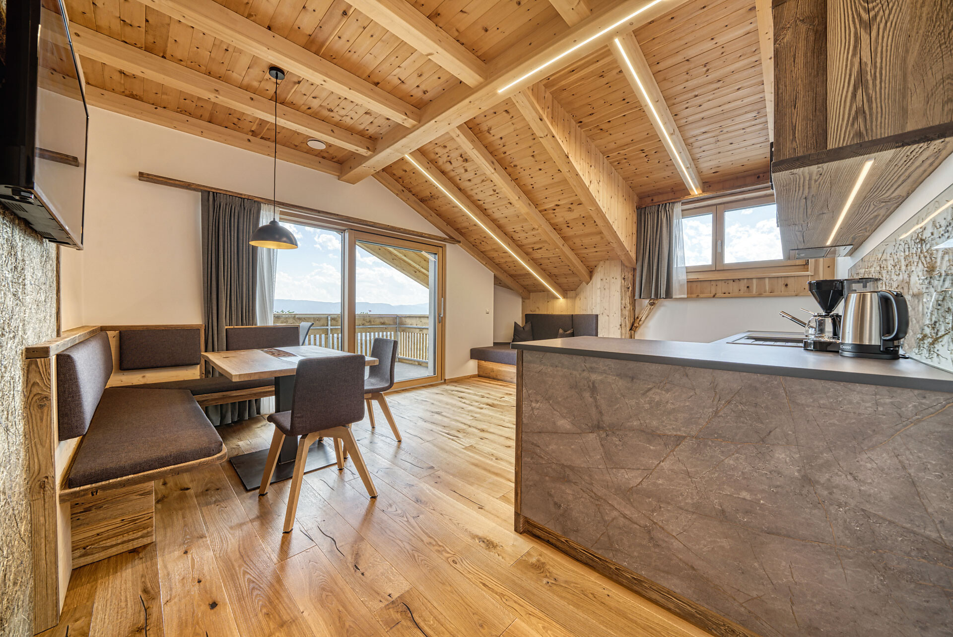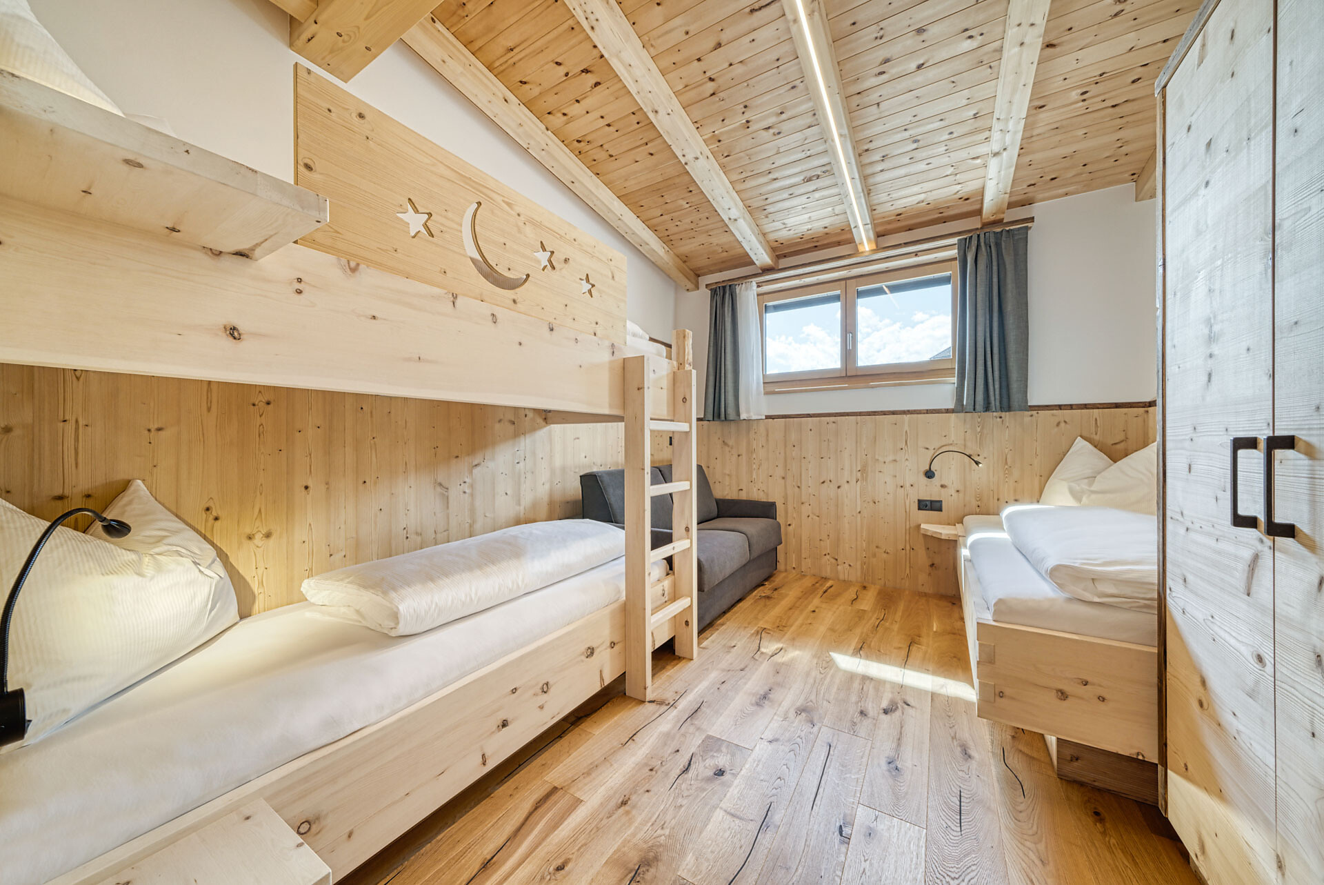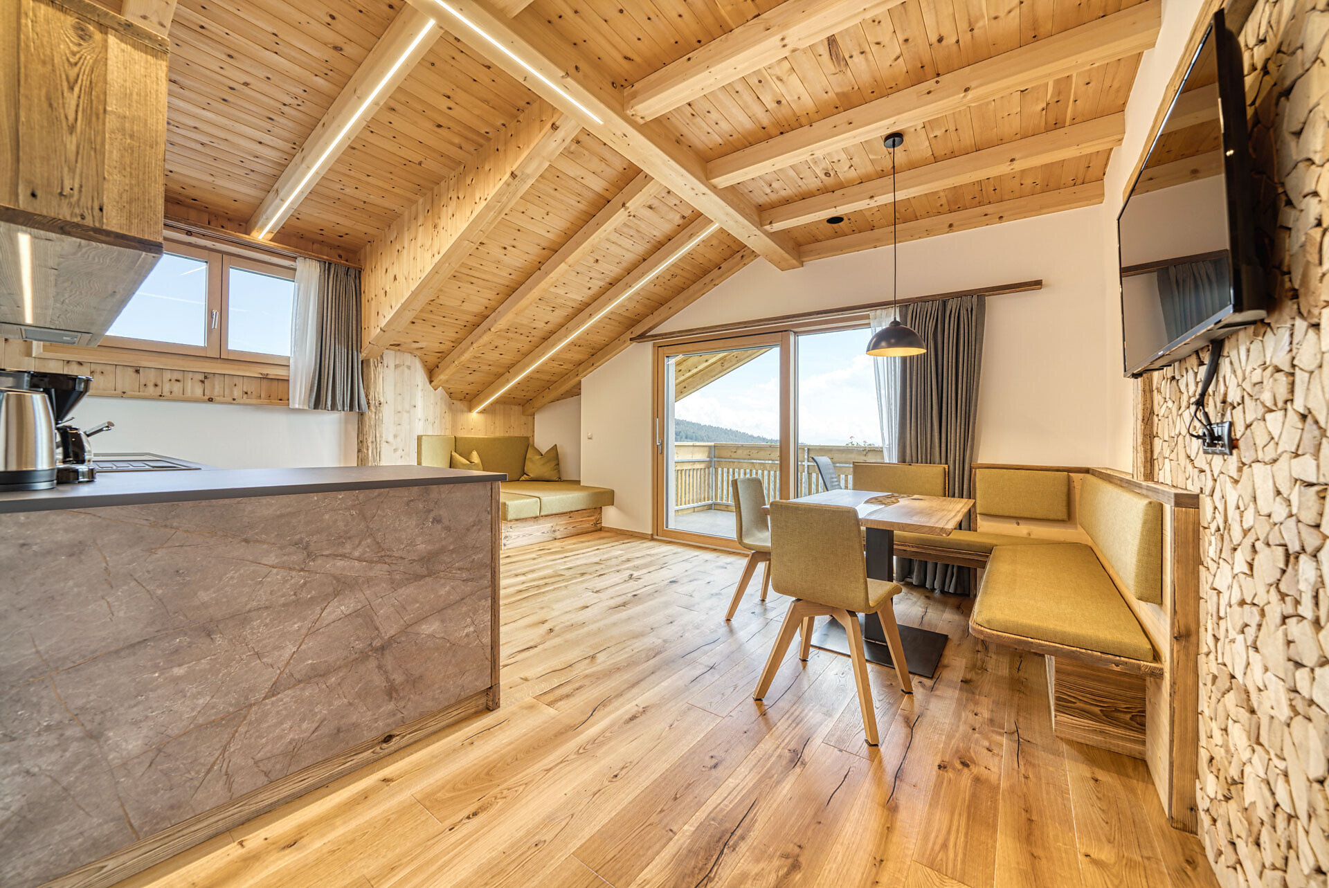 L'appartamento si trova al primo piano, lato sud, e dispone di una camera doppia con pavimento in legno, mobili in legno massiccio; una camera per bambini con alcova per letto a castello, letto singolo e divano letto, nonché pavimento in legno, mobili in legno massiccio, un bagno con doccia in vetro a parete di fieno, WC/bidet; armadio; cucina abitabile completamente attrezzata con pavimento in legno; riscaldamento a pavimento; ampio balcone con magnifica vista panoramica. Un salone (antico salone di fattoria) con giochi di societá e una biblioteca vi invita a sedervi insieme in un'atmosfera accogliente. L'appartamento è fiancheggiato da un sacco di legno di cembro.