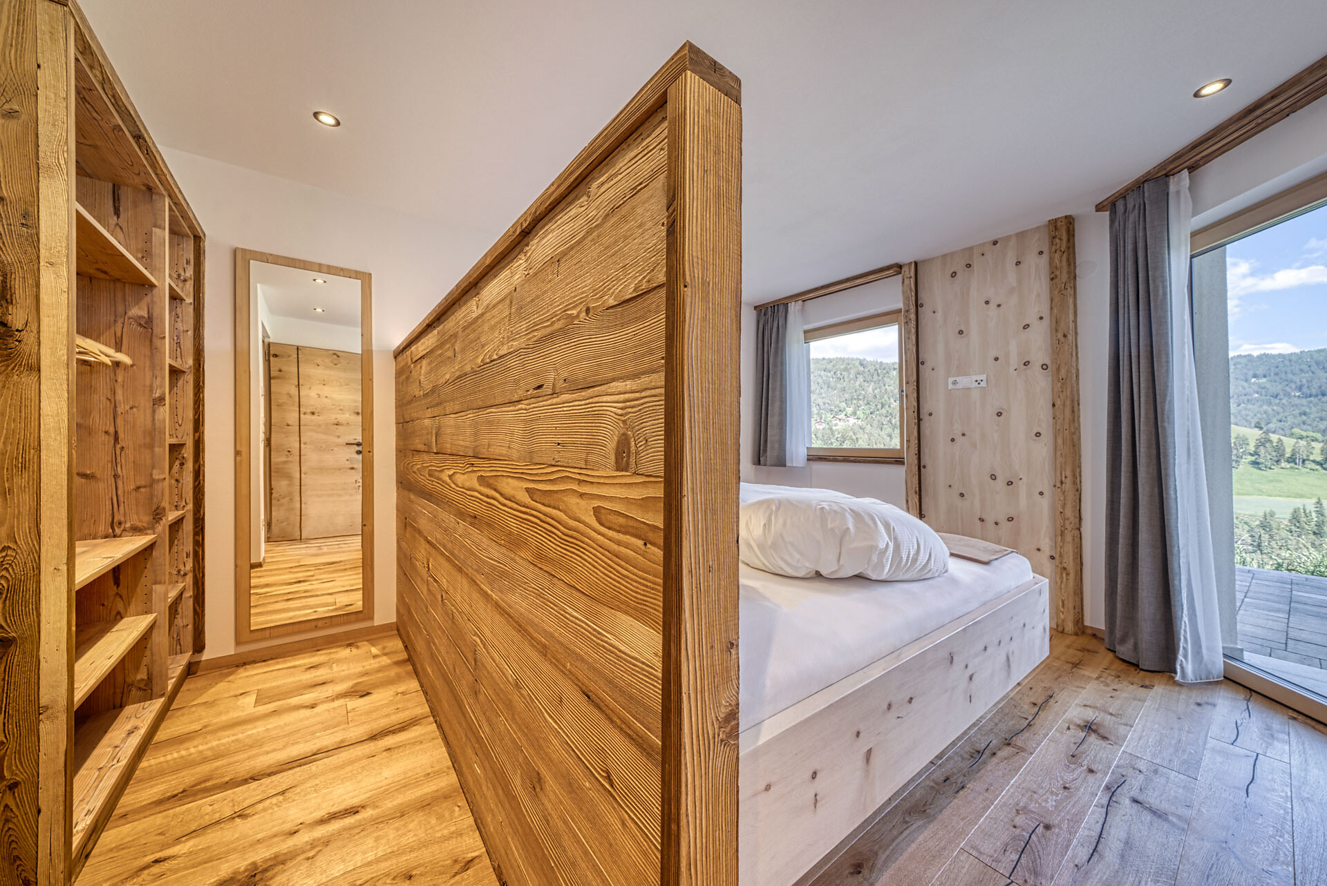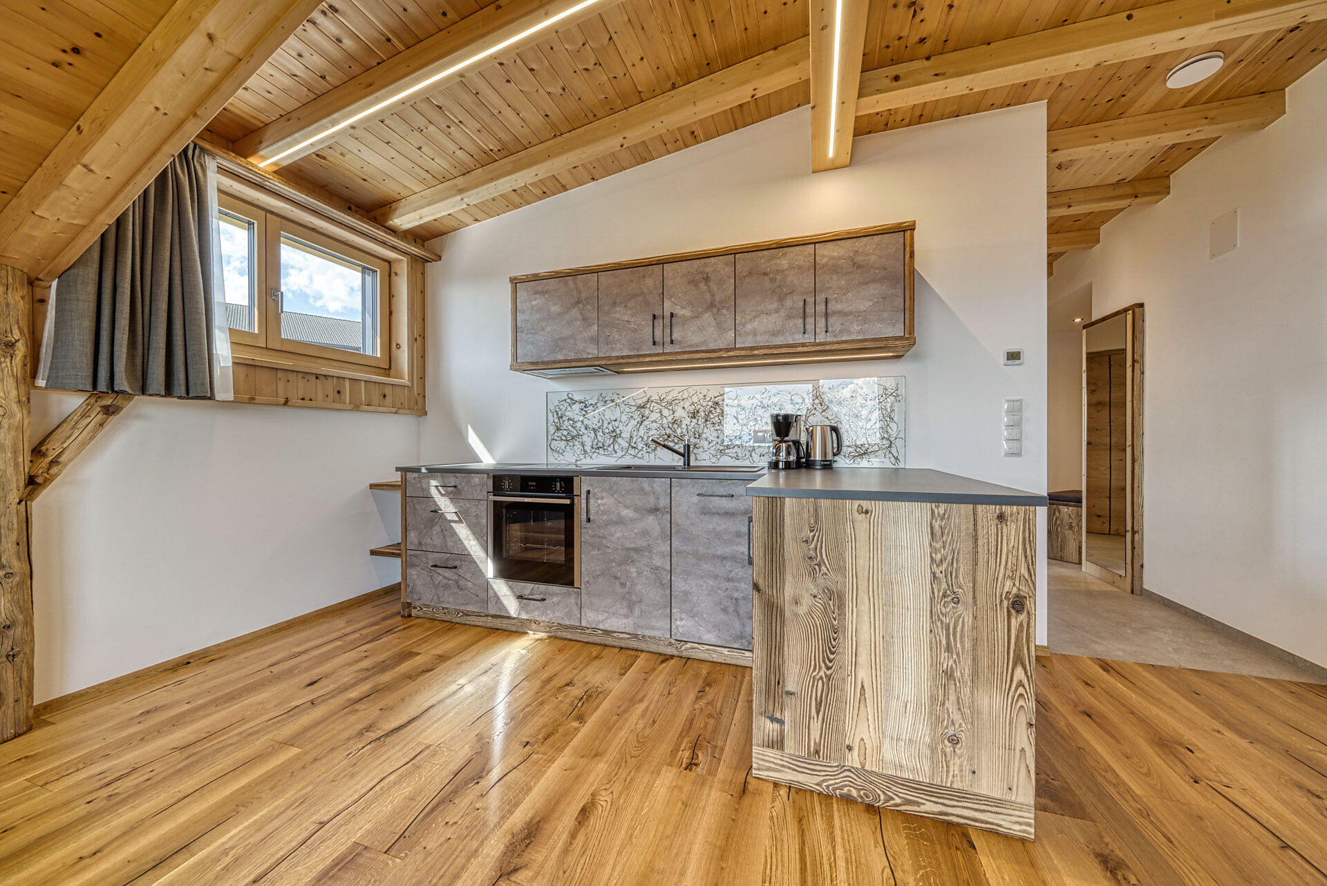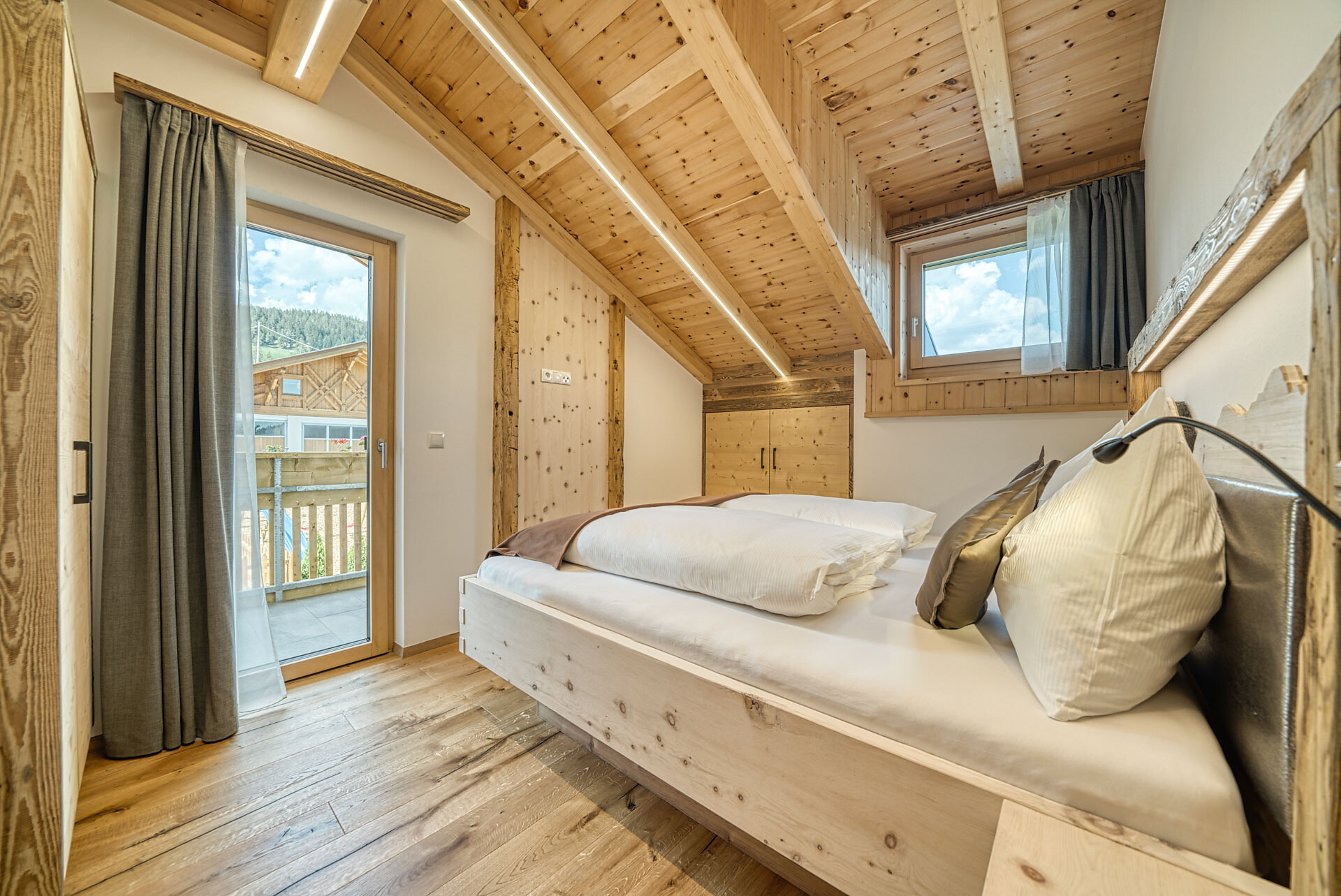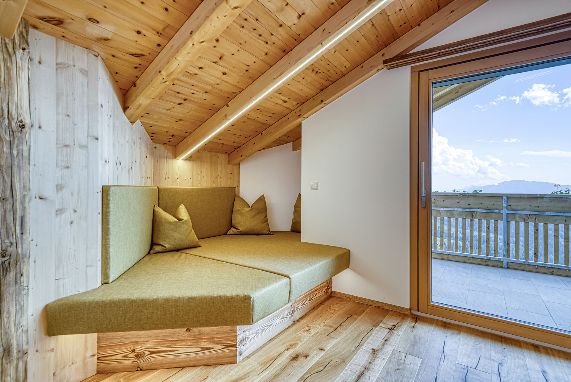 L'appartamento si trova al primo piano, lato sud, e dispone di una camera doppia con pavimento in legno, mobili in legno massiccio; una camera per bambini con alcova per letto a castello, letto singolo e divano letto, nonché pavimento in legno, mobili in legno massiccio, un bagno con doccia in vetro a parete di fieno, WC/bidet; armadio; cucina abitabile completamente attrezzata con pavimento in legno; riscaldamento a pavimento; ampio balcone con magnifica vista panoramica. Un salone (antico salone di fattoria) con giochi di societá e una biblioteca vi invita a sedervi insieme in un'atmosfera accogliente. L'appartamento è fiancheggiato da un sacco di legno di cembro.