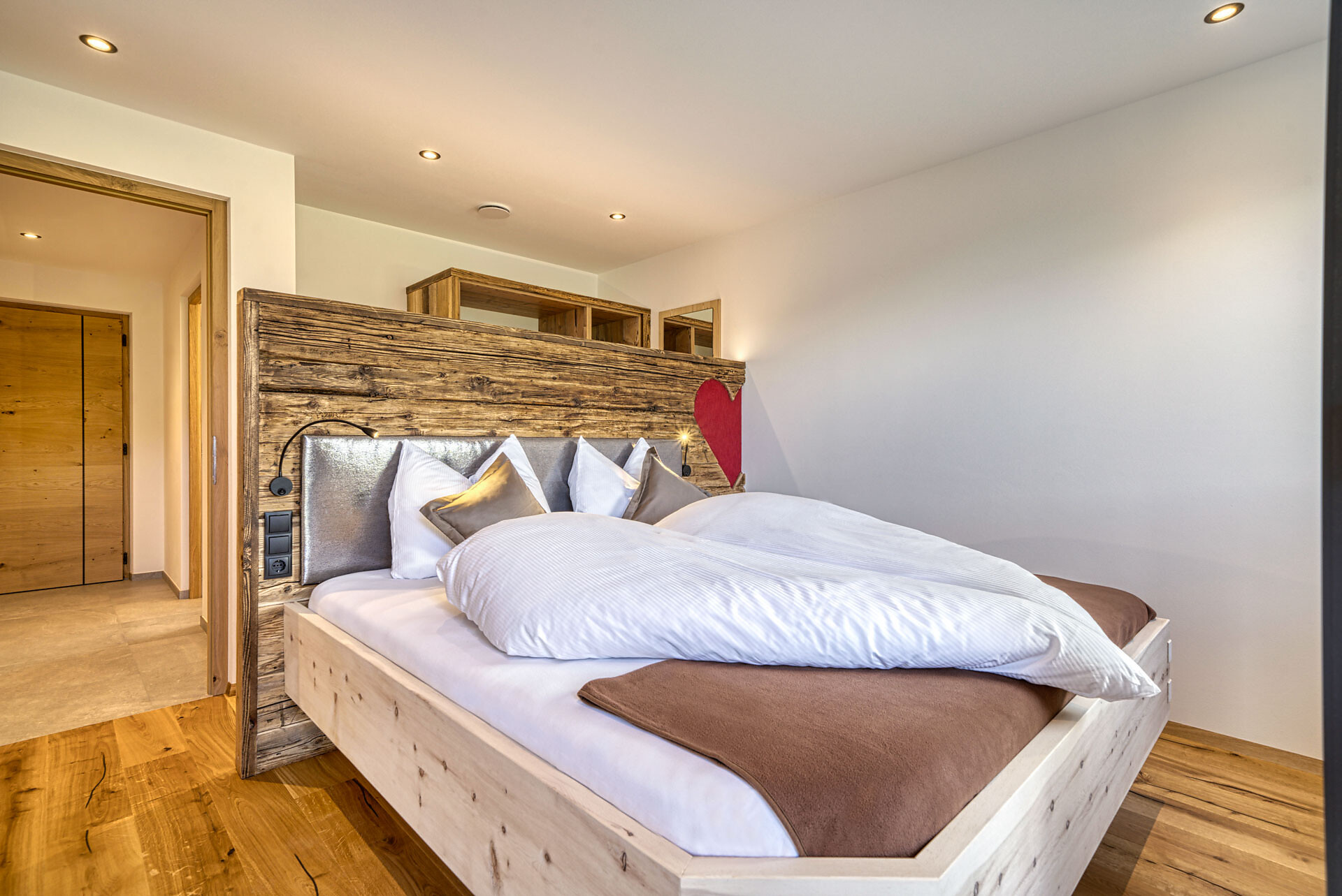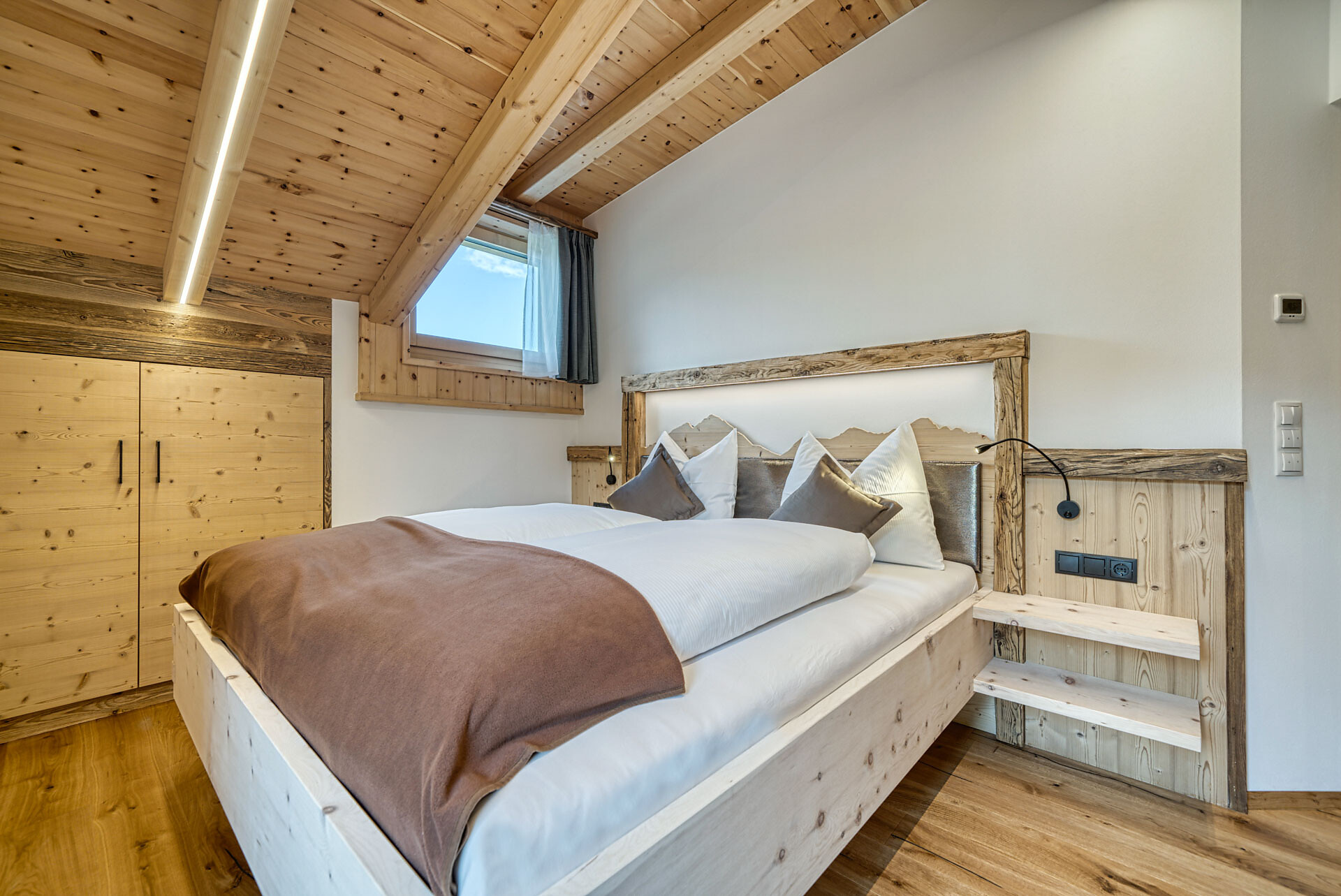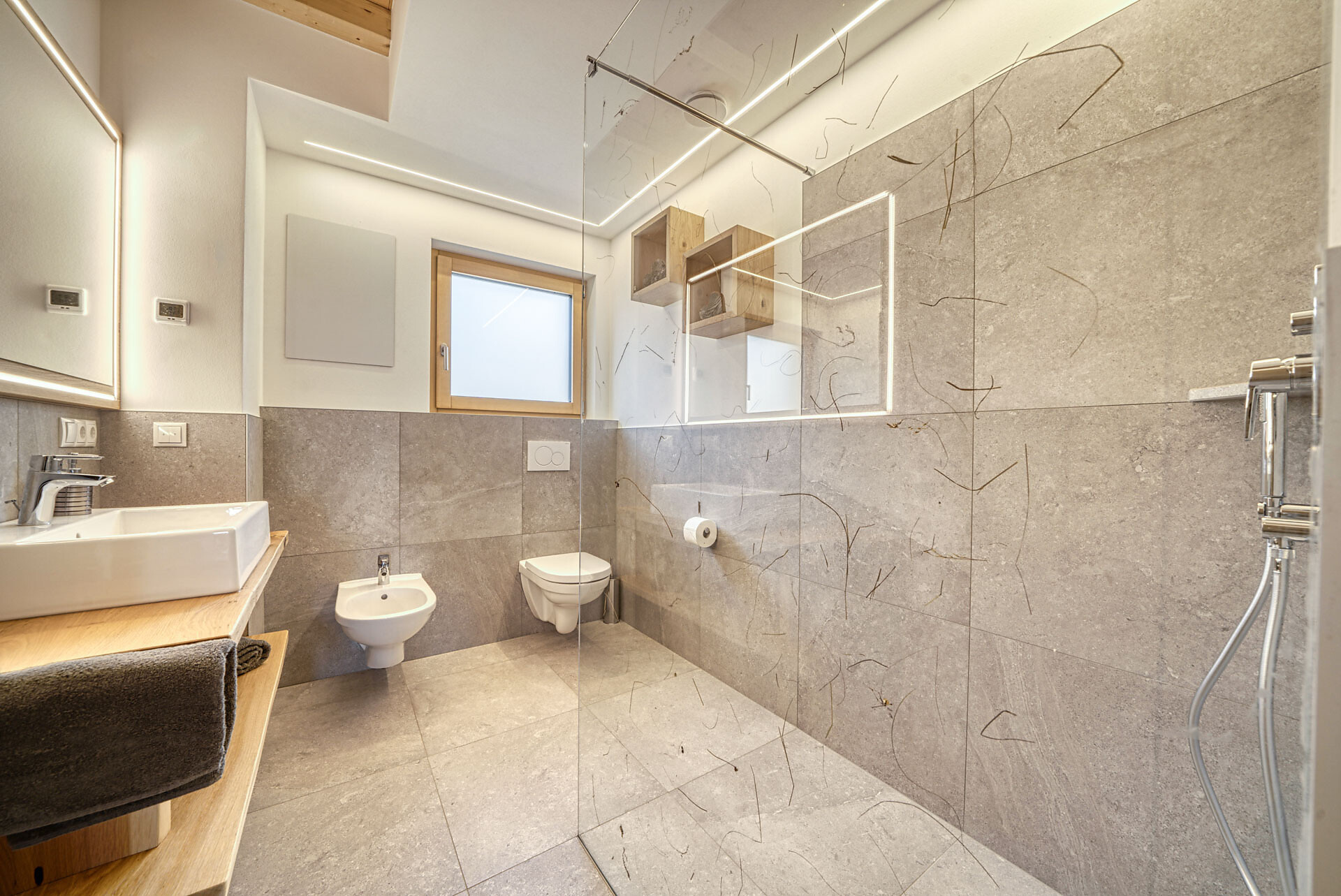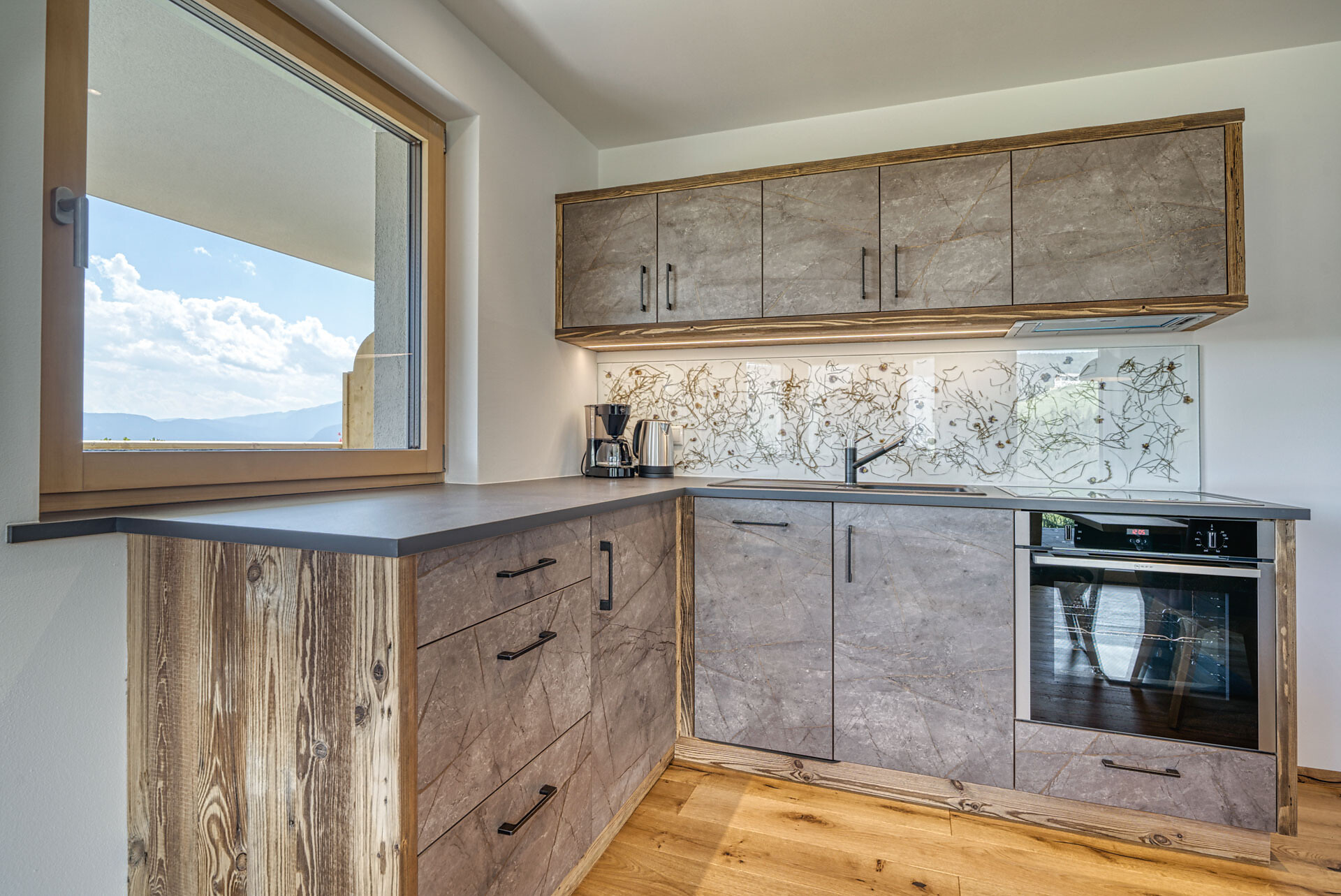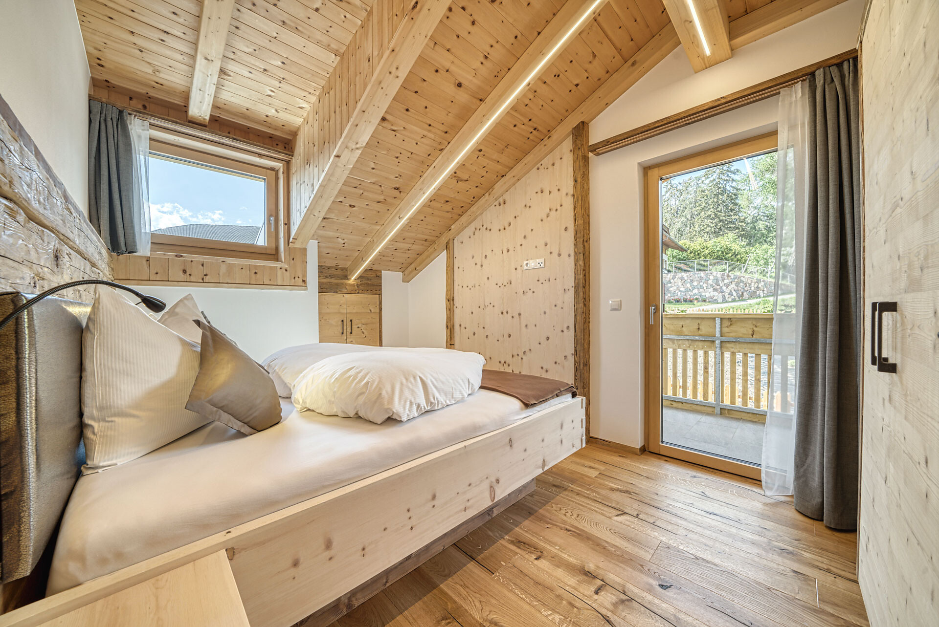 L'appartamento si trova al primo piano, lato sud, e dispone di una camera doppia con pavimento in legno, mobili in legno massiccio; una camera per bambini con alcova per letto a castello, letto singolo e divano letto, nonché pavimento in legno, mobili in legno massiccio, un bagno con doccia in vetro a parete di fieno, WC/bidet; armadio; cucina abitabile completamente attrezzata con pavimento in legno; riscaldamento a pavimento; ampio balcone con magnifica vista panoramica. Un salone (antico salone di fattoria) con giochi di societá e una biblioteca vi invita a sedervi insieme in un'atmosfera accogliente. L'appartamento è fiancheggiato da un sacco di legno di cembro.