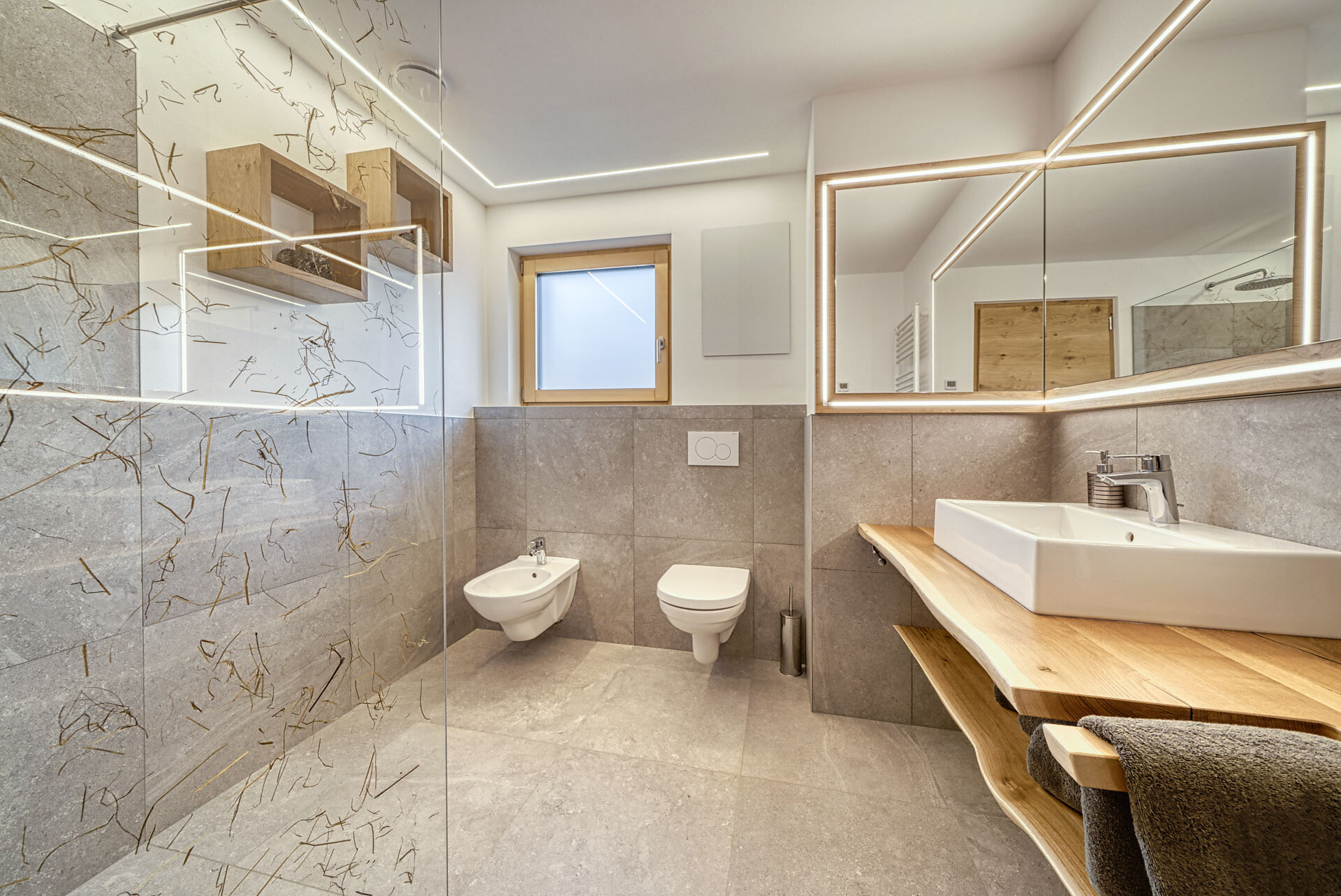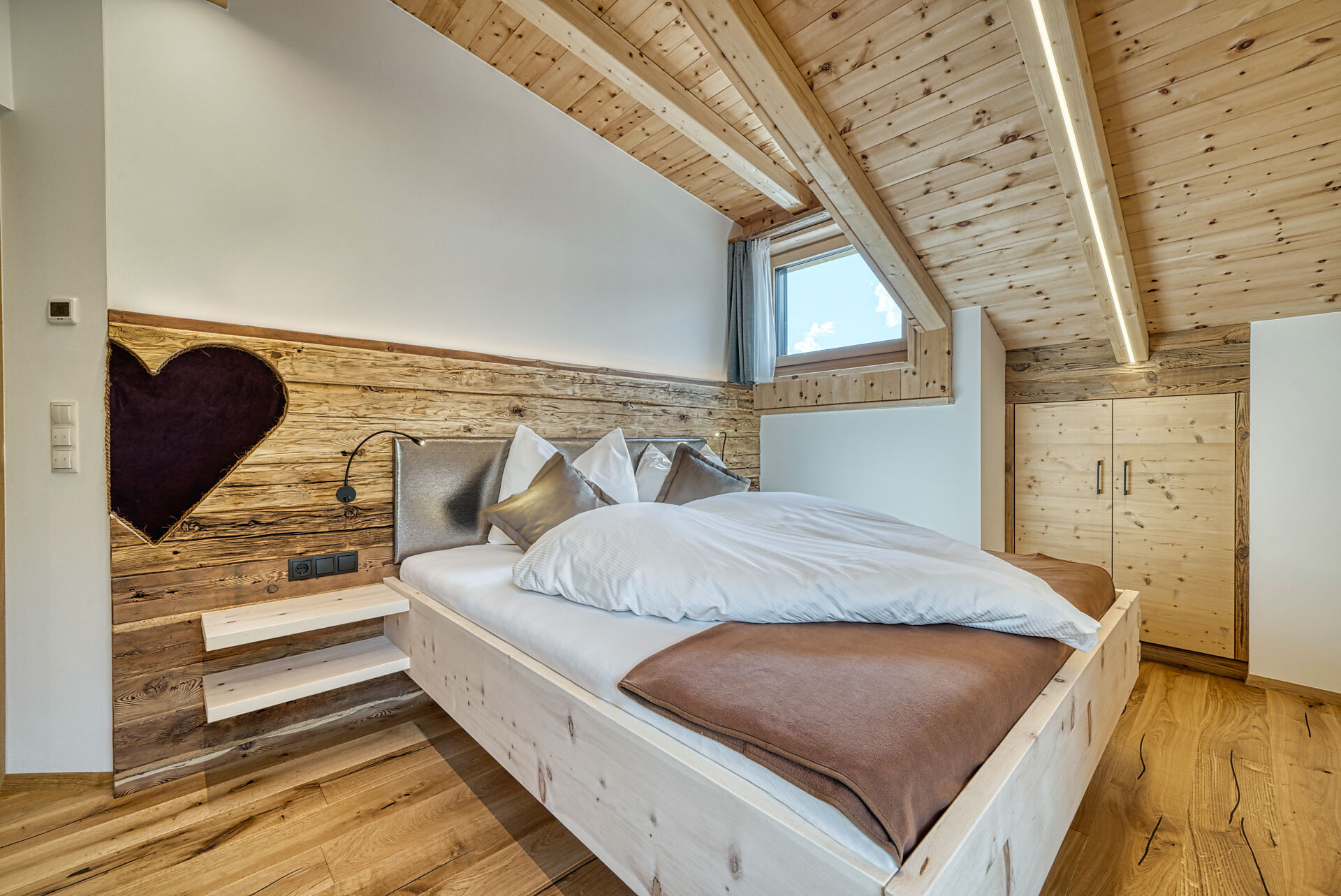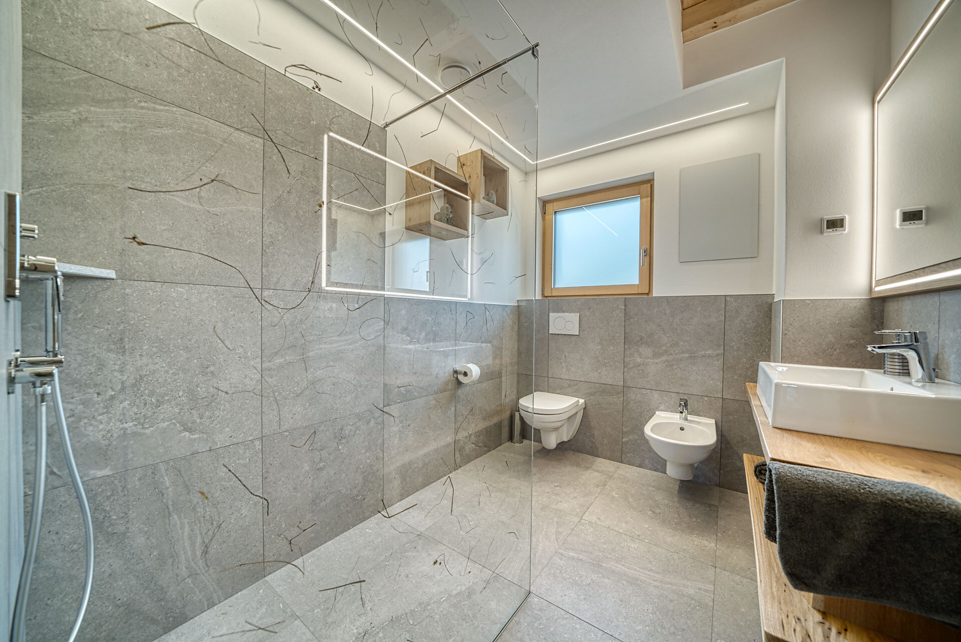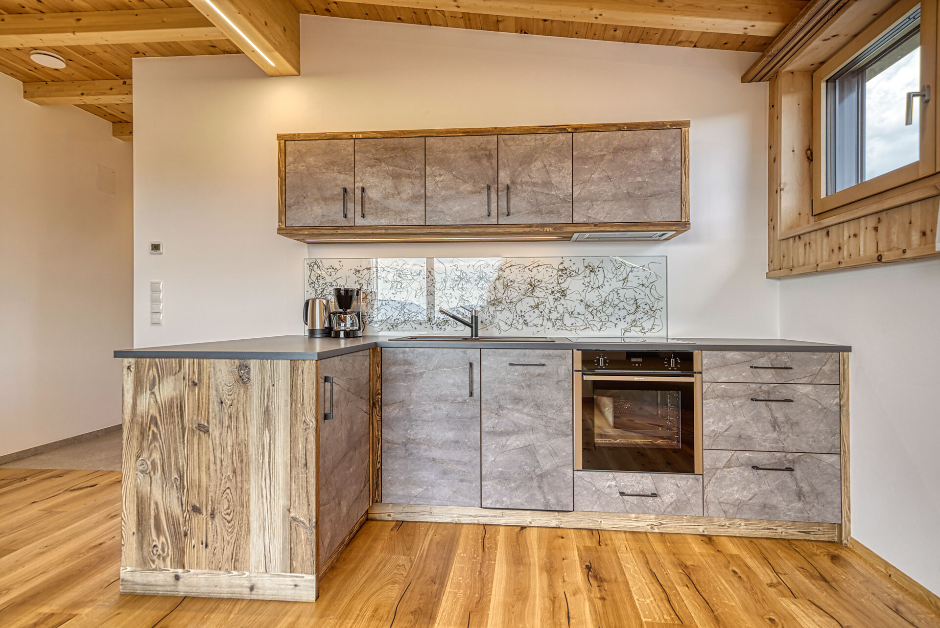 L'appartamento si trova al primo piano, lato sud, e dispone di una camera doppia con pavimento in legno, mobili in legno massiccio; una camera per bambini con alcova per letto a castello, letto singolo e divano letto, nonché pavimento in legno, mobili in legno massiccio, un bagno con doccia in vetro a parete di fieno, WC/bidet; armadio; cucina abitabile completamente attrezzata con pavimento in legno; riscaldamento a pavimento; ampio balcone con magnifica vista panoramica. Un salone (antico salone di fattoria) con giochi di societá e una biblioteca vi invita a sedervi insieme in un'atmosfera accogliente. L'appartamento è fiancheggiato da un sacco di legno di cembro.