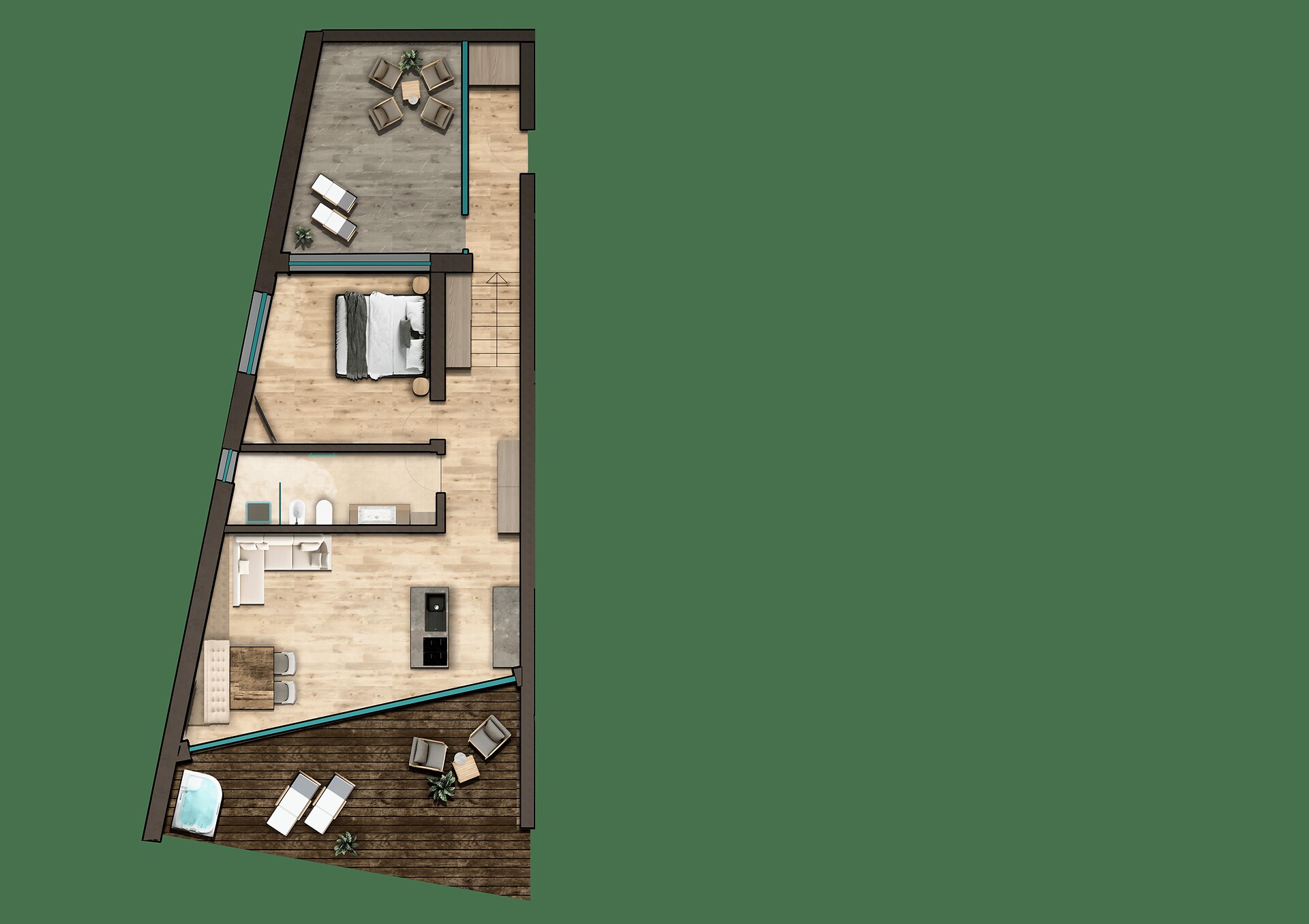 Appartamento per 2-4 persone, confortevole camera da letto matrimoniale, accogliente cucina/soggiorno con divano letto, spazioso bagno wellness, cucina completamente attrezzata con lavastoviglie, riscaldamento/aria condizionata a pavimento, TV satellitare, WiFi, cassaforte, ampia terrazza con tavolo, lettini e vasca idromassaggio privata all'aperto, posto auto in garage.