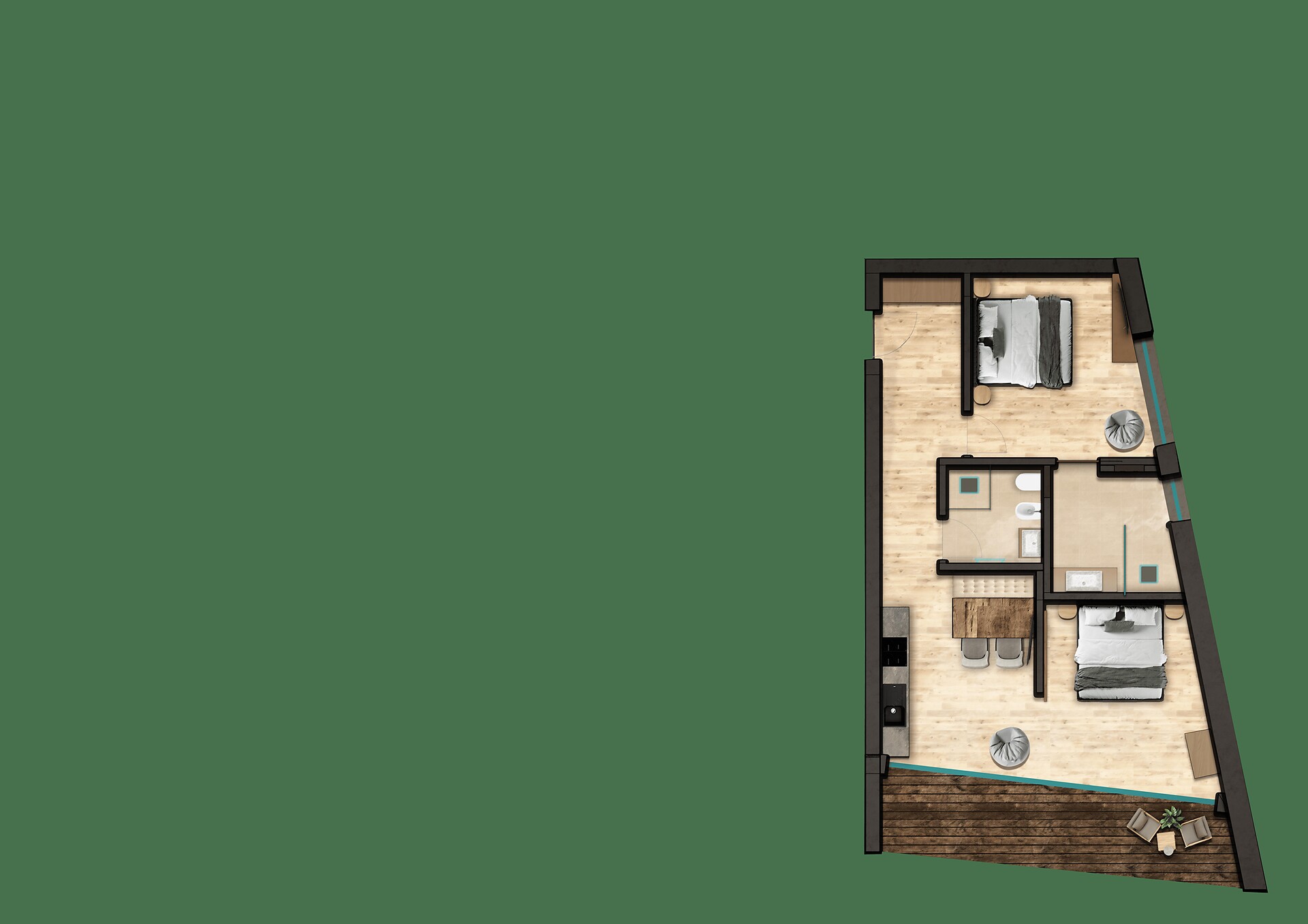 Appartamento per 2-4 persone, due confortevoli camere da letto matrimoniali, accogliente cucina abitabile, due spaziosi bagni benessere, cucina completamente attrezzata con lavastoviglie, riscaldamento/aria condizionata a pavimento, TV satellitare, W-Lan, cassaforte, ampia terrazza con accesso al giardino, tavolo e sedie a sdraio, posto auto scoperto.