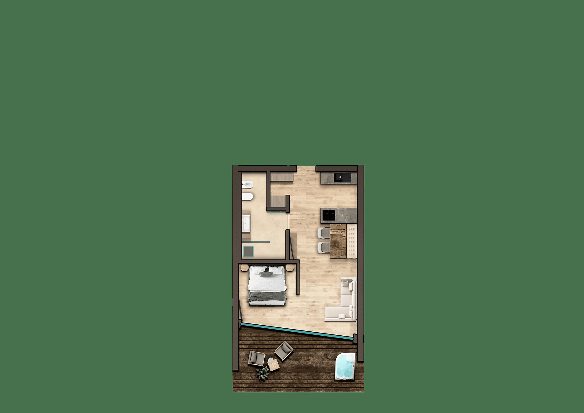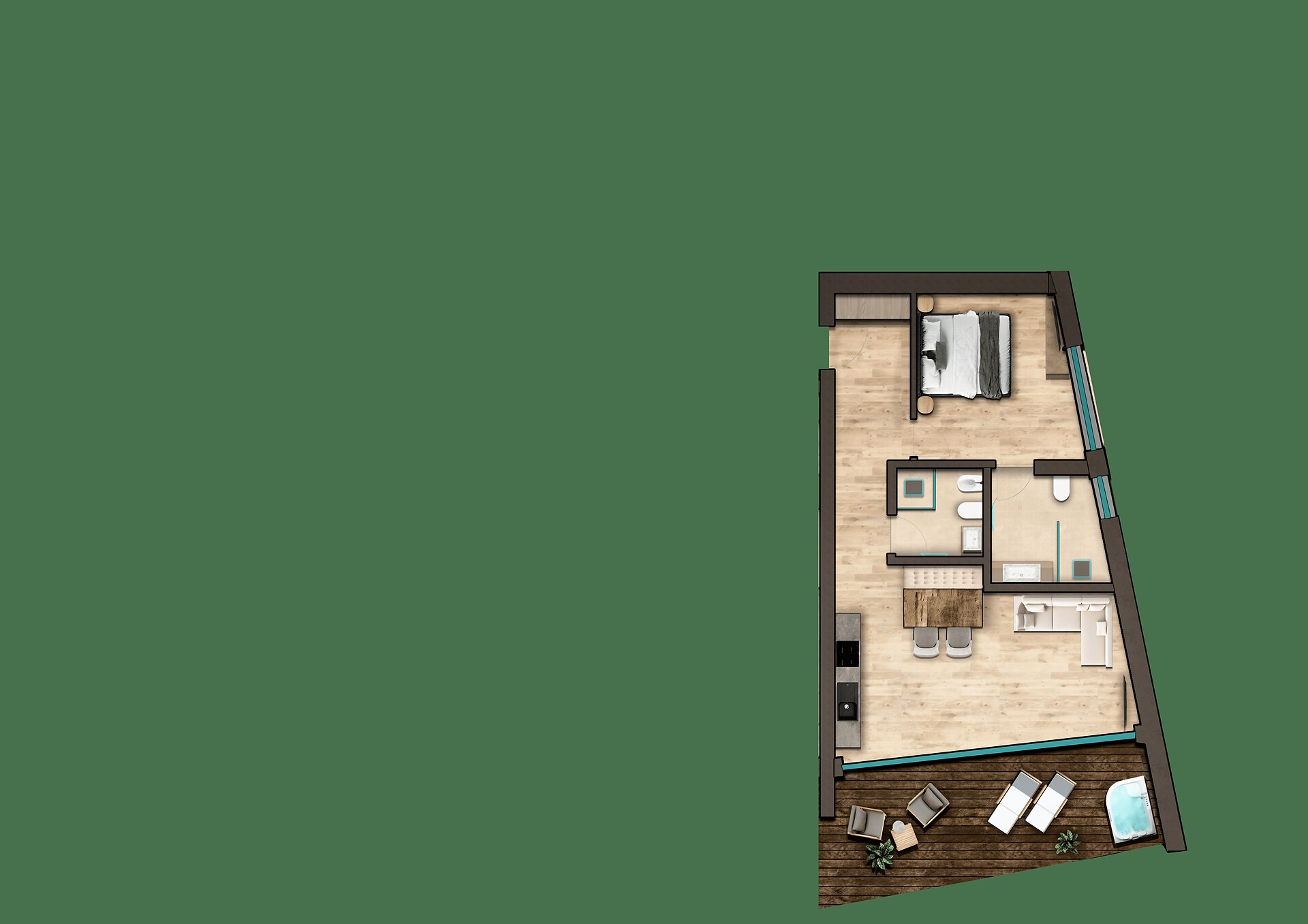 Appartamento per 2-4 persone, confortevole camera da letto matrimoniale, accogliente cucina/soggiorno con divano letto, spazioso bagno wellness, cucina completamente attrezzata con lavastoviglie, riscaldamento a pavimento/aria condizionata, TV satellitare, WiFi, cassaforte, ampia terrazza con tavolo, lettini e vasca idromassaggio privata all'aperto, posto auto in garage.