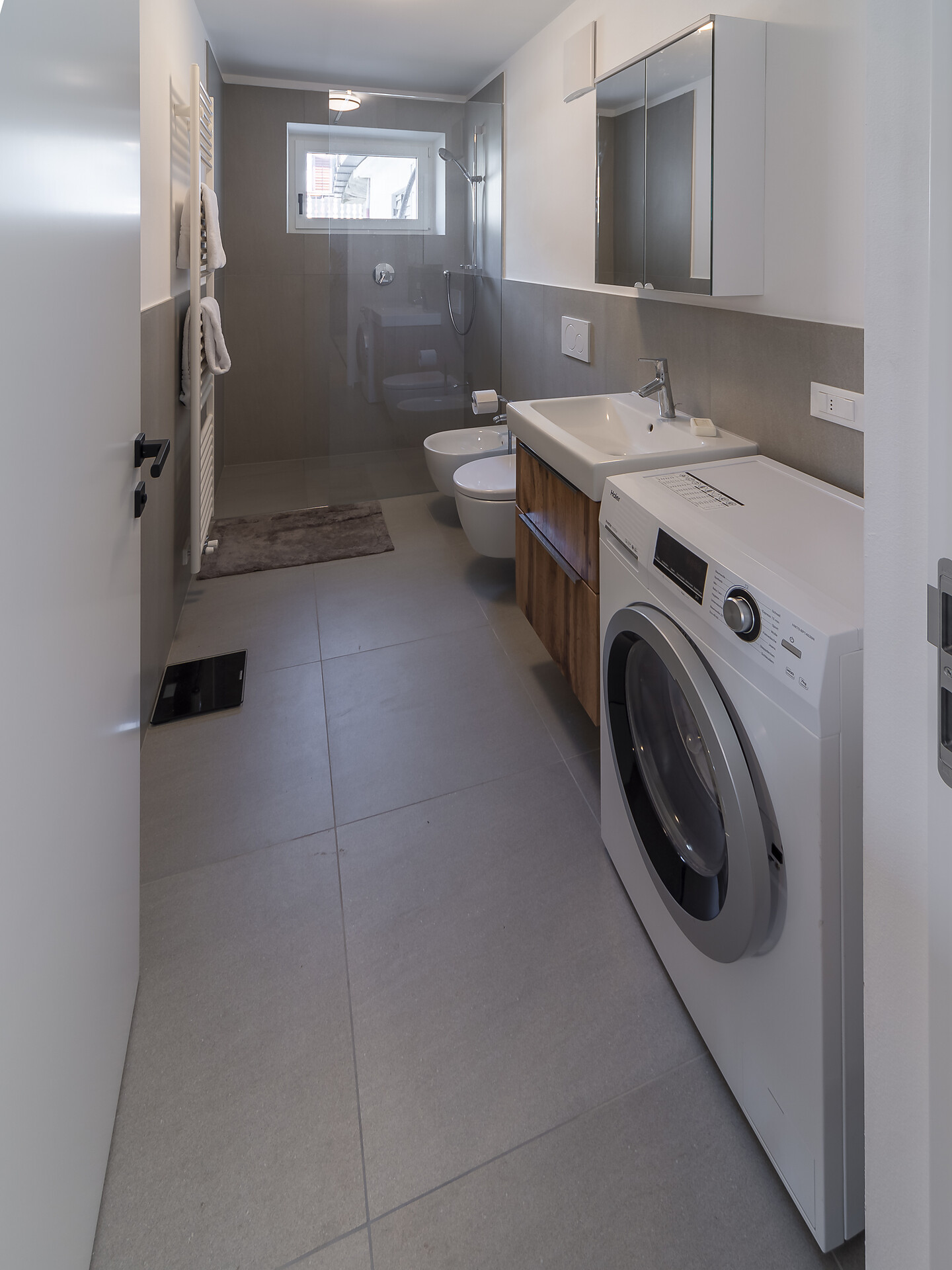 L'appartamento in riva al torrente è completamente attrezzato con cucina di design, macchina per il caffè espresso, lavatrice in bagno, tre TV, Wi-Fi, griglia elettrica sul grande balcone, radiatore per asciugamani in bagno e molto altro ancora.
