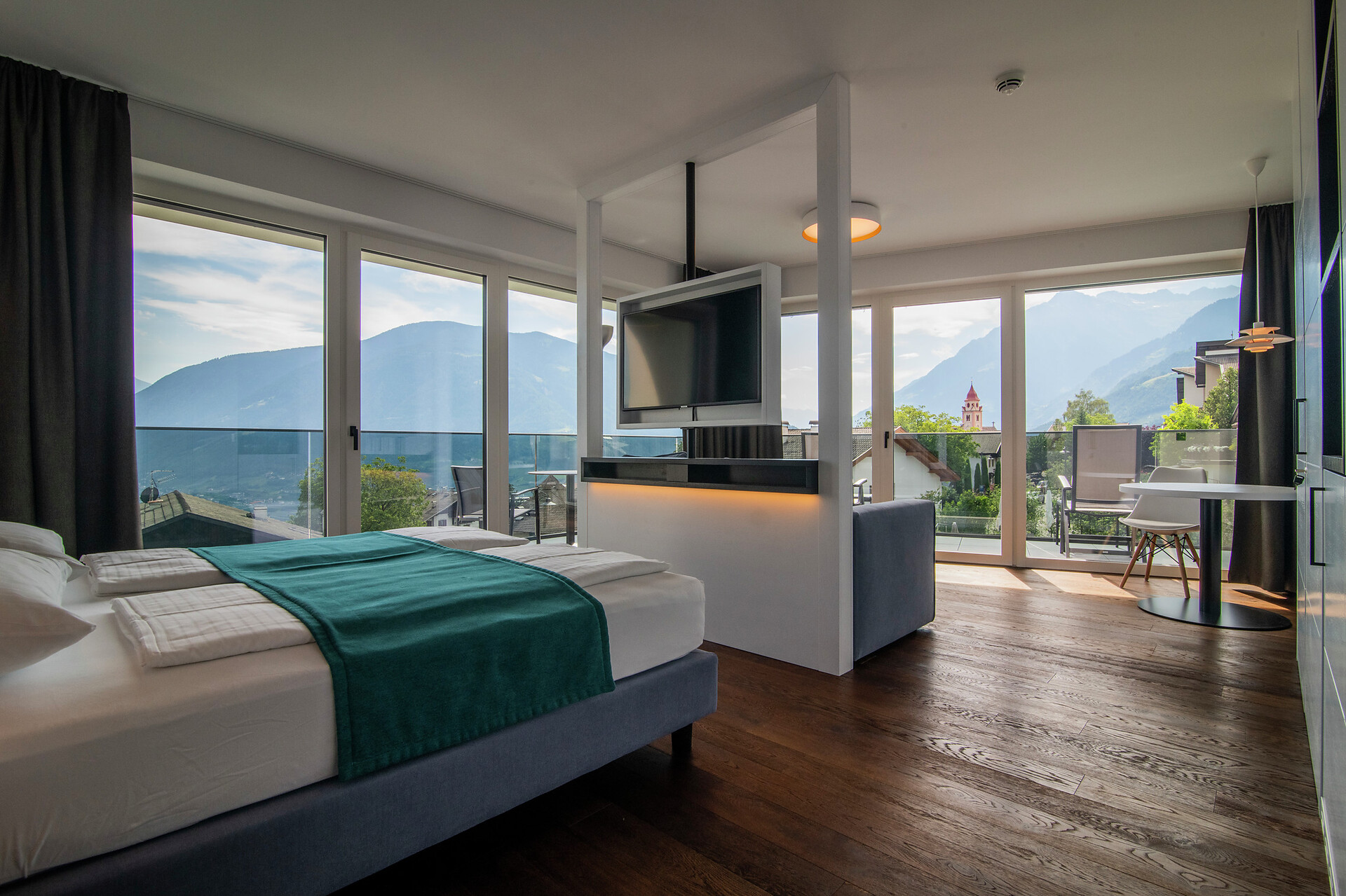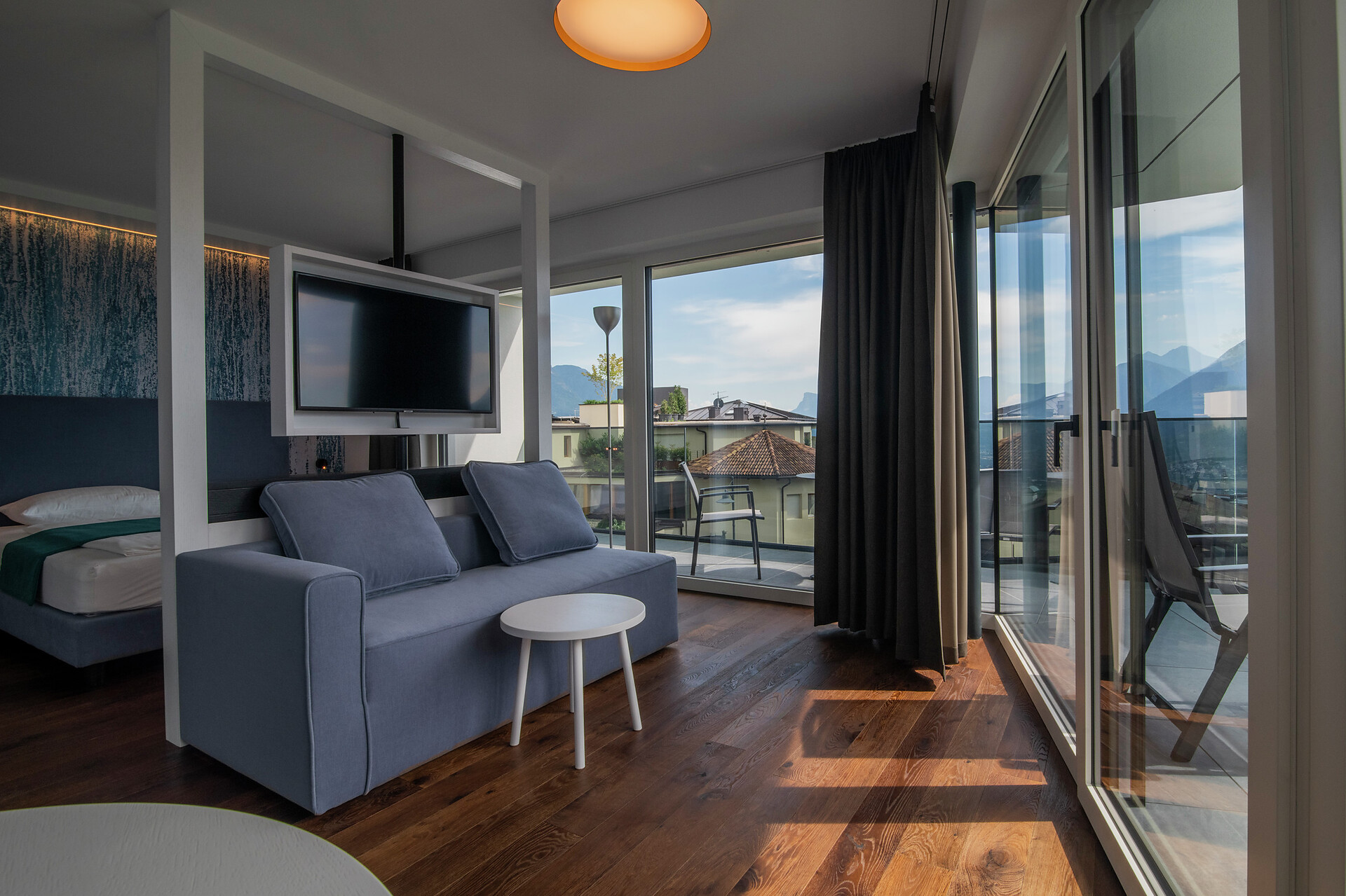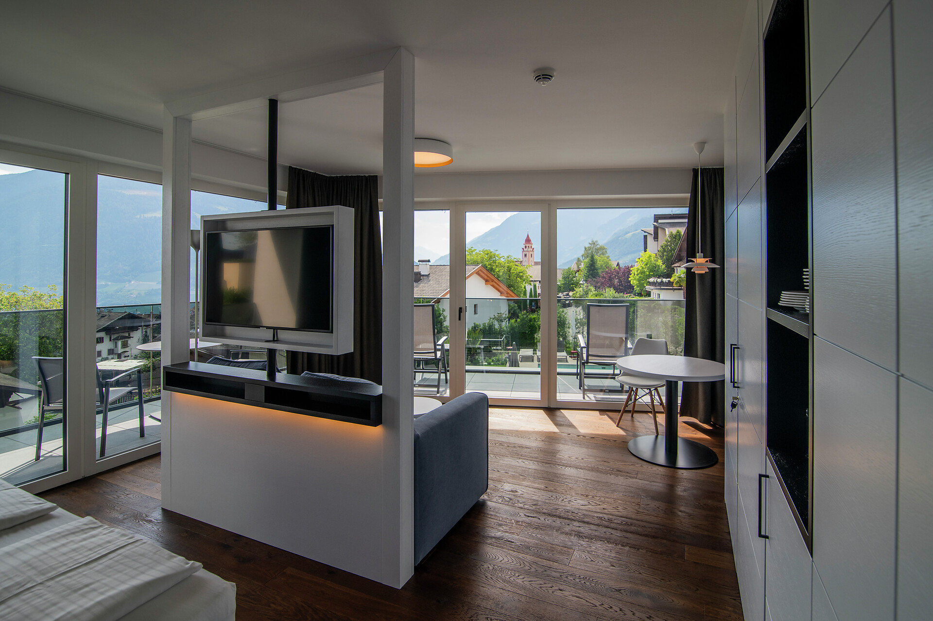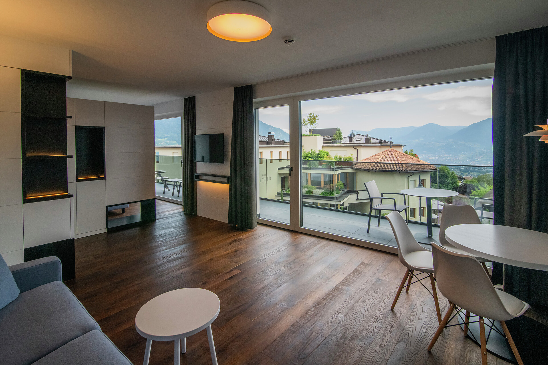 L'appartamento Tschigat ha 38,26 mq, una zona notte, una zona giorno e pranzo e balconi.