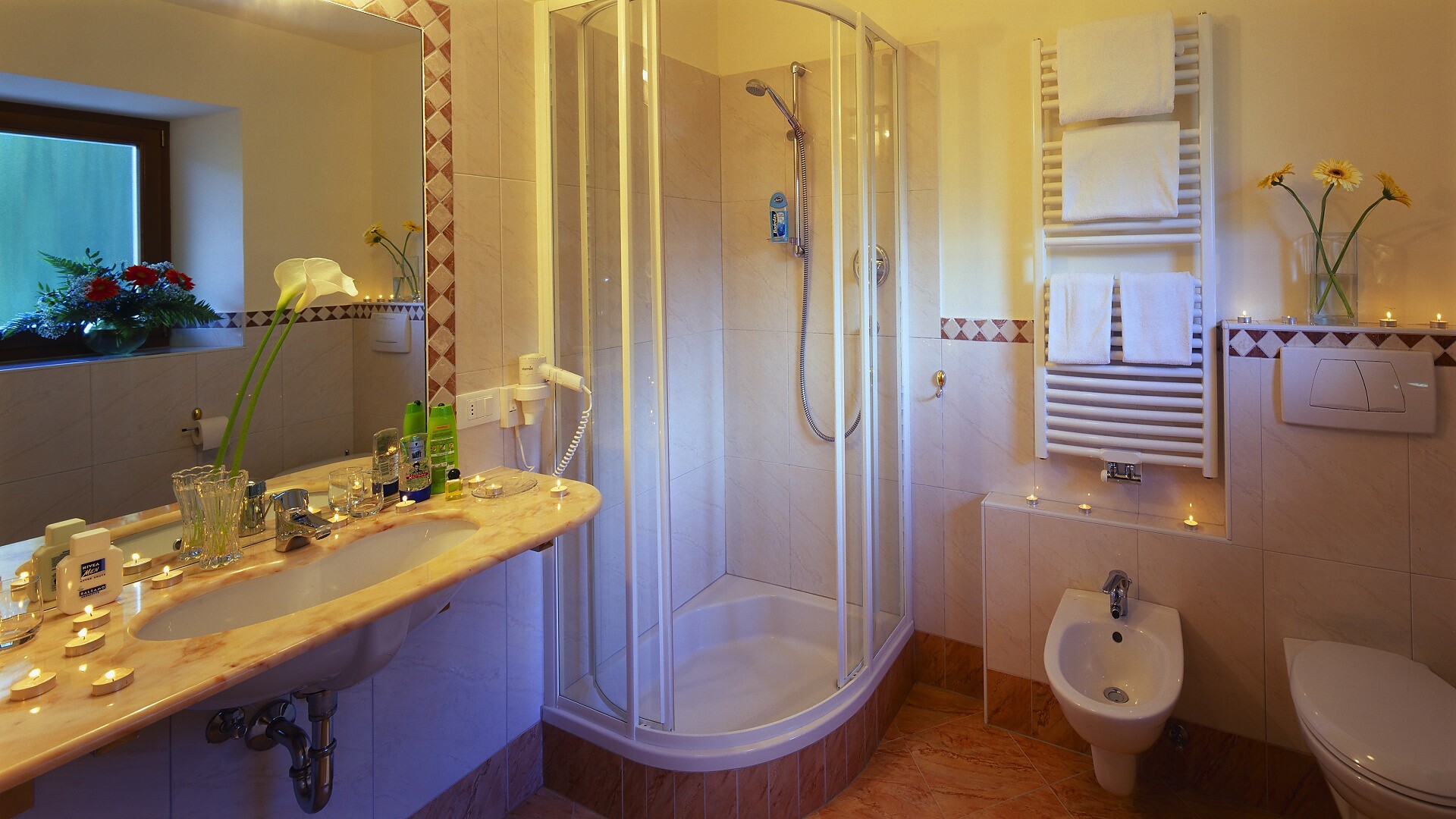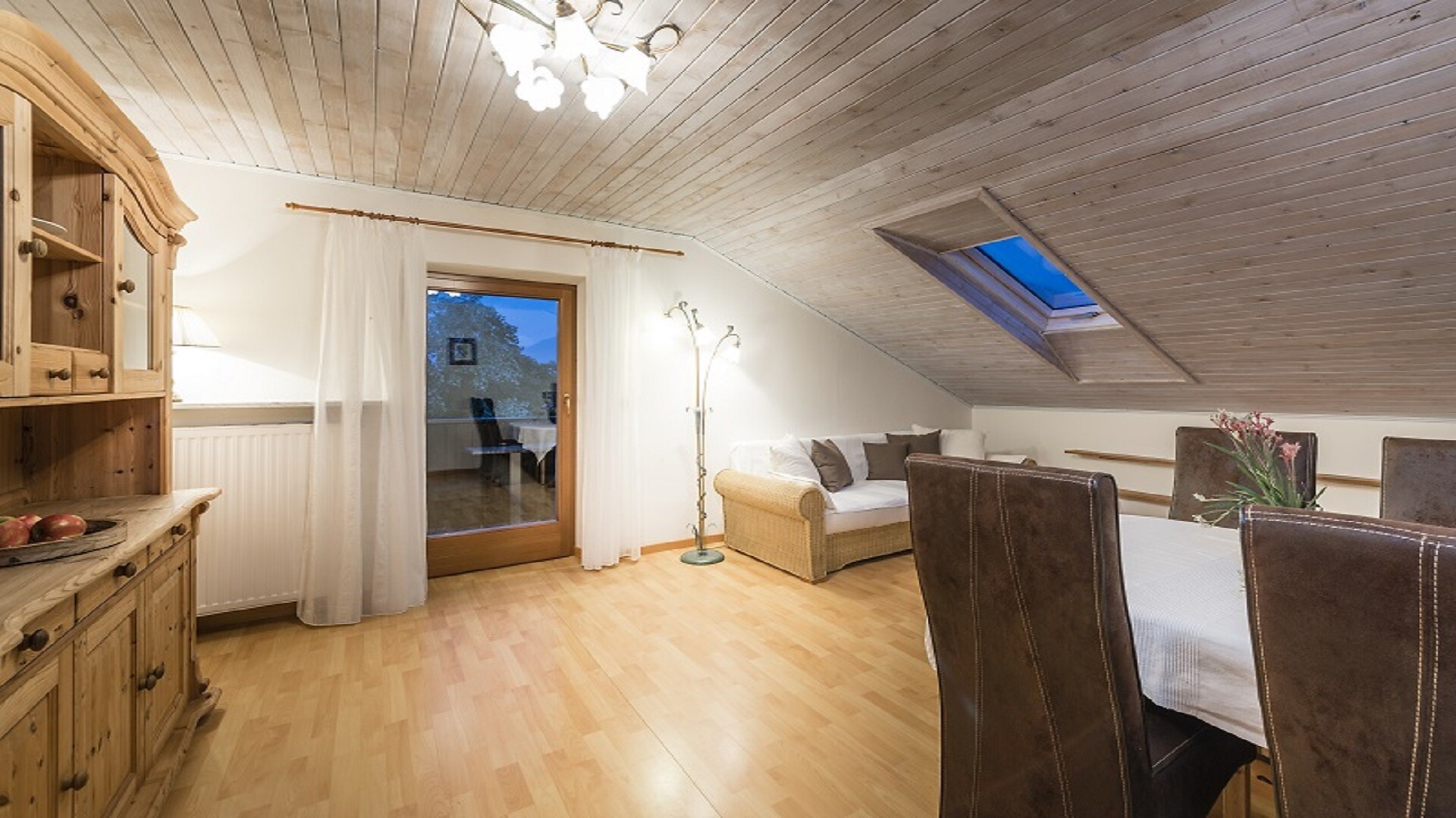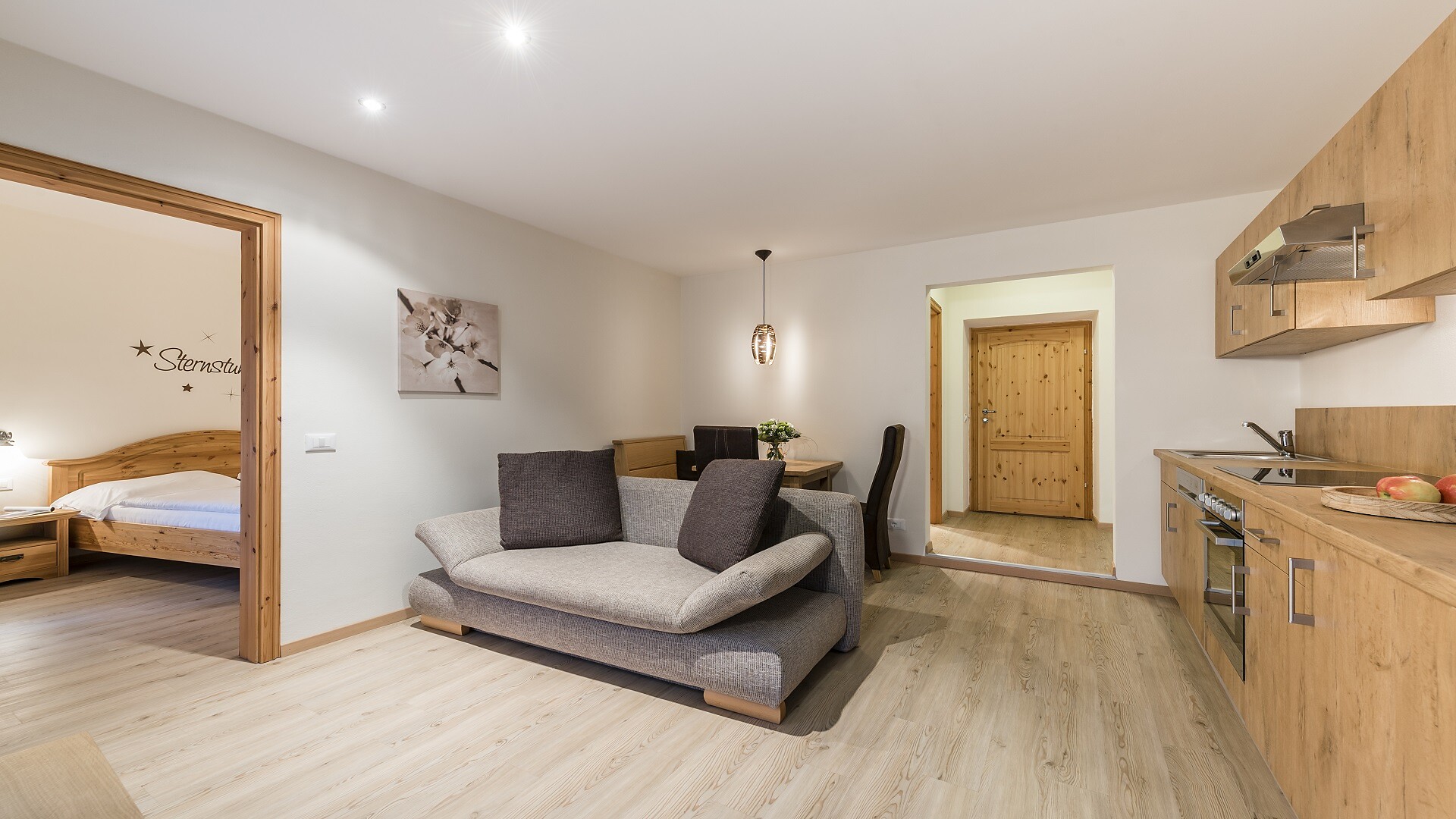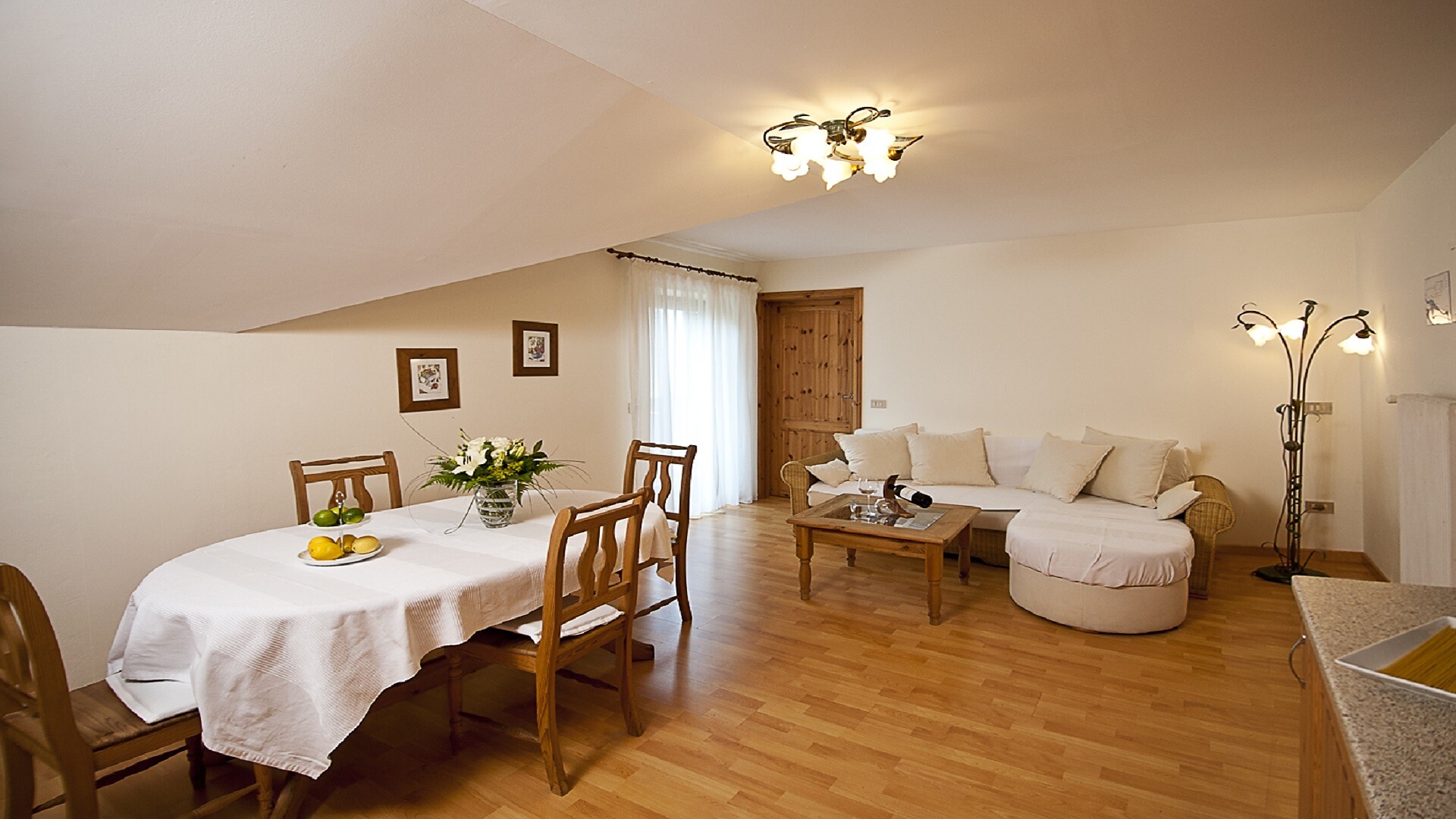 Trilocale con balcone panoramico esposto a sud e vista sulla valle, arredamento di pregio, due camere da letto matrimoniali separate, di cui una con divano letto matrimoniale aggiuntivo, soggiorno con angolo salotto per 6 persone, divano letto matrimoniale (1200 x 200cm di superficie sdraio), angolo cottura con frigorifero, piano cottura in vetroceramica, bollitore elettrico, lavastoviglie, forno, tostapane, macchina da caffè (alla tedesca), teiera, TV satellitare a schermo piatto 32", radio, cassaforte elettronica, Wi-Fi gratuito, bagno con doppio lavabo, doccia, WC, bidet, asciugacapelli. Mobili da balcone, ombrellone, stendibiancheria.