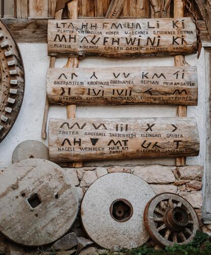 Quando venivano effettuati tagli in più strisce di bosco o anche in foreste private, era necessario assegnare ogni tronco al suo proprietario. Qui entravano in gioco i marchi del legno: ogni maso possedeva il proprio segno distintivo, che il boscaiolo incideva sul lato più spesso del tronco, leggermente distante dall’estremità, dopo averlo scortecciato. Ad esempio, una “T” per il maso Tribus Wiesgut, “WI” per Wieser Gasser, “MT” per Mair am Turm. Non tutti i segni, però, contenevano le iniziali del nome del maso o della famiglia: molti erano semplici forme geometriche. È probabile che risalgano già al XVIII secolo, poiché la prima suddivisione del bosco avvenne nel 1710.