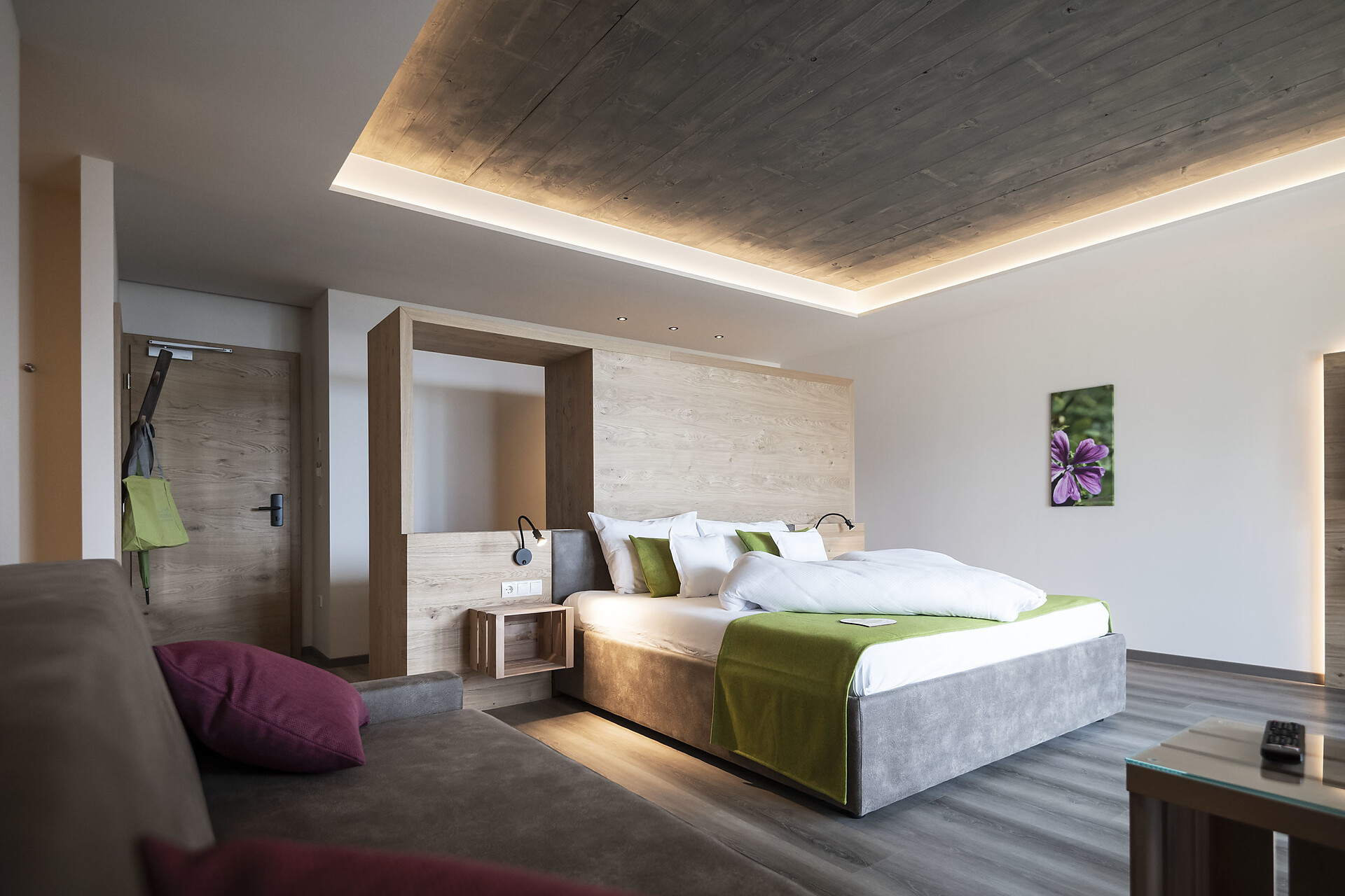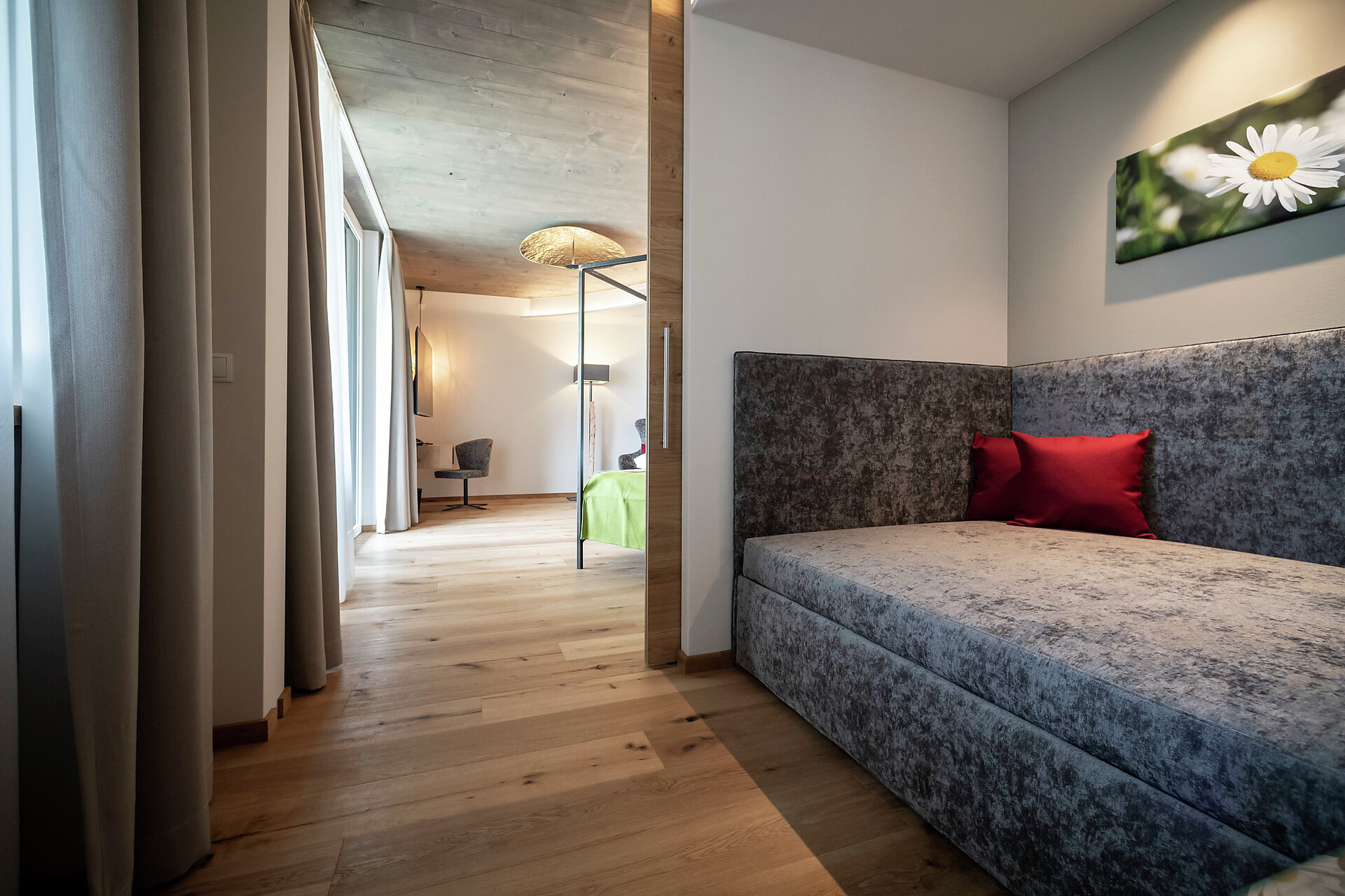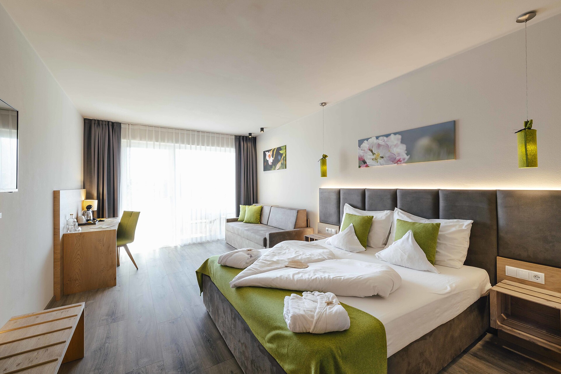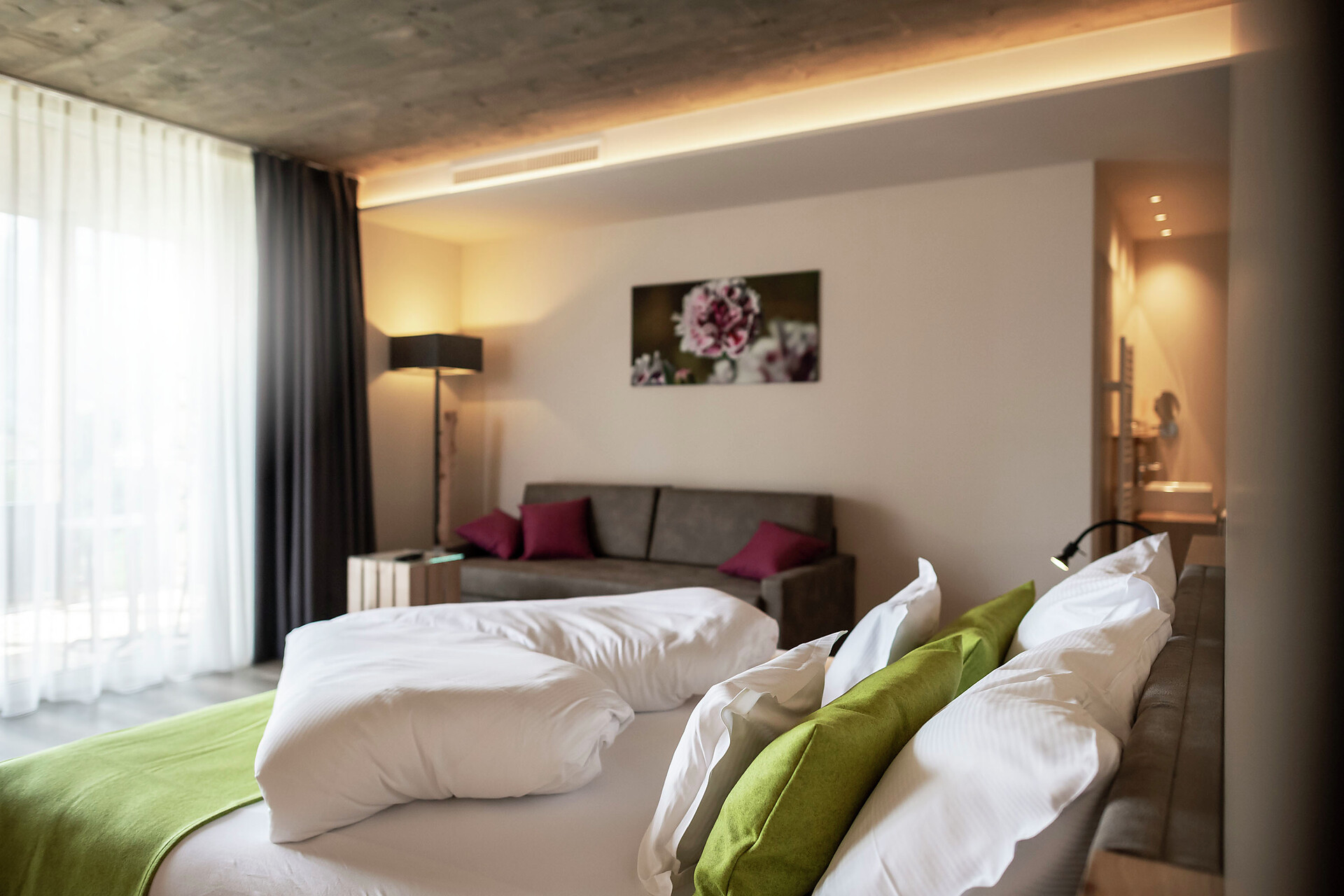 Luminosa Suite con camera da letto e zona giorno separata. Il punto culminante è la vasca idromassaggio Hotspring sul privato balcone panoramico rivolto a sud. Bagno elegante, dotato di doccia a pioggia, asciugacapelli e bidet, frigorifero, macchina per espresso, set da tè, WiFi, 2 TV, cassaforte, aria condizionata.