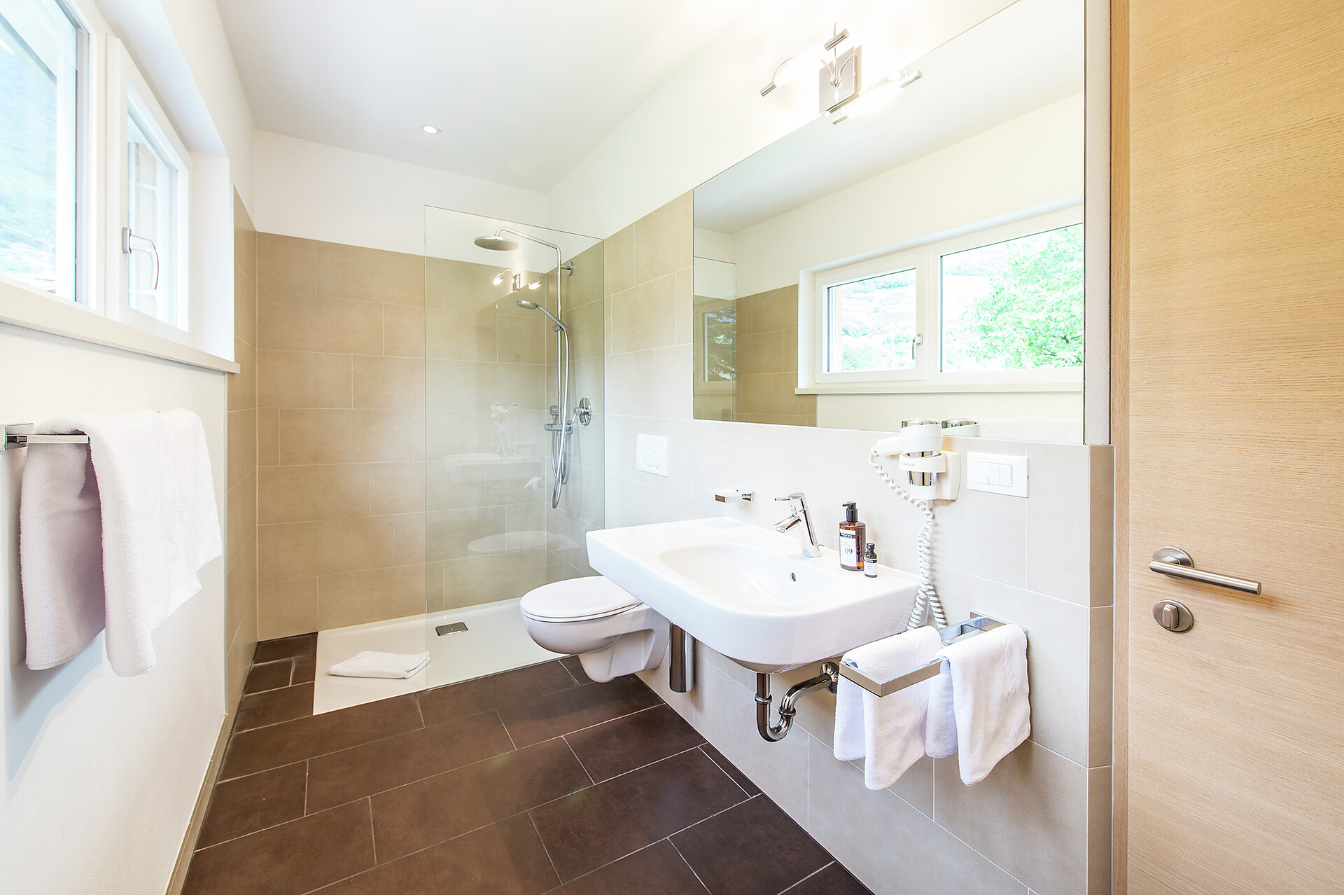 Nuova Suite per 2 - 3 persone con un grande bagno con doccia a pioggia, e letti con doghe a molle, pavimento in legno, mobili di legno di quercia, confortevole angolo tirolese, grande balcone .