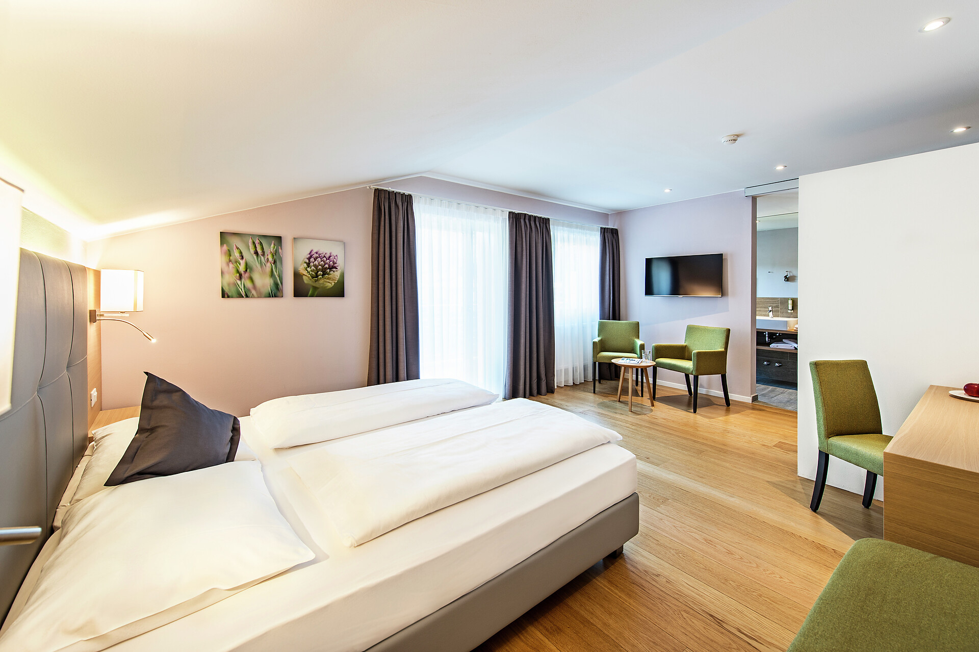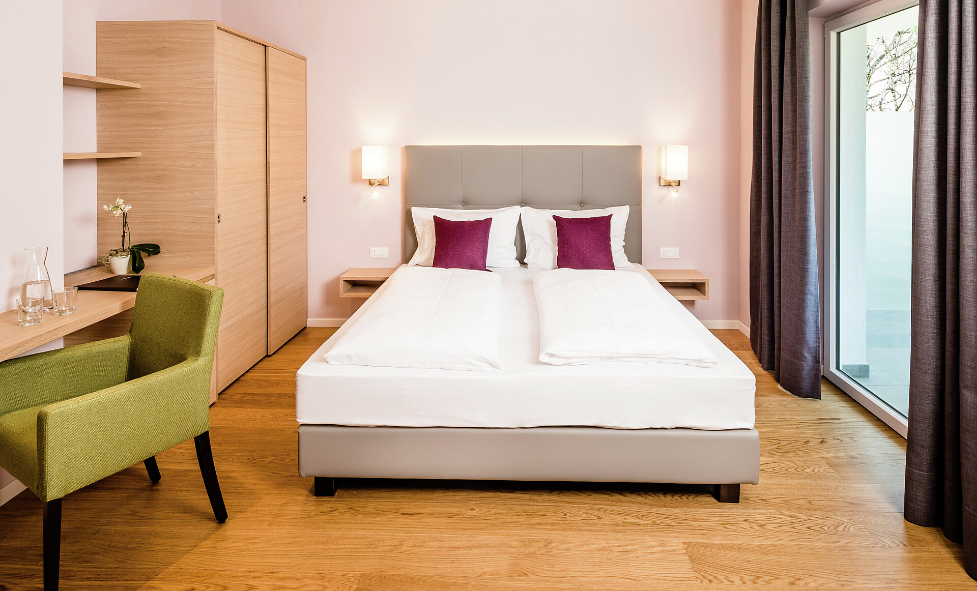 Nuova Juniorsuite con pavimento in legno e balcone grande verso sud.