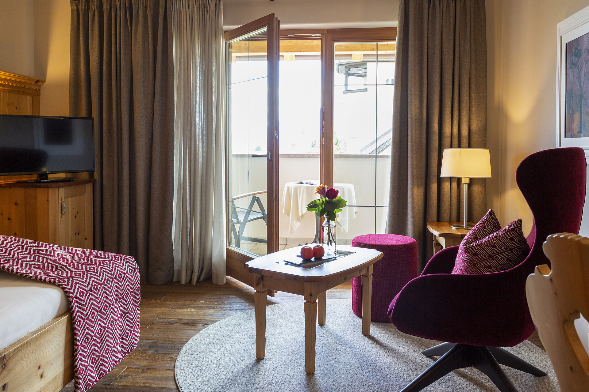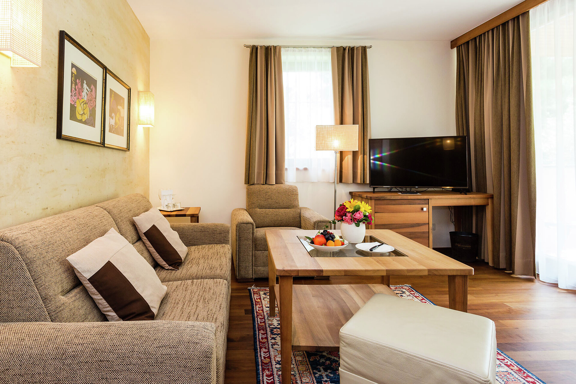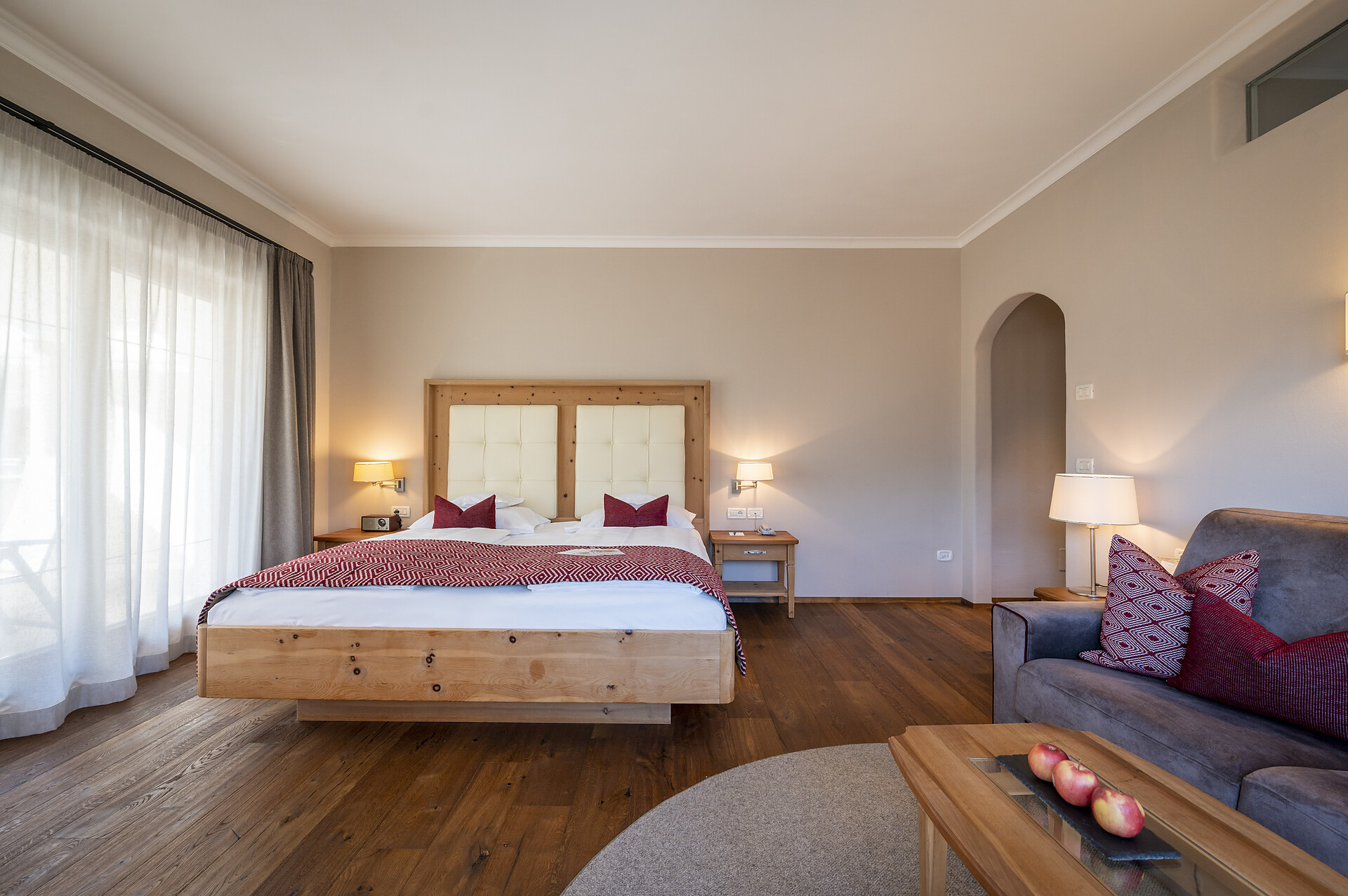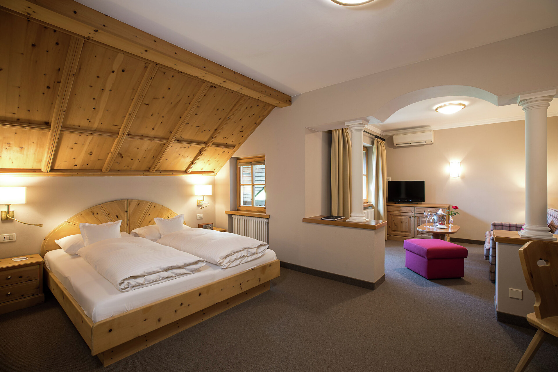 ca. 55 mq, sono arredate con pregiati mobili in legno di cembro e noce e sono adatte con ampio soggiorno, minibar, Flat-TV, W-lan, cassaforte, aria condizionata e dispongono di bagni in marmo con vasca/doccia/wc e balcone/terrazzo. Un posto nel garage é incluso. Quattro delle cinque lussuose Suite rose dispongono di una camera singola integrata.