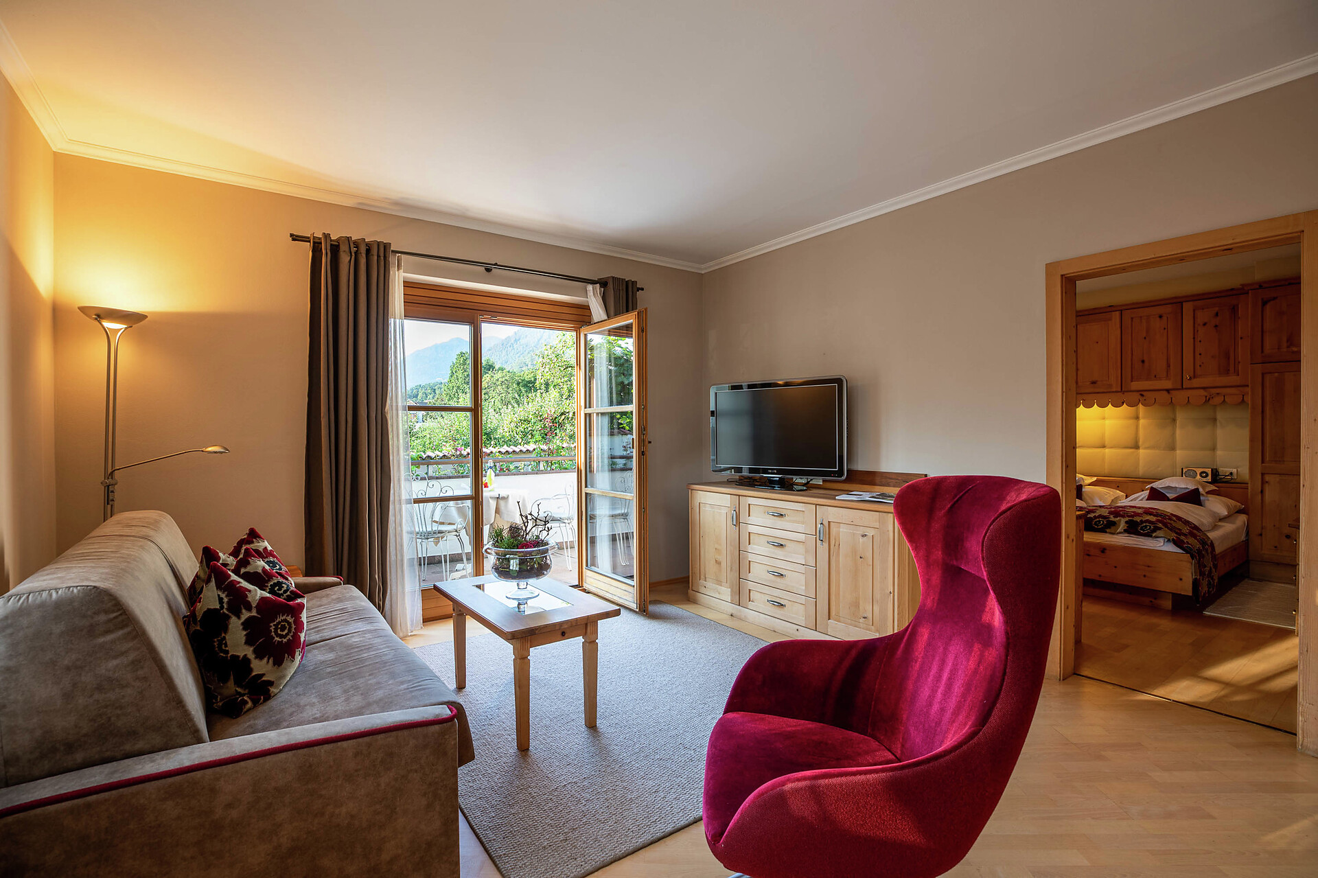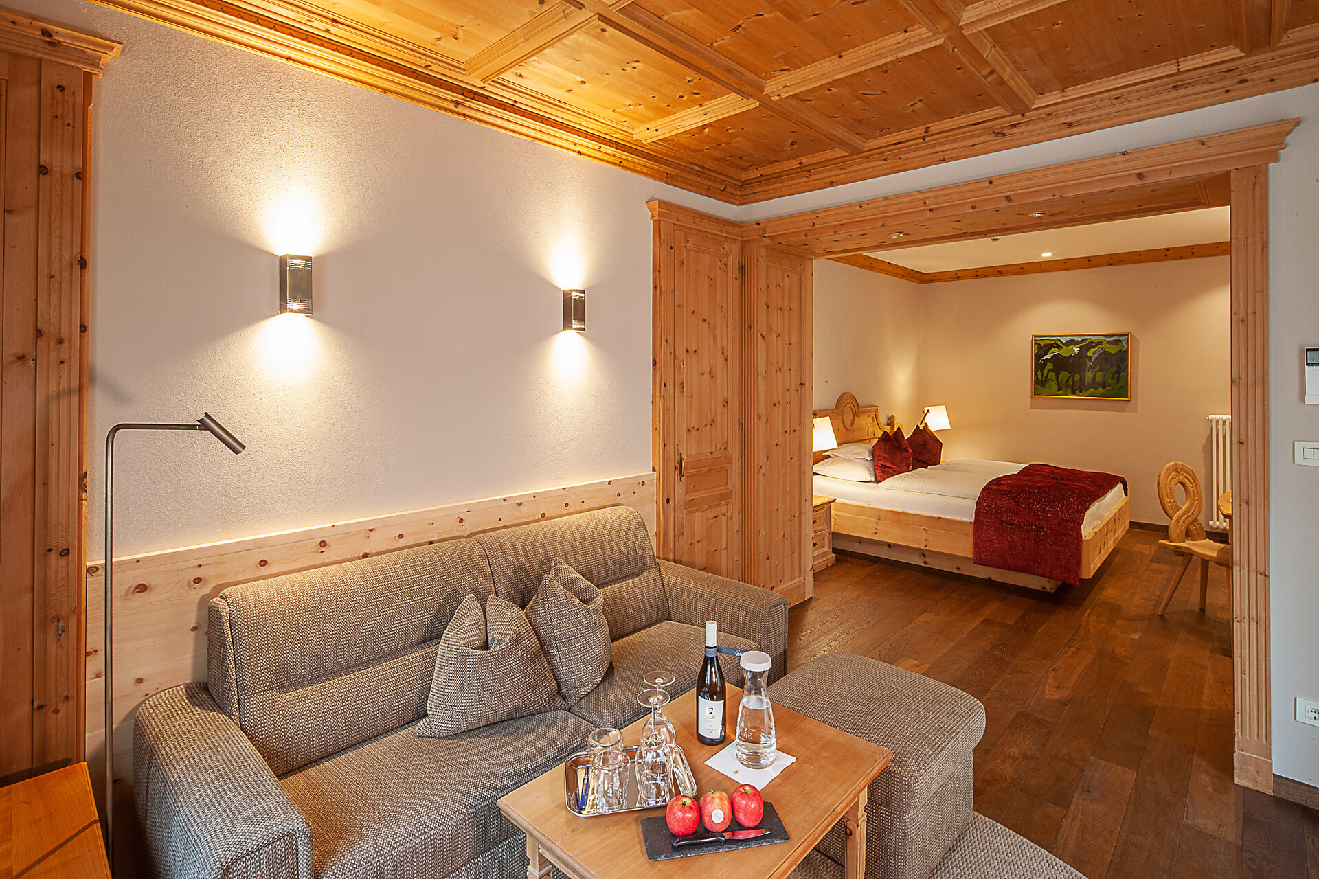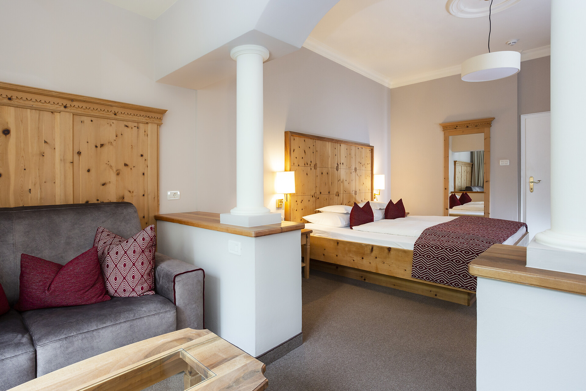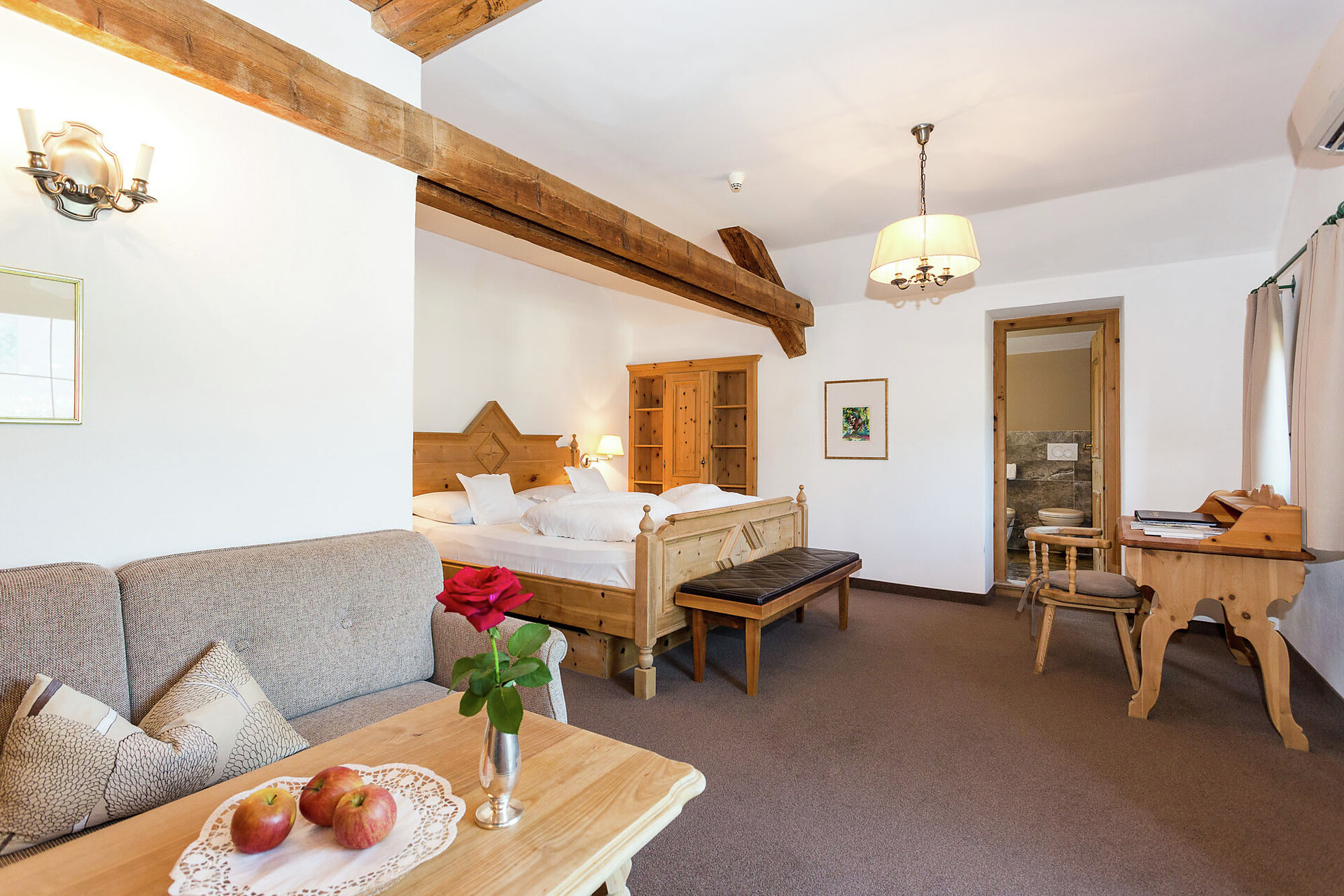 ca. 55 mq, sono arredate con pregiati mobili in legno di cembro e noce e sono adatte con ampio soggiorno, minibar, Flat-TV, W-lan, cassaforte, aria condizionata e dispongono di bagni in marmo con vasca/doccia/wc e balcone/terrazzo. Un posto nel garage é incluso. Quattro delle cinque lussuose Suite rose dispongono di una camera singola integrata.