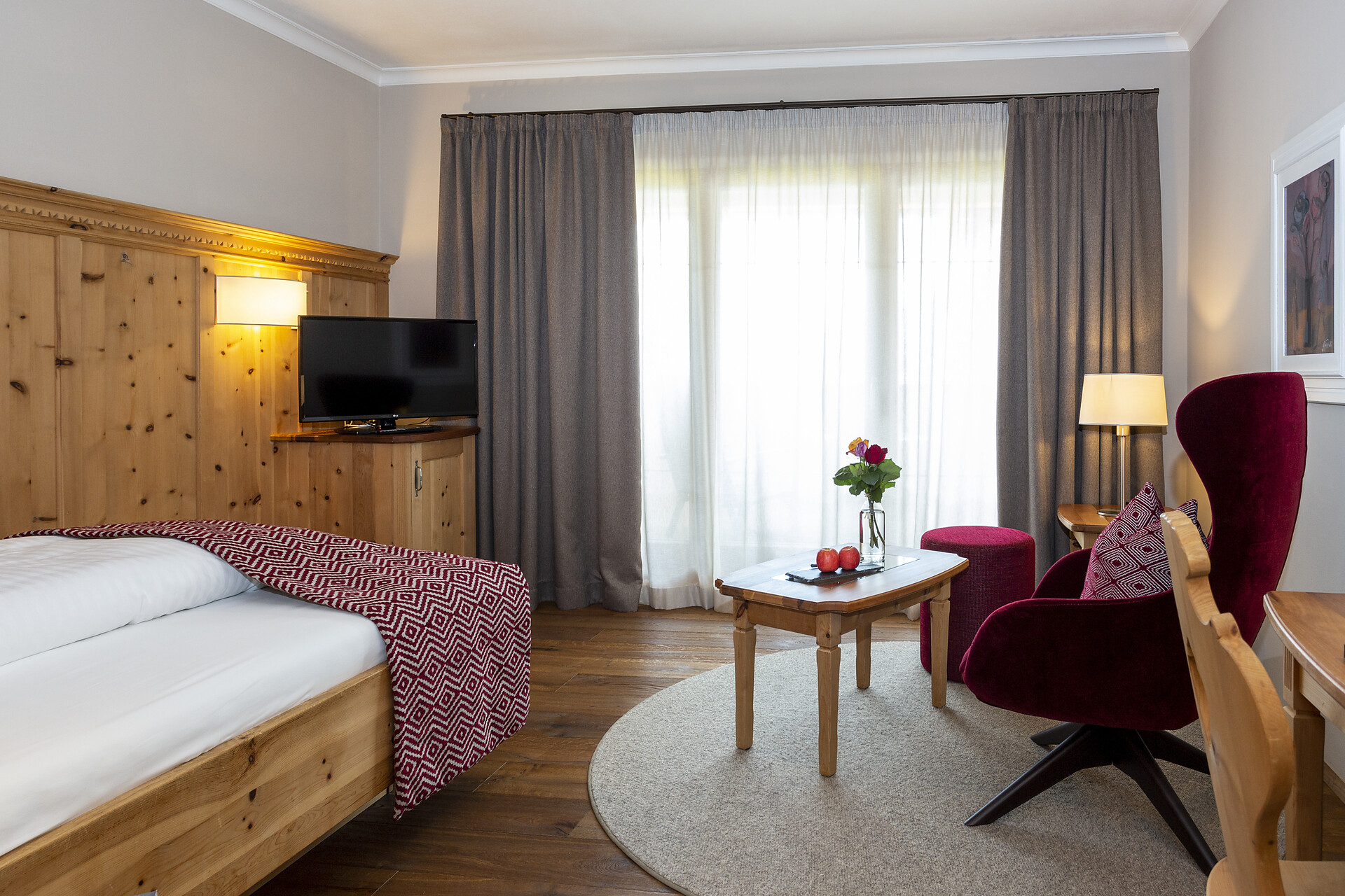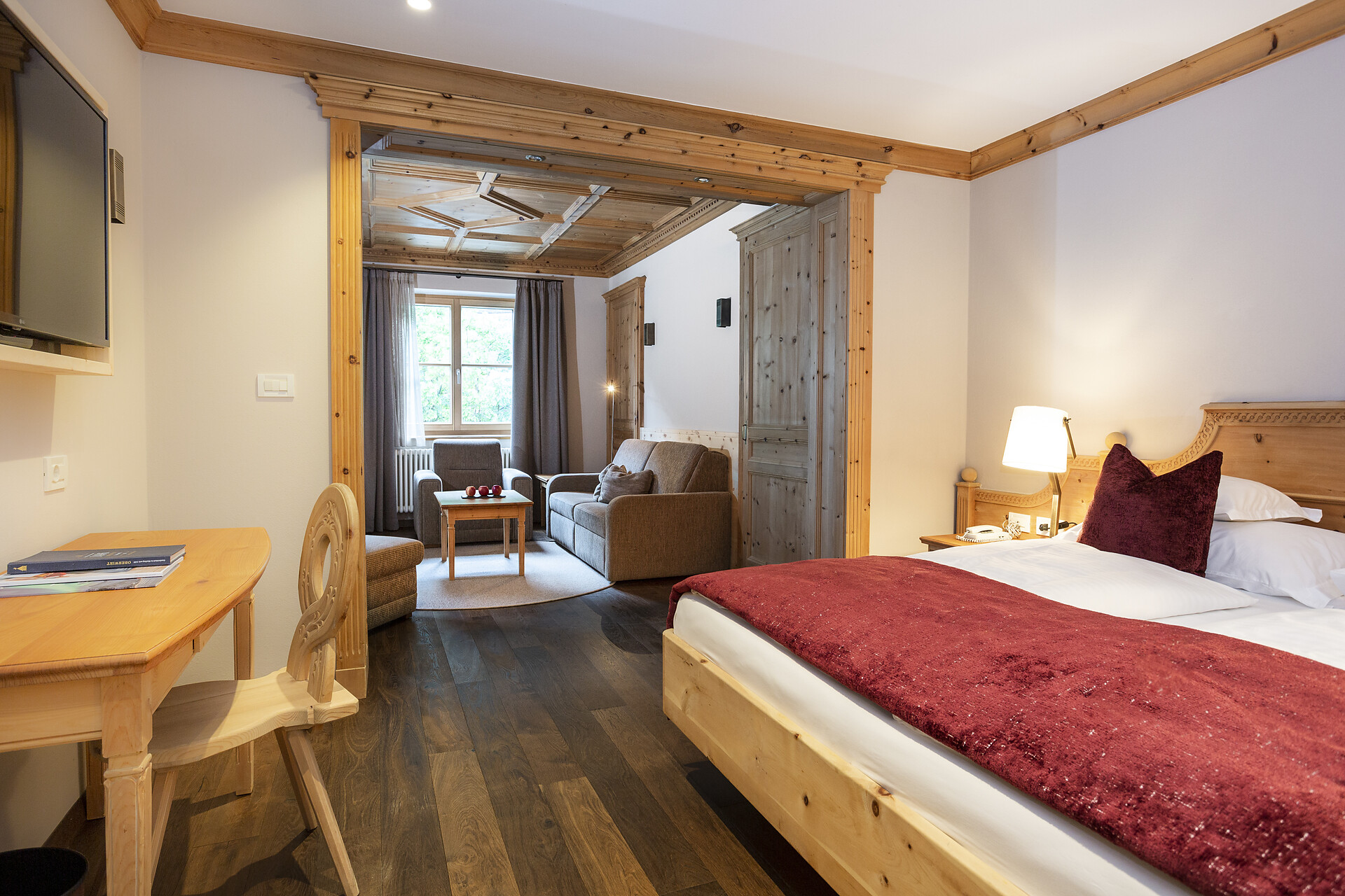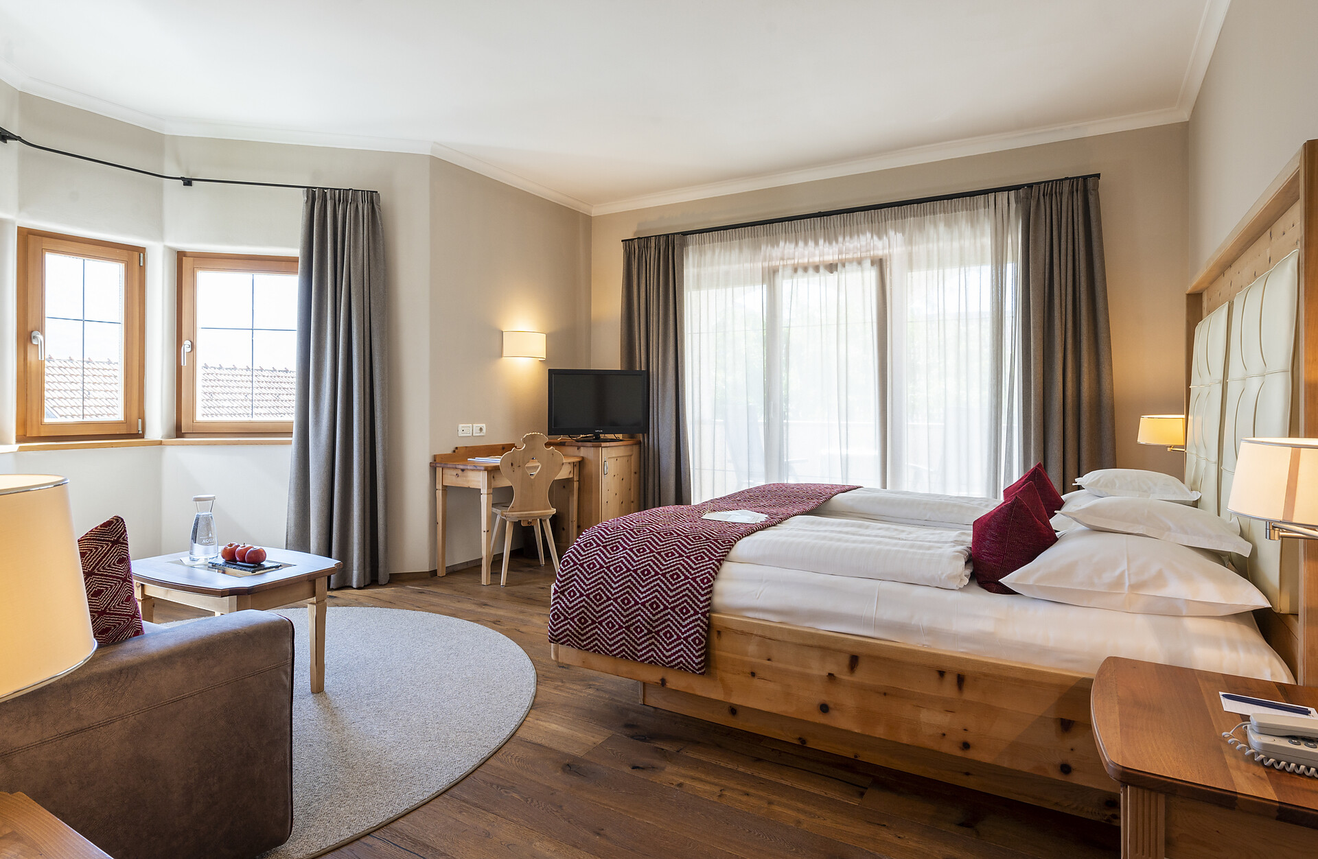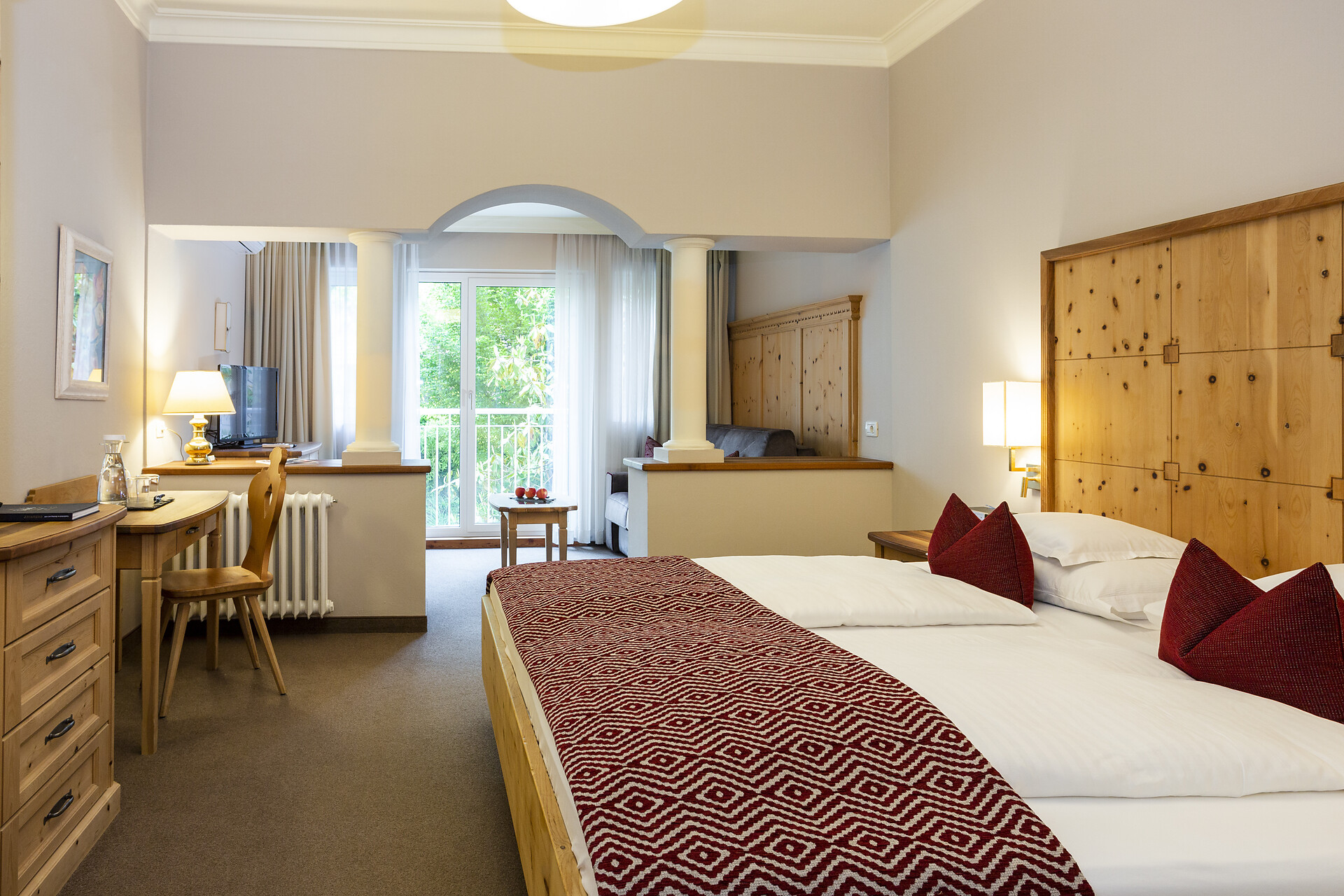 ca. 55 mq, sono arredate con pregiati mobili in legno di cembro e noce e sono adatte con ampio soggiorno, minibar, Flat-TV, W-lan, cassaforte, aria condizionata e dispongono di bagni in marmo con vasca/doccia/wc e balcone/terrazzo. Un posto nel garage é incluso. Quattro delle cinque lussuose Suite rose dispongono di una camera singola integrata.
