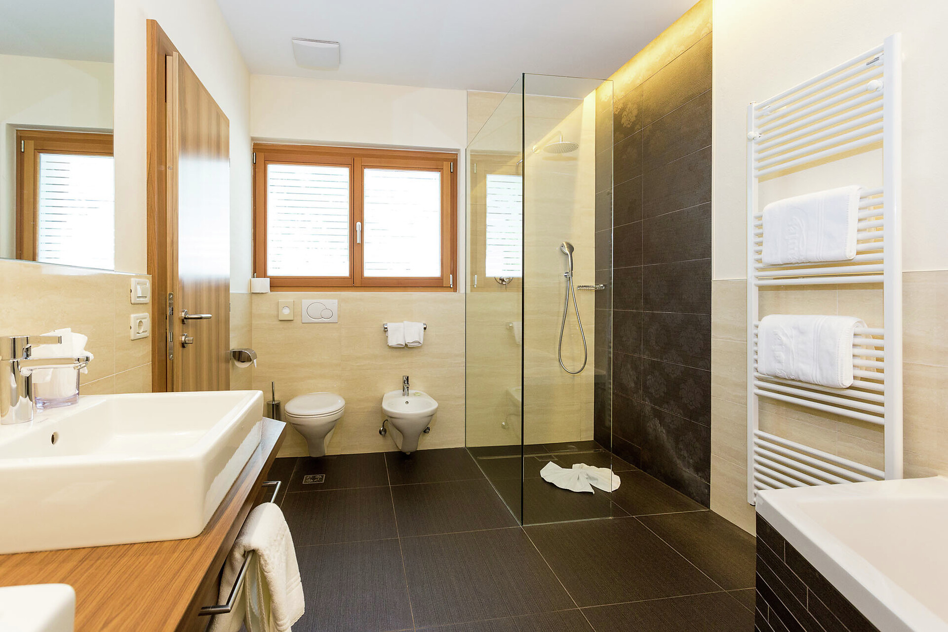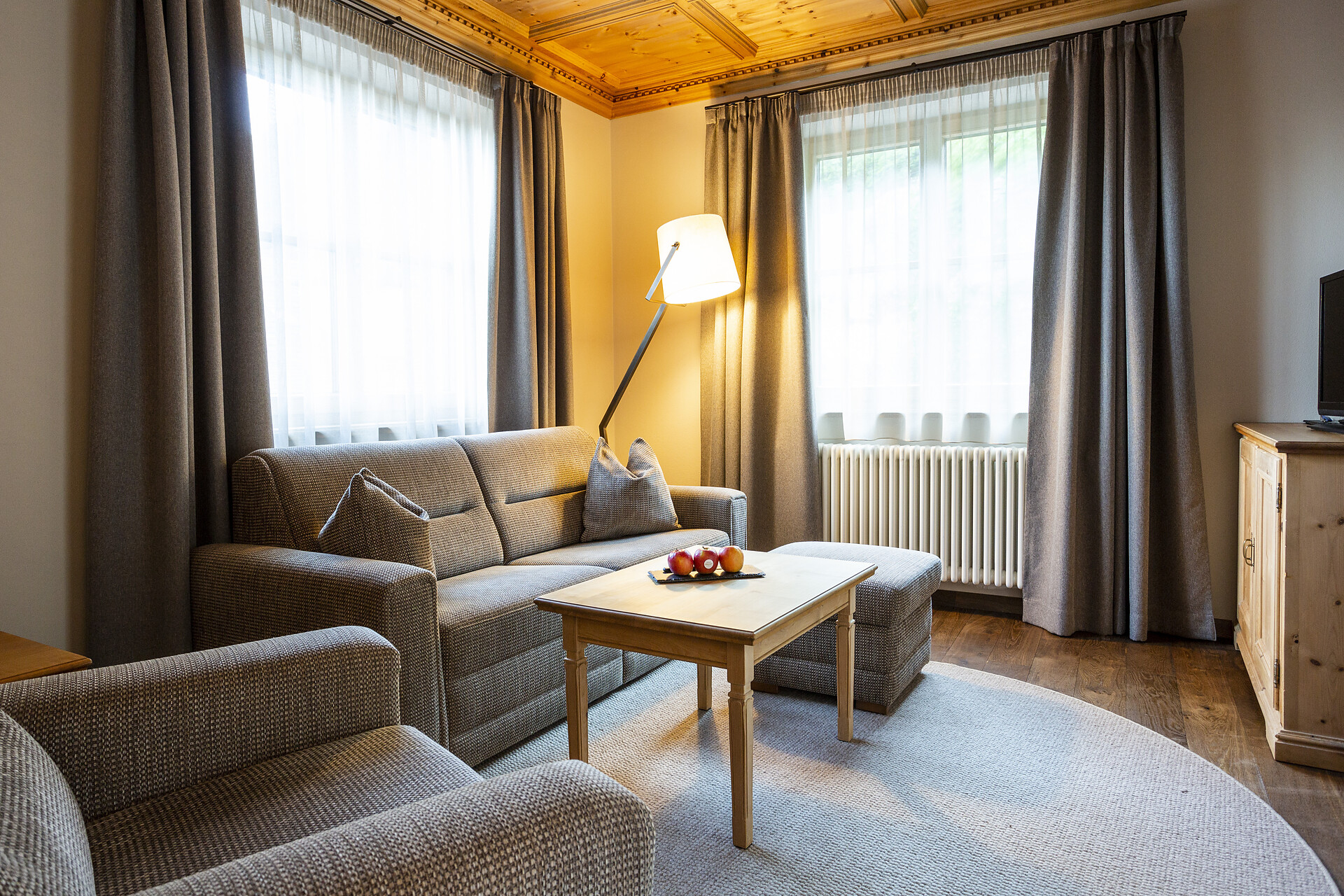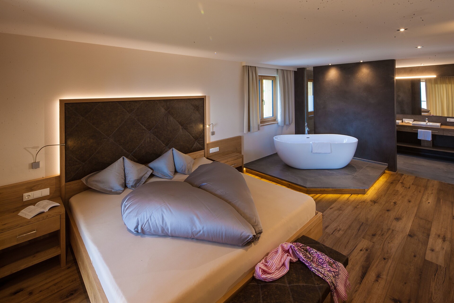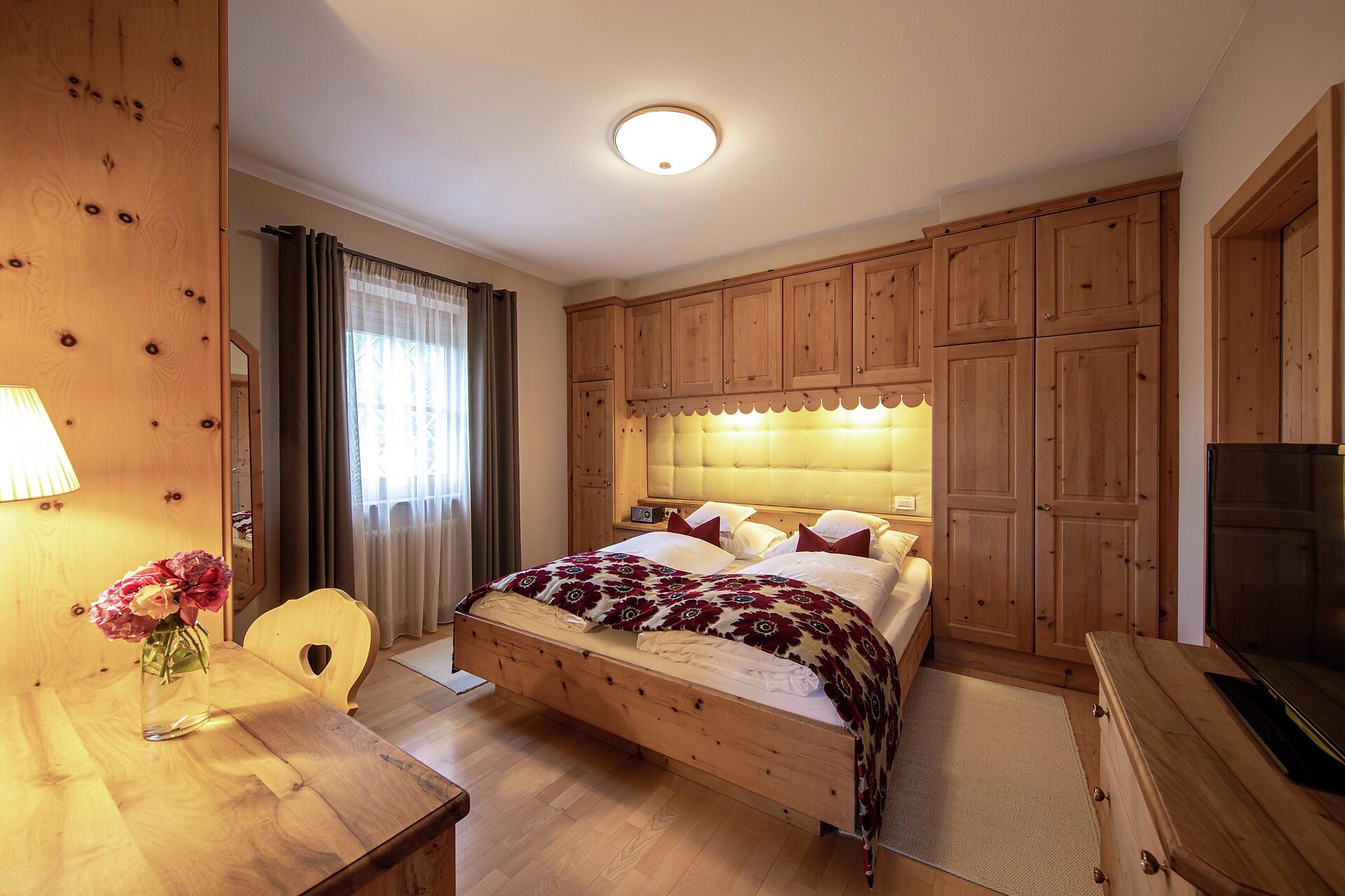 ca. 55 mq, sono arredate con pregiati mobili in legno di cembro e noce e sono adatte con ampio soggiorno, minibar, Flat-TV, W-lan, cassaforte, aria condizionata e dispongono di bagni in marmo con vasca/doccia/wc e balcone/terrazzo. Un posto nel garage é incluso. Quattro delle cinque lussuose Suite rose dispongono di una camera singola integrata.