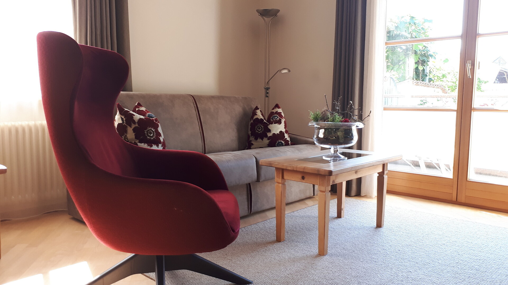 ca. 43 mq, con soggiorno e camera da letto separati, un bel terrazzo molto tranquillo, bagno con doccia/WC, non é collegato direttamente alla casa principale ne col centro benessere