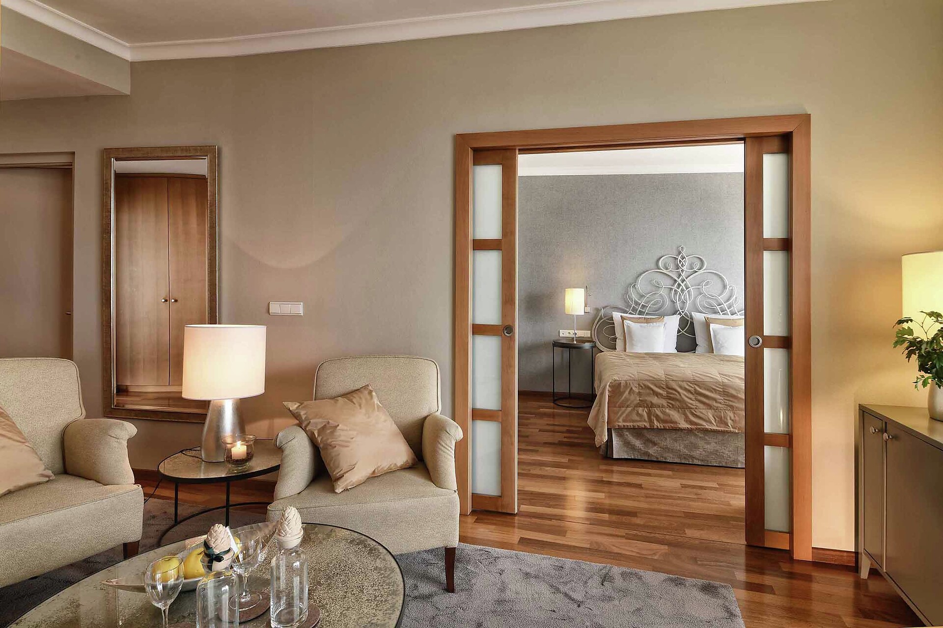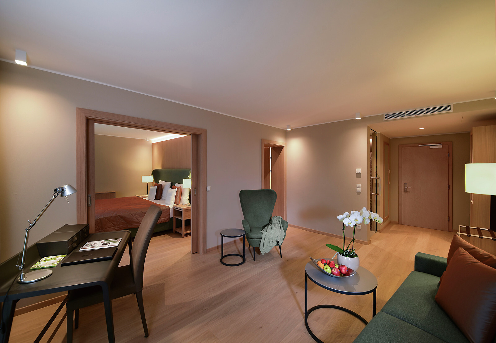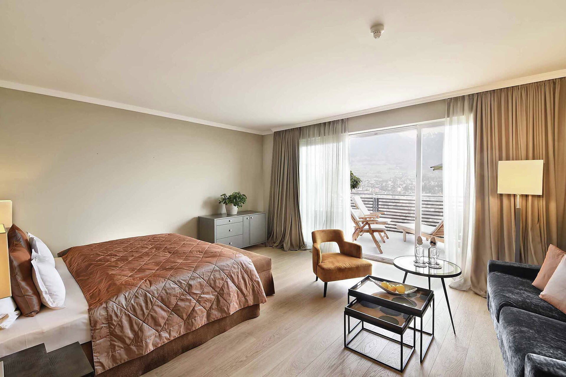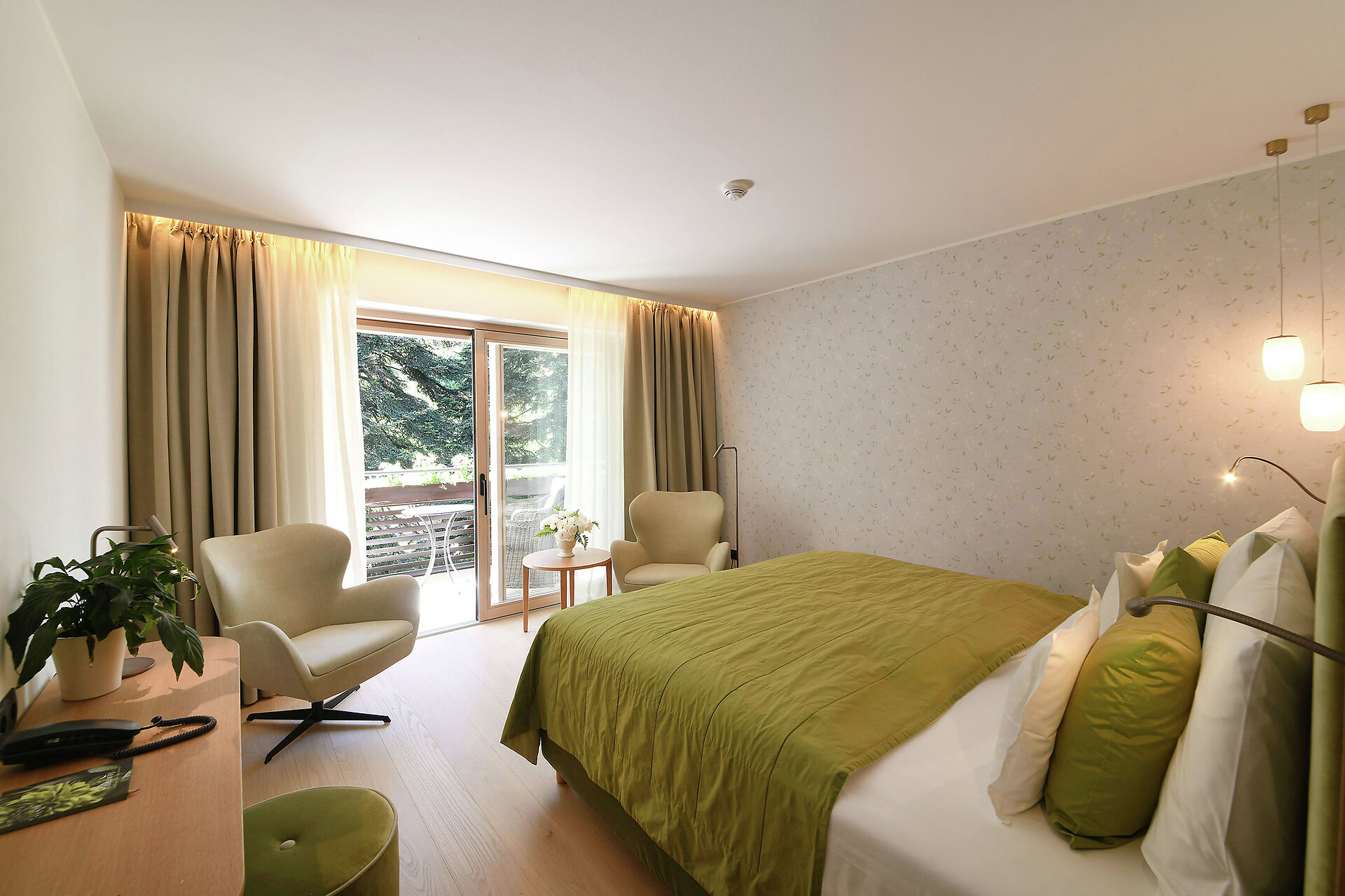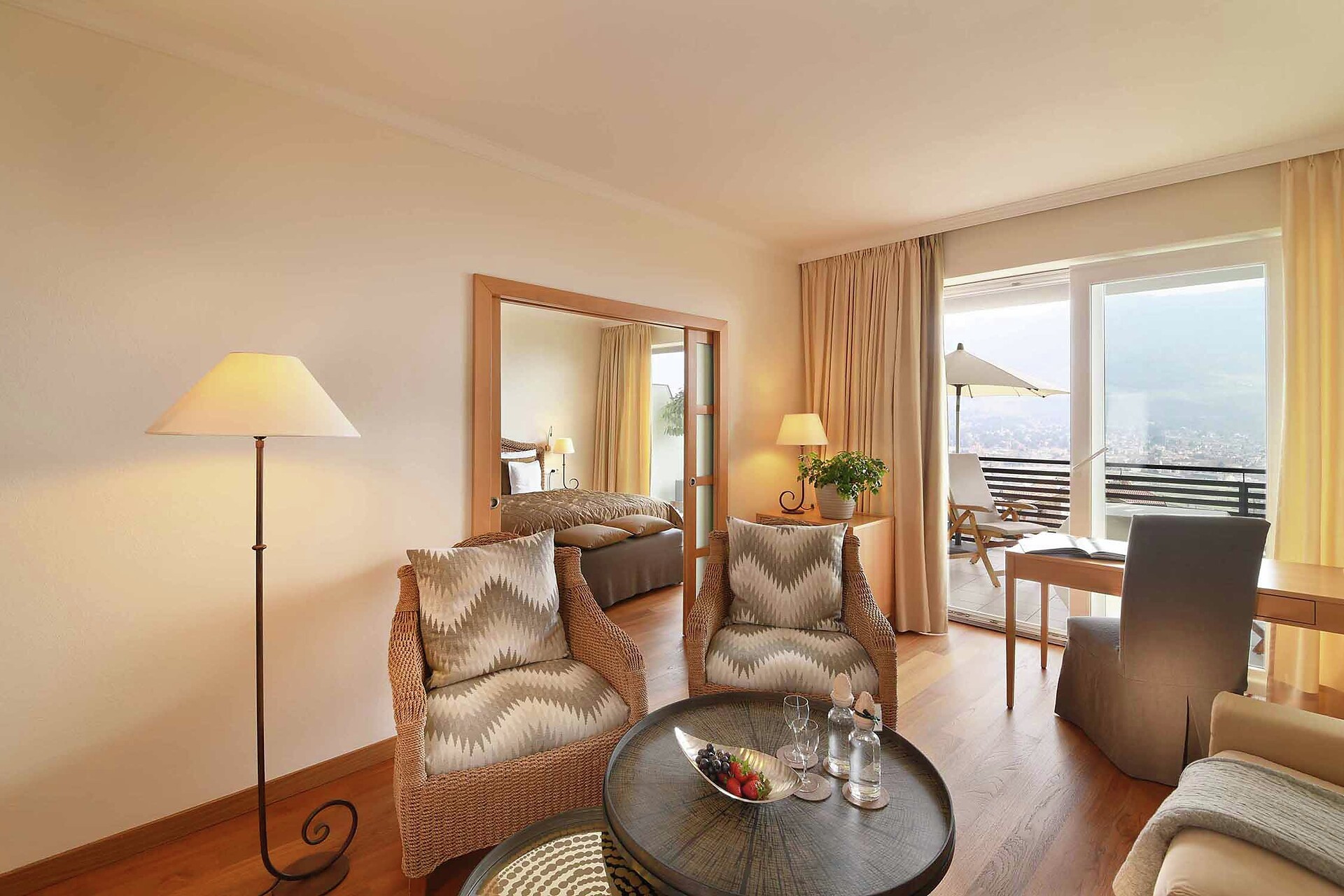 con salottino e stanza da letto separati, grande balcone con vista su Merano, vasca e doccia oppure solo doccia, WC separato, pavimento in legno, due TV satellitari, Internet wireless, radio, telefono, minibar, cassaforte e climatizzatore
