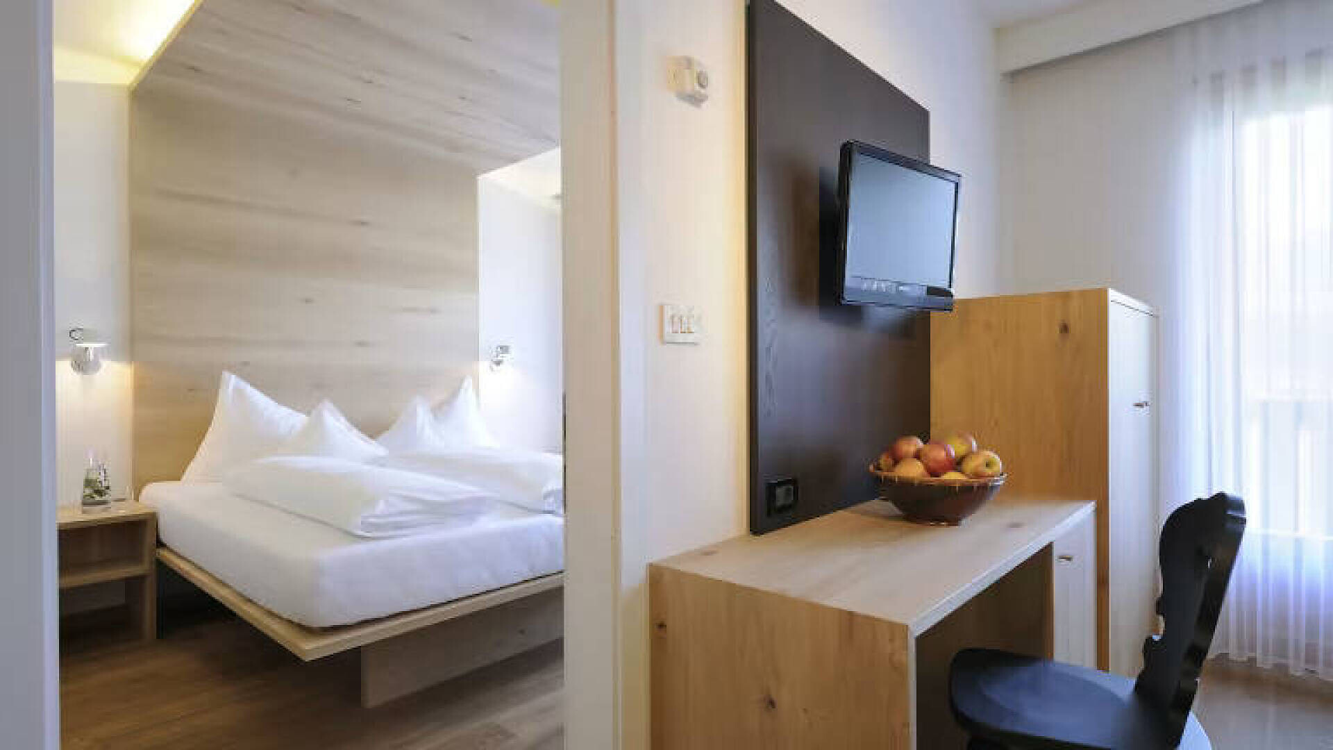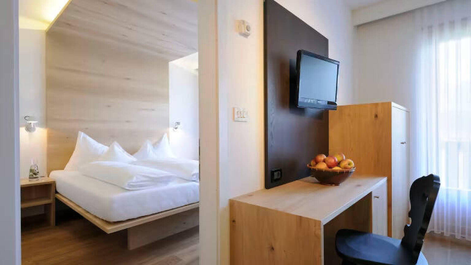 ROMANTICISMO CON VISTA L'hotel è un moderno purista dal design naturale, ma allo stesso tempo caldo e accogliente: qui vi sentirete subito a casa. Da comode poltrone o dal balcone si gode di una vista panoramica da sogno sulle montagne dell'Alto Adige, sulla città termale di Merano, sui nostri meleti e sull'ampio cielo che si estende all'orizzonte. Nell'anticamera della camera doppia c'è una terza possibilità di dormire, un po' più stretta (1,80x0,75 m).- Adatto a chi soffre di allergie- Sistema di climatizzazione FACS: aria fresca a temperatura controllata al 100%, silenziosa e senza correnti d'aria.- Pavimento in legno di quercia- Anticamera separata da una porta con 1 letto (1,80m x 0,75m) - Bagno moderno con doccia, WC separato, asciugacapelli, specchio per il trucco- TV SATELLITARE - Frigorifero (non riempito)SERVIZI PAZEIDER INCLUSI:- WLAN- Accappatoio e pantofole in spugna dell'hotel- Acqua potabile al fluoro della sorgente Pazeider da imbottigliare autonomamente